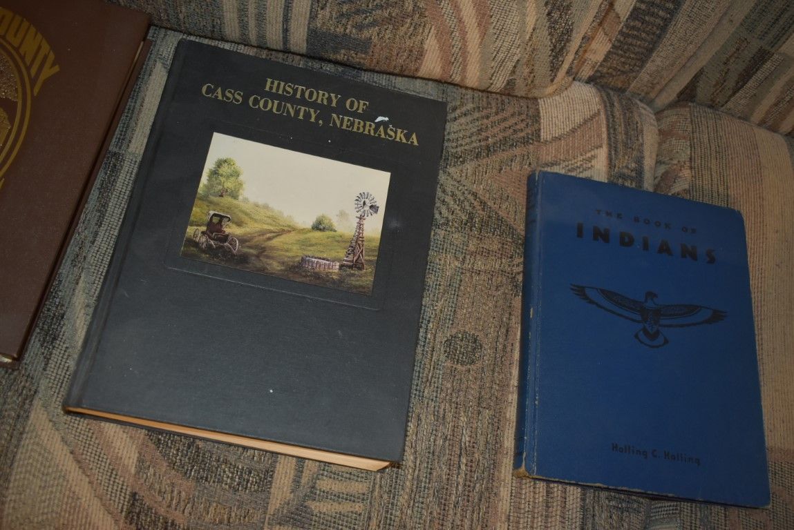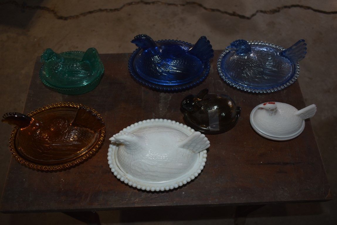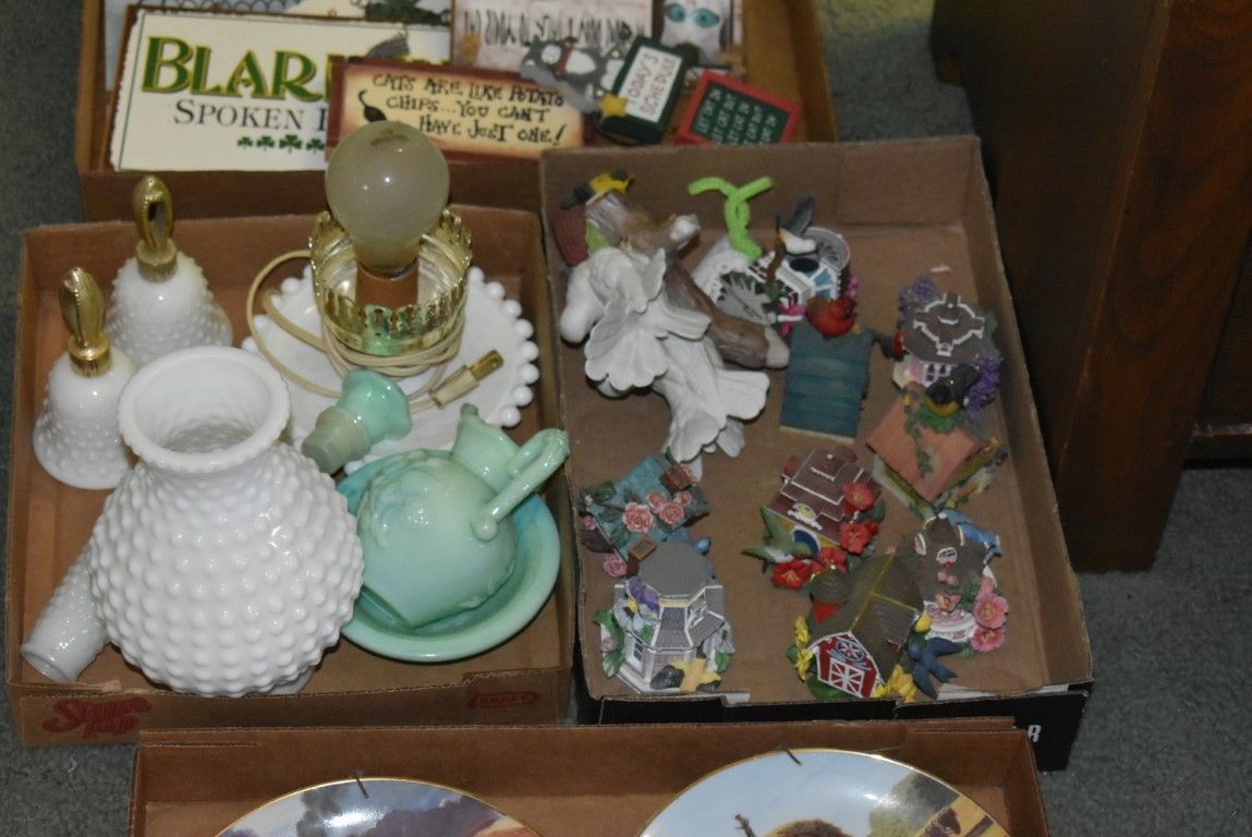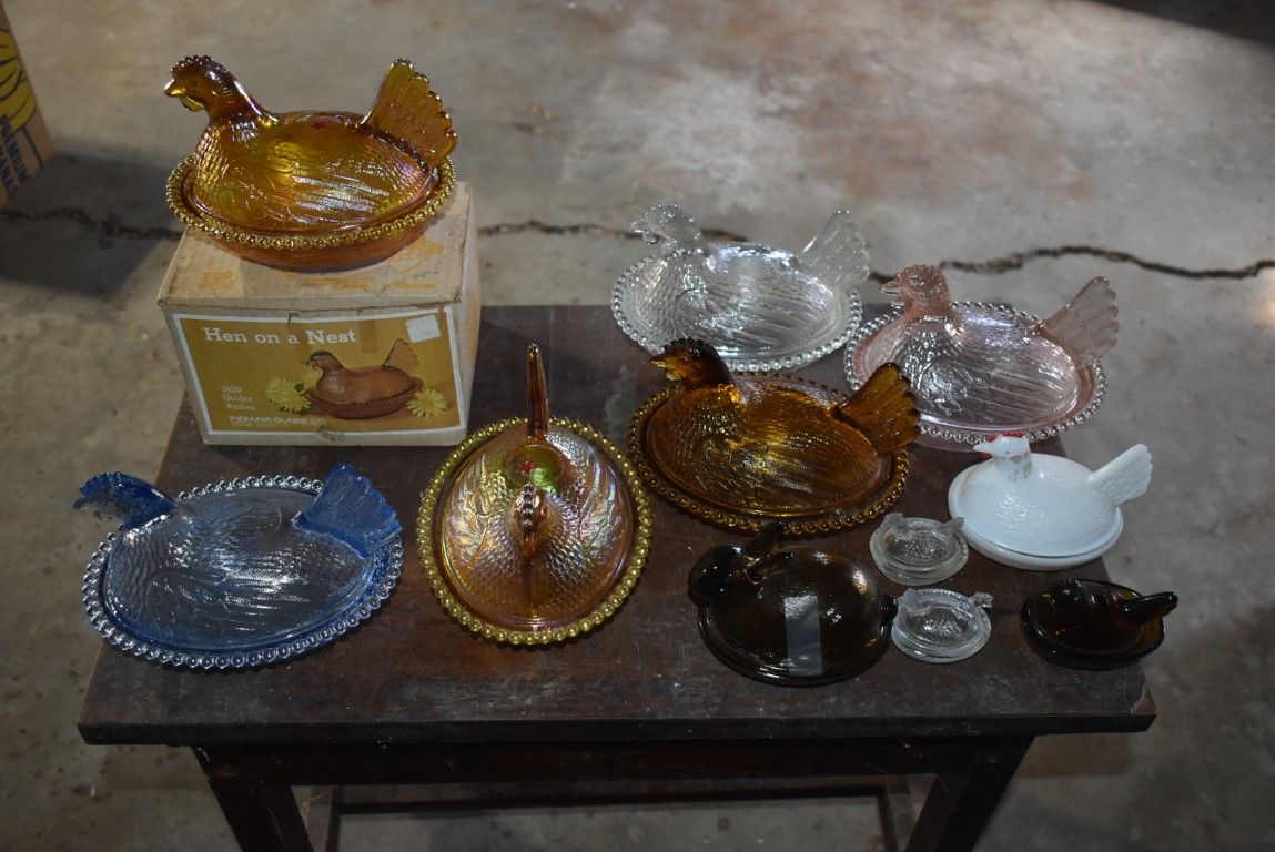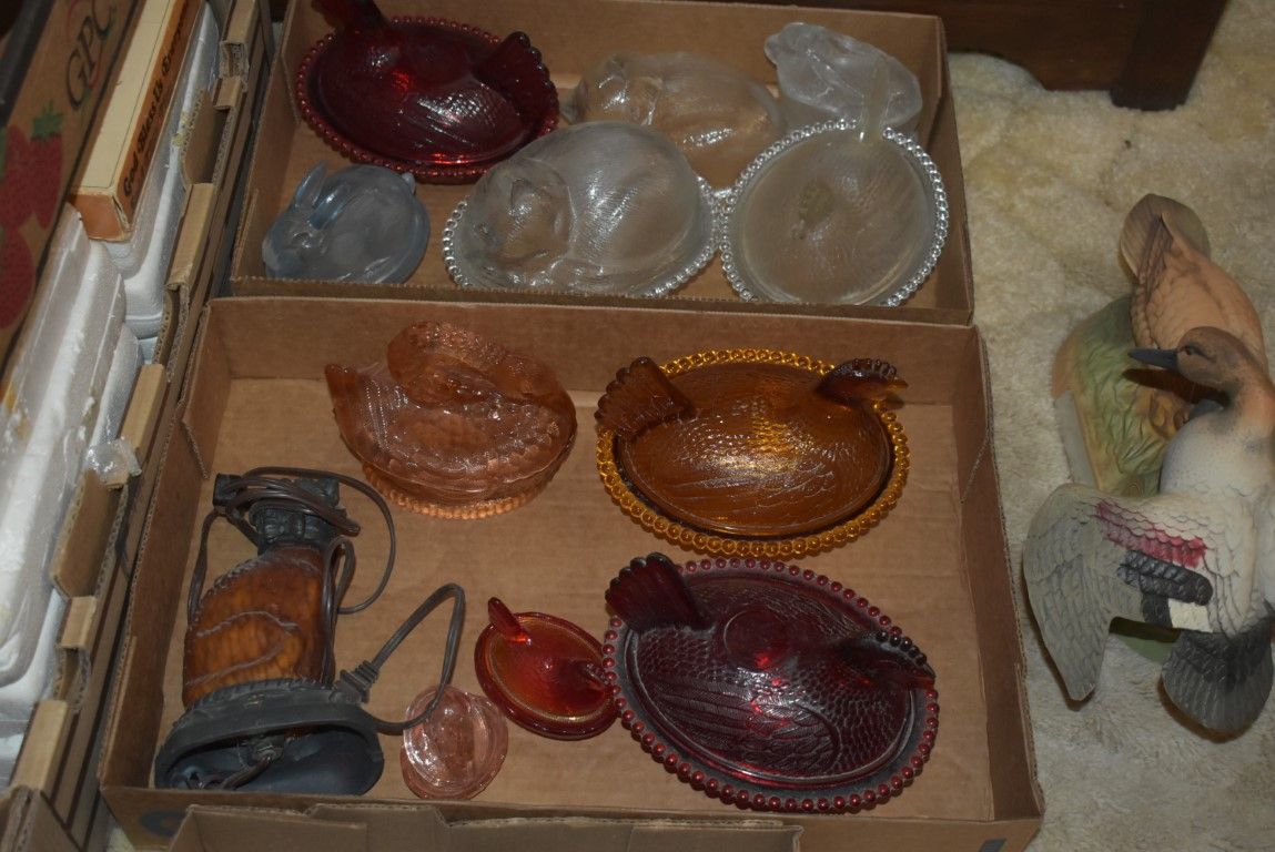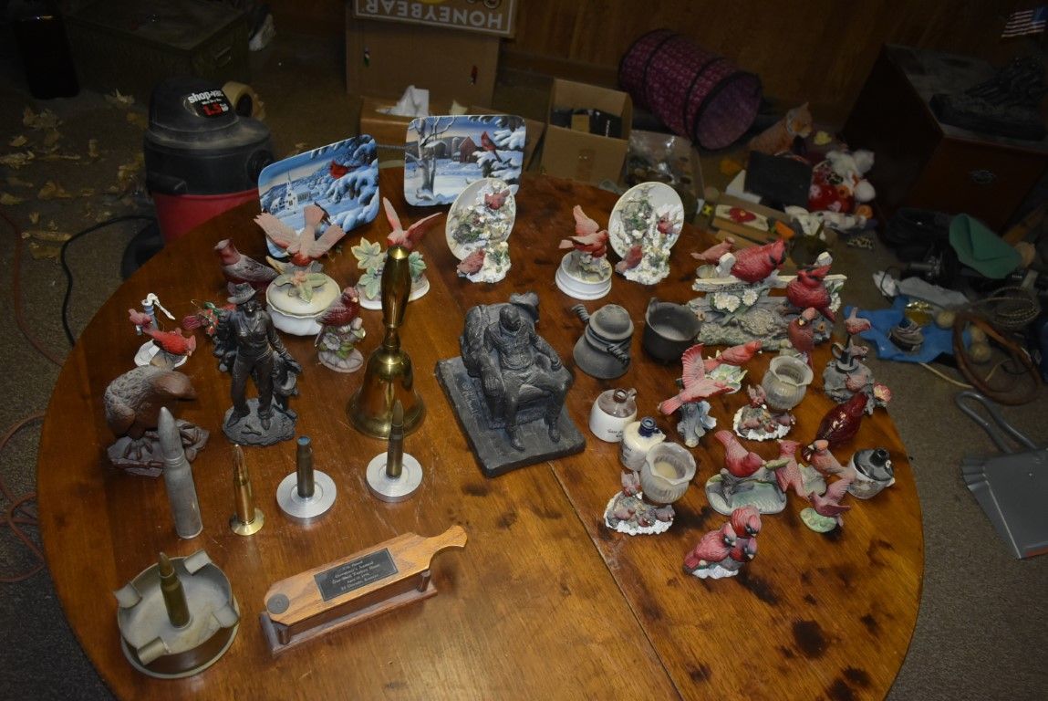 Glassware-Household-Misc: USA Vase, lots of Frankoma glassware comma, Arner’s pitcher and wash basin, 7 Avon Fostoria George Washington cobalt blue goblets, blue cobalt glass measuring pitcher, 2 vintage blue cobalt glass violin bottles, several other cobalt blue glass items, Antique Rayo oil lamp little plated brass, Ruby red glass Fenton collection, Lots of Wall Hangings/decorations, Several hen candy dishes, several mini hen candy dishes, glass rooster, the glass butter dish, vintage Murano art glass vases, 10+ Beam whiskey decanters, Gold 15” Elvis decanter, Edwin Knowles China pitcher and bowl set, large collection of Cardinal birds, 13 albums of gold replicas of stamps (5 are Golden Replicas of US stamps), Tapestry Wall picture, Wall mounted kerosene lamp, hanging elephants wall chime, , Ansonia gingerbread parlor clock 22T x 14w, Wall mirror 52 by 20, old Last Supper picture, Ornate wall mirror 17Wx33T, 45 inch round table needs repair, Large wood framed mirror 45x36, Gold framed wall mirror with shelves 27x23x5, ENC Comet laser range finder, Two Clay County heritage books 1990, history of Cass County Nebraska book 1989, The book of Cowboys, The book of Indians, two orange/black Clay Center high school yearbooks 1914 and 1922, Tiger yearbook 1942, large 50 years of movie posters book 1911 to 1955, wooden magazine racks, 1989 art mark cast iron doorstop, miscellaneous cookbooks, clear glass cat candy dish, Seth Thomas wind up wall clock, brass standing floor lamp, large wall mirror with three panels 54 long by 12 1/2, Lefton cardinal wall decoration, child's tea set, 9 thimble sets in shadow boxes, 2 Thoven Music boxes made in Switzerland, Warlock metal door stop, set of Louis L’Amour hardback books (120), Puzzles, Christmas Books, Vintage come brush mirror set, double globe hurricane lamp pink rose, gold framed mirror, shark vacuum sweeper, cast cross w/candle holder, Lots of misc costume jewelry, RR lantern, Harvest Storm combine picture, Lots of Christmas decorations, porcelain dolls, several pedestal fans, Cast 26 inch pump Jack, anodized aluminum teapot, ninja pressure cooker, Keurig coffee Brewer, lots of stoneware dishes, lots of cooking utensils, set of USA bowls, Set of four cracker barrel stoneware with cardinal design, rival crock pot, malt blender, Over 40 Nutcrackers, Lots of pictures, Lots of bedding and quilts, 50” flat screen TV, Turkey call hint annual governors annual one shot Turkey hunt April 13 1996, victory key lock safe, round wood table 4 foot diameter 21 inches tall, square dinner table with round corners 42 by 42, doing pool lots of collectible plates, Kriss Kross stropper and razor device, Dozens of collectible glass eggs, 50th anniversary D-Day zippo lighter, white clay tobacco pipe, marble swan set, new Wentzel Dutch oven, new cast iron skillets, cast iron cookware wood box, Wood ammo box, Wood upright storage cabinet 68x19x13, Shadow box w/Indian figurines, set of honing rods, Old sharpening stones, Mahjong Set in case, 3 JD steins, Sylvester cookie jar, Chess Game table 28x28, 55” flat screen TV, 4 dr metal file cabinet, 2 Dr. wood file cabinet, several kerosene lanterns, electric stove heater, antique table, round end table, diameter, can of canes and walking sticks, Brass spit tunes, raising the flag at Iwo jima sculpture, , China glassware, set of nun chucks, Bucket of lead weights, Variety of wood crates, Wood clamps, Misc fishing poles, They were antique metal ammo boxes, metal pink high chair, animal leg traps, Misc shoe repair items, 8’ stock tank, water hoses, Pile a rough cut lumber approximately 30 feet long, miscellaneous yard art, six or more large canners, yard sundial freestanding, Various outdoor flower pots, a pair of brass goblets, carnival glass dishes, mining boxes say 40 fuse on side, old trunks, cheese boxes, Many more items to unbox.