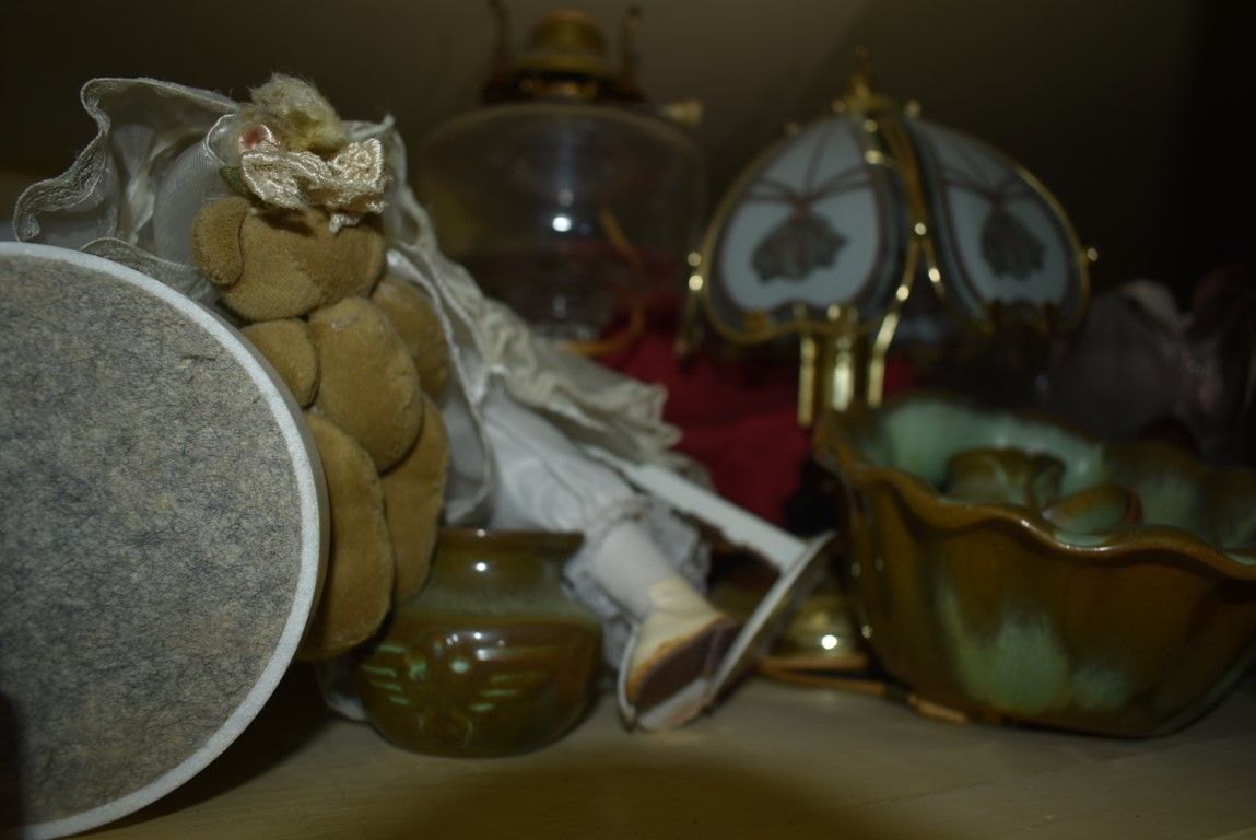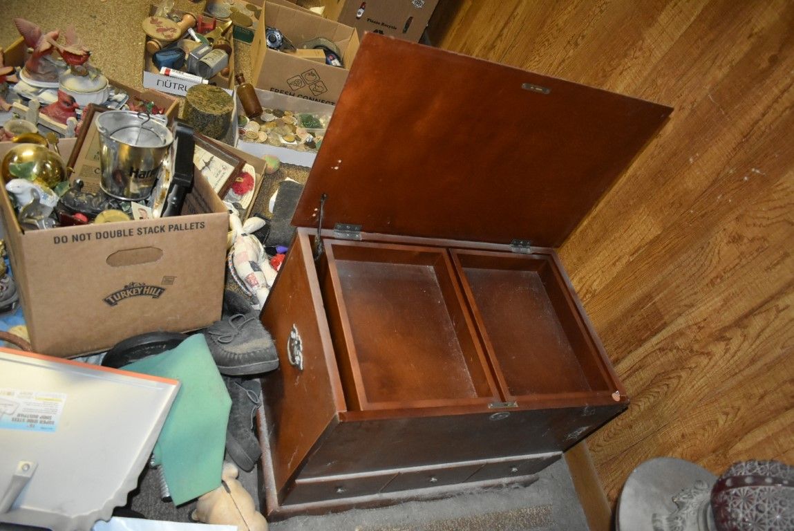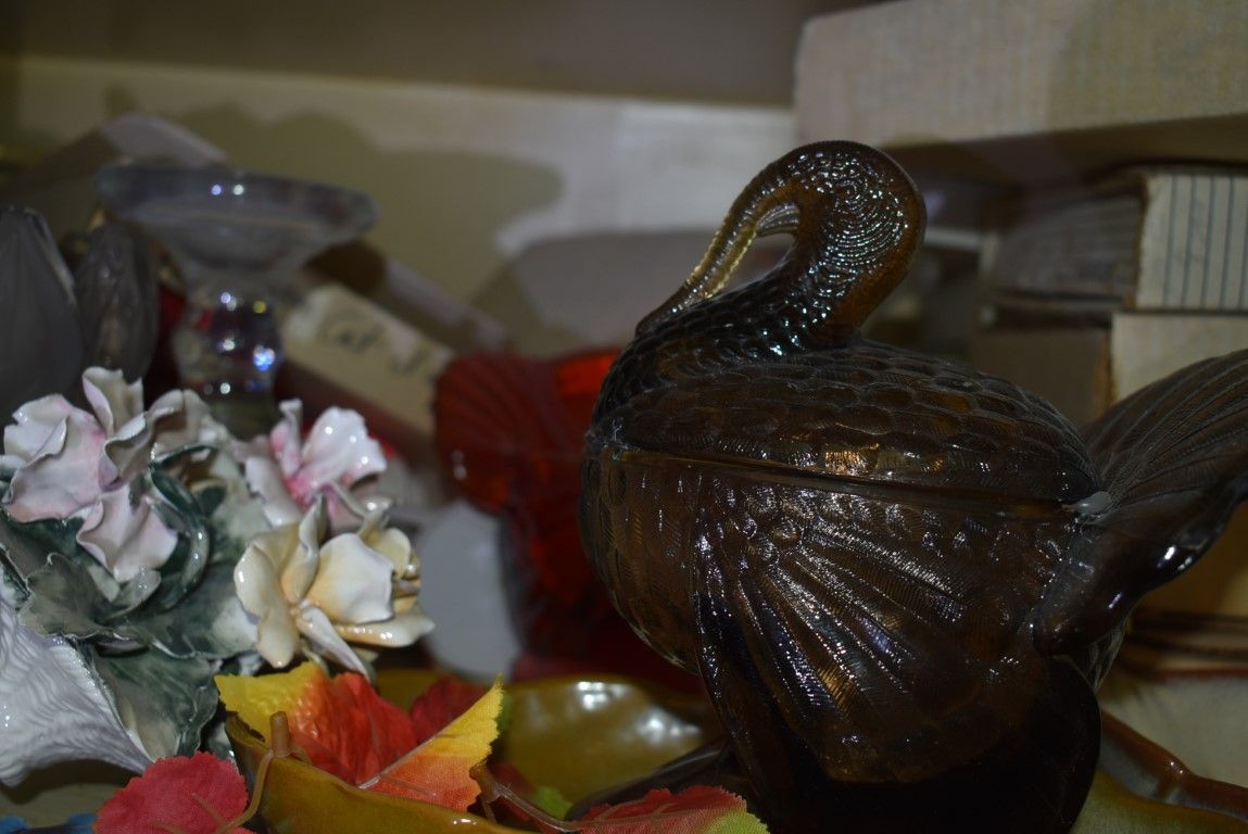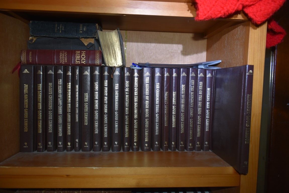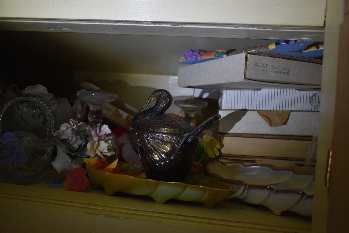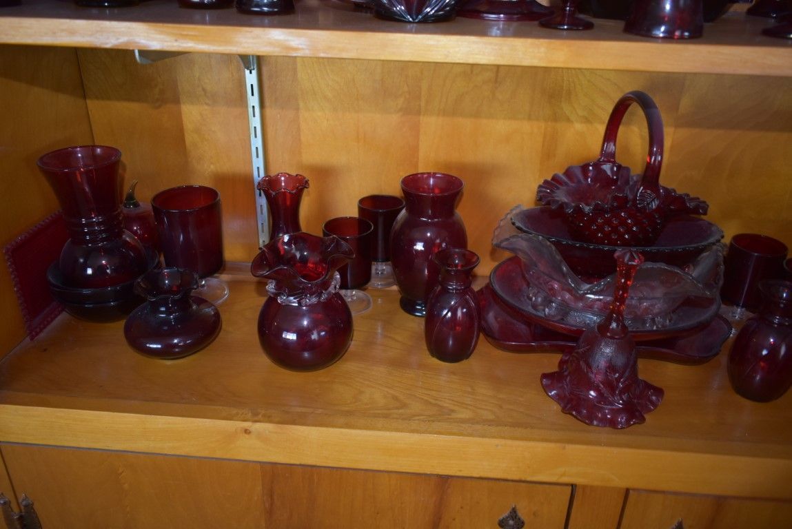 Glassware-Household-Misc: USA Vase, lots of Frankoma glassware comma, Arner’s pitcher and wash basin, 7 Avon Fostoria George Washington cobalt blue goblets, blue cobalt glass measuring pitcher, 2 vintage blue cobalt glass violin bottles, several other cobalt blue glass items, Antique Rayo oil lamp little plated brass, Ruby red glass Fenton collection, Lots of Wall Hangings/decorations, Several hen candy dishes, several mini hen candy dishes, glass rooster, the glass butter dish, vintage Murano art glass vases, 10+ Beam whiskey decanters, Gold 15” Elvis decanter, Edwin Knowles China pitcher and bowl set, large collection of Cardinal birds, 13 albums of gold replicas of stamps (5 are Golden Replicas of US stamps), Tapestry Wall picture, Wall mounted kerosene lamp, hanging elephants wall chime, , Ansonia gingerbread parlor clock 22T x 14w, Wall mirror 52 by 20, old Last Supper picture, Ornate wall mirror 17Wx33T, 45 inch round table needs repair, Large wood framed mirror 45x36, Gold framed wall mirror with shelves 27x23x5, ENC Comet laser range finder, Two Clay County heritage books 1990, history of Cass County Nebraska book 1989, The book of Cowboys, The book of Indians, two orange/black Clay Center high school yearbooks 1914 and 1922, Tiger yearbook 1942, large 50 years of movie posters book 1911 to 1955, wooden magazine racks, 1989 art mark cast iron doorstop, miscellaneous cookbooks, clear glass cat candy dish, Seth Thomas wind up wall clock, brass standing floor lamp, large wall mirror with three panels 54 long by 12 1/2, Lefton cardinal wall decoration, child's tea set, 9 thimble sets in shadow boxes, 2 Thoven Music boxes made in Switzerland, Warlock metal door stop, set of Louis L’Amour hardback books (120), Puzzles, Christmas Books, Vintage come brush mirror set, double globe hurricane lamp pink rose, gold framed mirror, shark vacuum sweeper, cast cross w/candle holder, Lots of misc costume jewelry, RR lantern, Harvest Storm combine picture, Lots of Christmas decorations, porcelain dolls, several pedestal fans, Cast 26 inch pump Jack, anodized aluminum teapot, ninja pressure cooker, Keurig coffee Brewer, lots of stoneware dishes, lots of cooking utensils, set of USA bowls, Set of four cracker barrel stoneware with cardinal design, rival crock pot, malt blender, Over 40 Nutcrackers, Lots of pictures, Lots of bedding and quilts, 50” flat screen TV, Turkey call hint annual governors annual one shot Turkey hunt April 13 1996, victory key lock safe, round wood table 4 foot diameter 21 inches tall, square dinner table with round corners 42 by 42, doing pool lots of collectible plates, Kriss Kross stropper and razor device, Dozens of collectible glass eggs, 50th anniversary D-Day zippo lighter, white clay tobacco pipe, marble swan set, new Wentzel Dutch oven, new cast iron skillets, cast iron cookware wood box, Wood ammo box, Wood upright storage cabinet 68x19x13, Shadow box w/Indian figurines, set of honing rods, Old sharpening stones, Mahjong Set in case, 3 JD steins, Sylvester cookie jar, Chess Game table 28x28, 55” flat screen TV, 4 dr metal file cabinet, 2 Dr. wood file cabinet, several kerosene lanterns, electric stove heater, antique table, round end table, diameter, can of canes and walking sticks, Brass spit tunes, raising the flag at Iwo jima sculpture, , China glassware, set of nun chucks, Bucket of lead weights, Variety of wood crates, Wood clamps, Misc fishing poles, They were antique metal ammo boxes, metal pink high chair, animal leg traps, Misc shoe repair items, 8’ stock tank, water hoses, Pile a rough cut lumber approximately 30 feet long, miscellaneous yard art, six or more large canners, yard sundial freestanding, Various outdoor flower pots, a pair of brass goblets, carnival glass dishes, mining boxes say 40 fuse on side, old trunks, cheese boxes, Many more items to unbox.