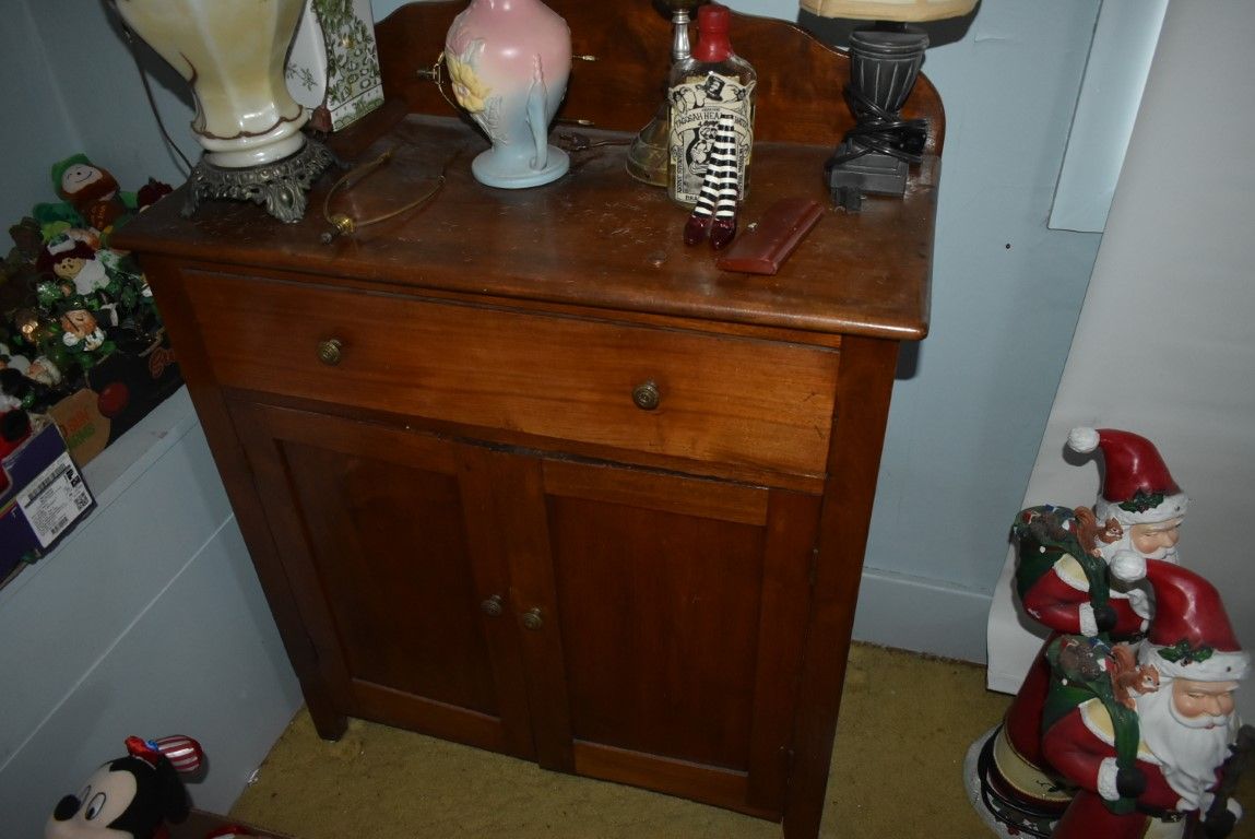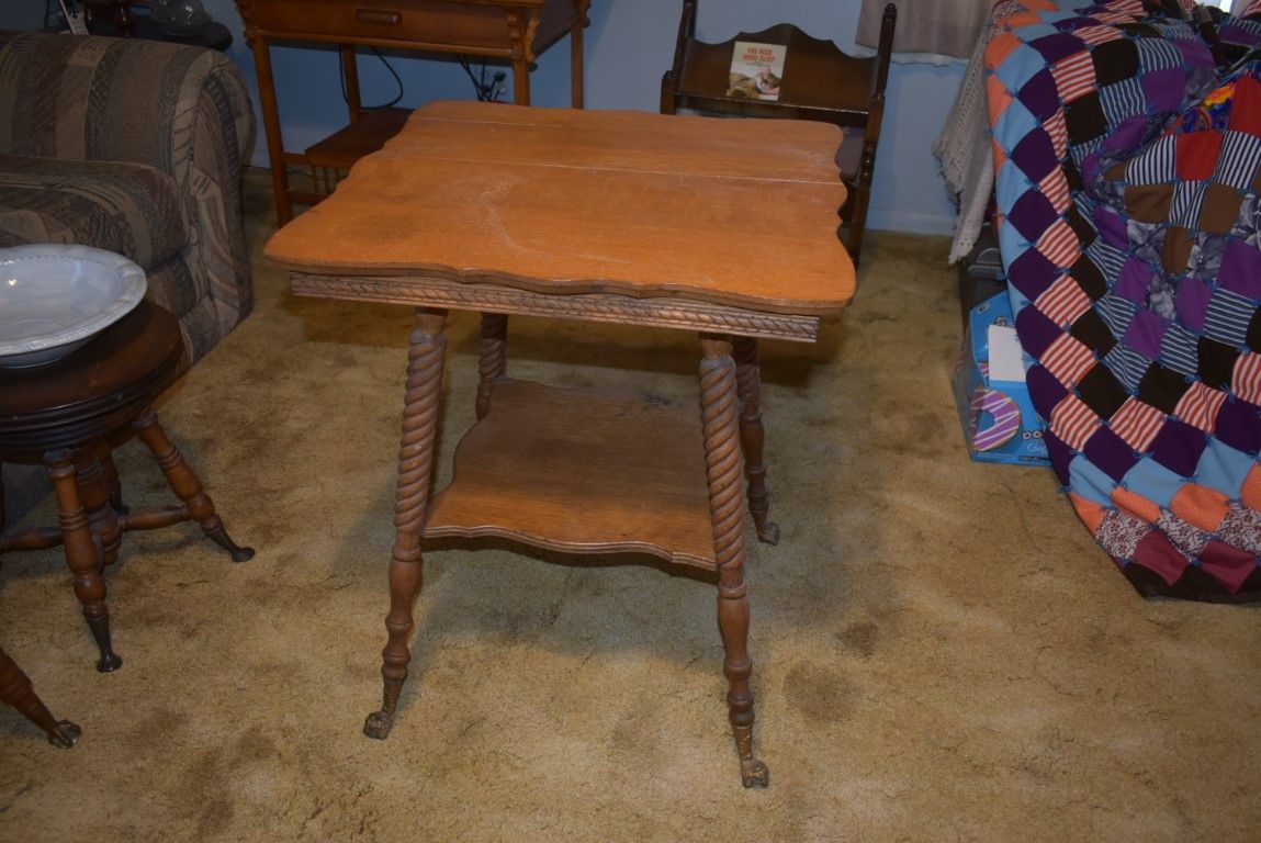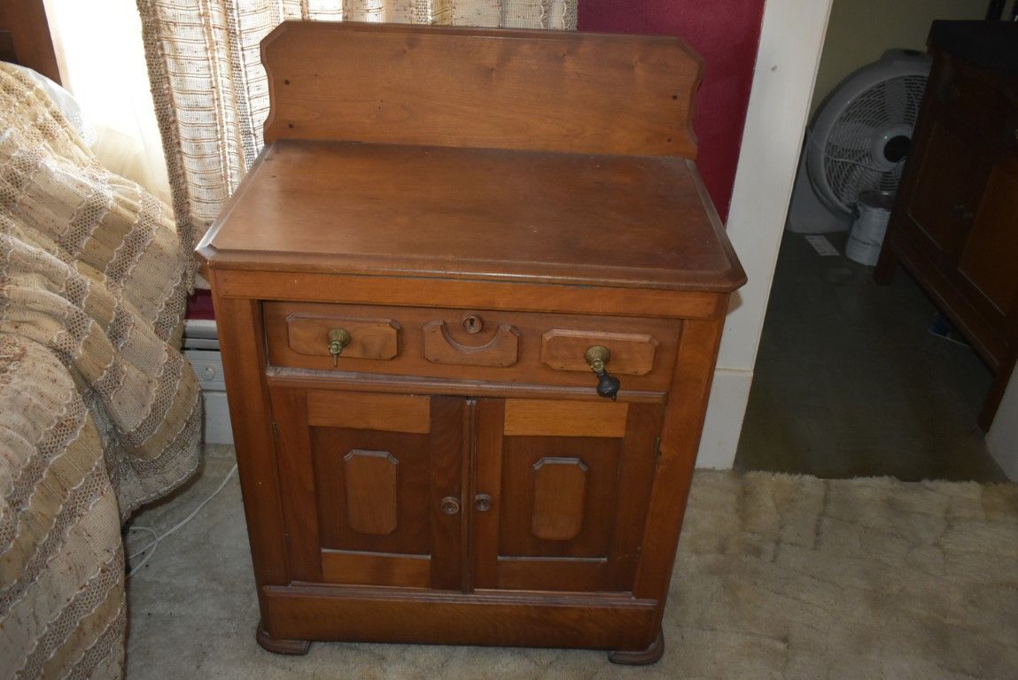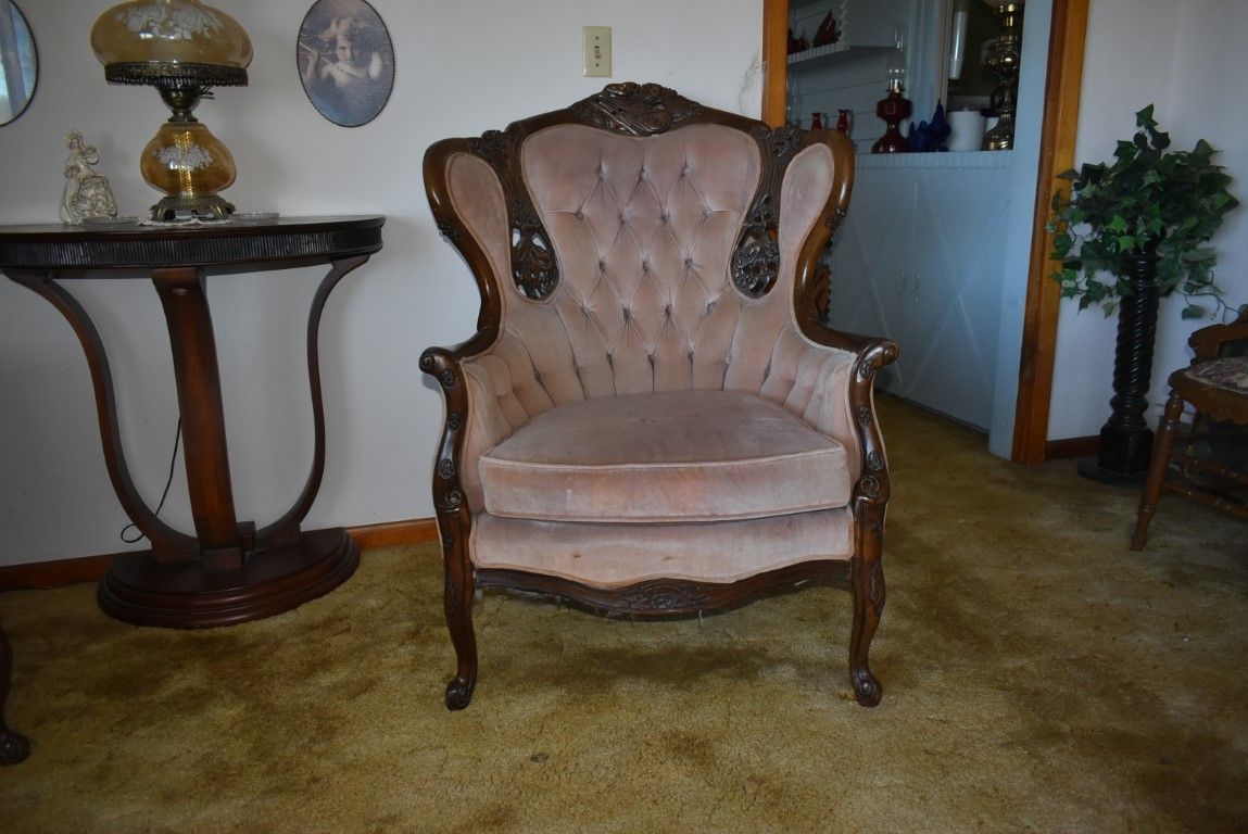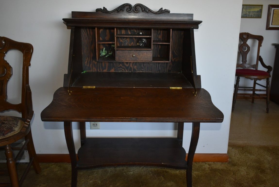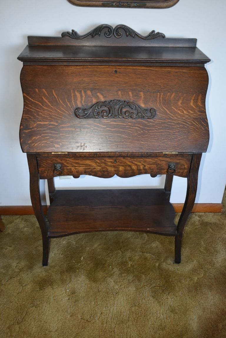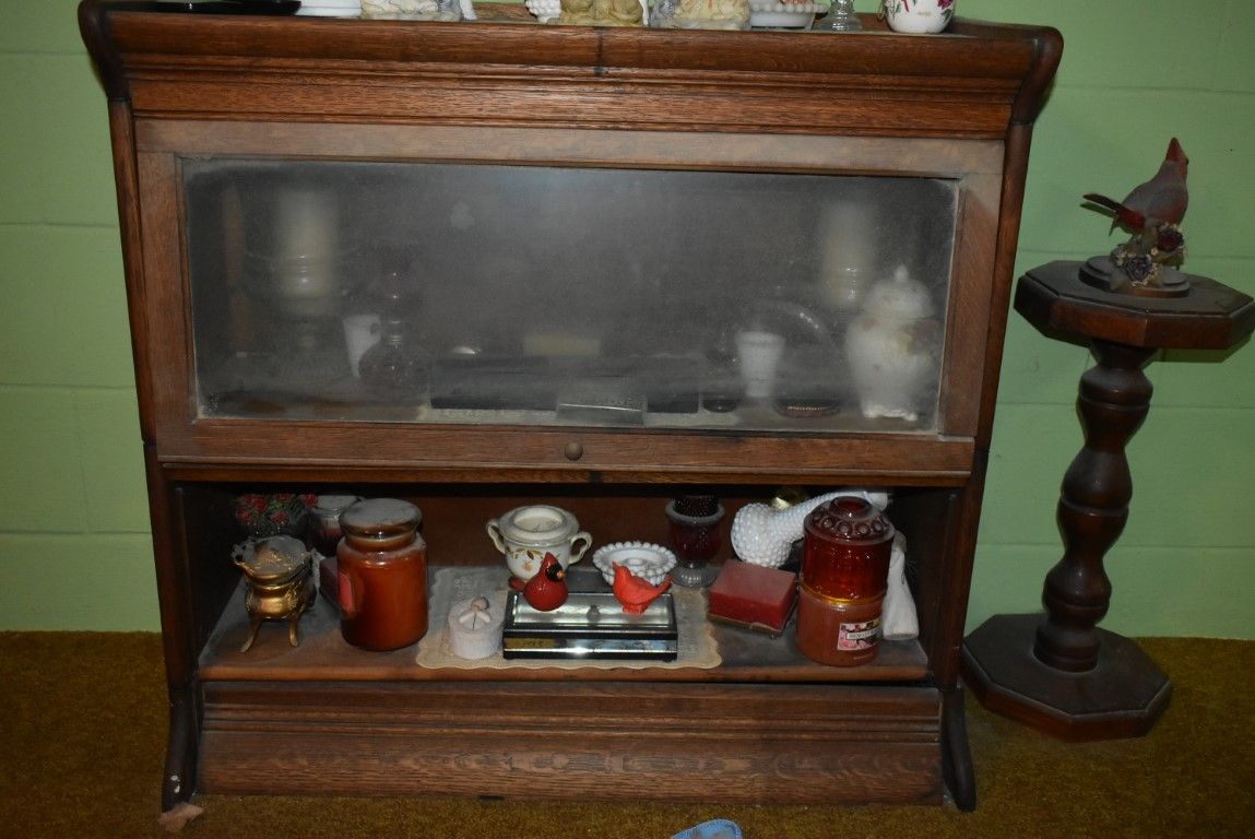 Antique Furniture: Victorian Velvet tufted back sofa, Sound of music Victorian chairs, , Antique Victorian Secretary, Antique Rocker, Foyer chairs, Vintage oak wood half round console table, pair of vintage tea tables with pedestal base, wood piano stool with claw and ball feet, antique purple platform rocker with springs, Floral upholstered Victorian style parlor chair, wood parlor table with bottom shelf, vintage 2 tier mahogany dumb waiter table with scalloped edge and tripod base, Antique rocker with Wicker seat, Two dr wood lamp stand vintage with Cabriole leap, Victorian walnut wash stand, 2 -Wood wash stand, three drawer vintage dresser, Vintage style hutch cabinet, Antique 4 dr dresser, Antique possum belly bakers cabinet, Antique buffet 60x23x30, Brass claw foot piano stool, would piano stool swivel with brass feet, Piano stool with cushion, Victorian oak side table with brass feet and glass ball feet, Antique dresser with mirror, antique wardrobe closet 78 x 41 x 14 5 shelves and two drawers, Four drawer dresser with swivel mirror, doorknob birdhouse, antique queen size bed, antique lawyers cabinet 2 shelves w/glass pull downs, Old wood trunk with two trays and hex key lock,