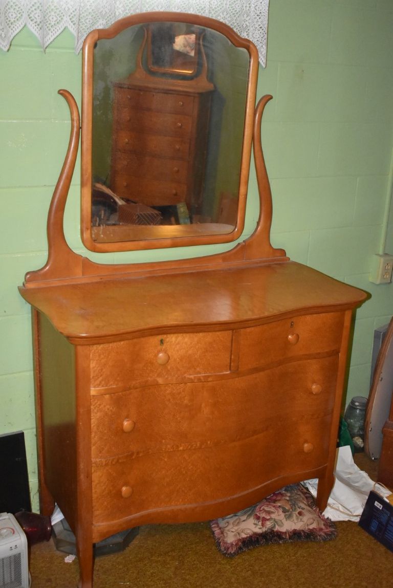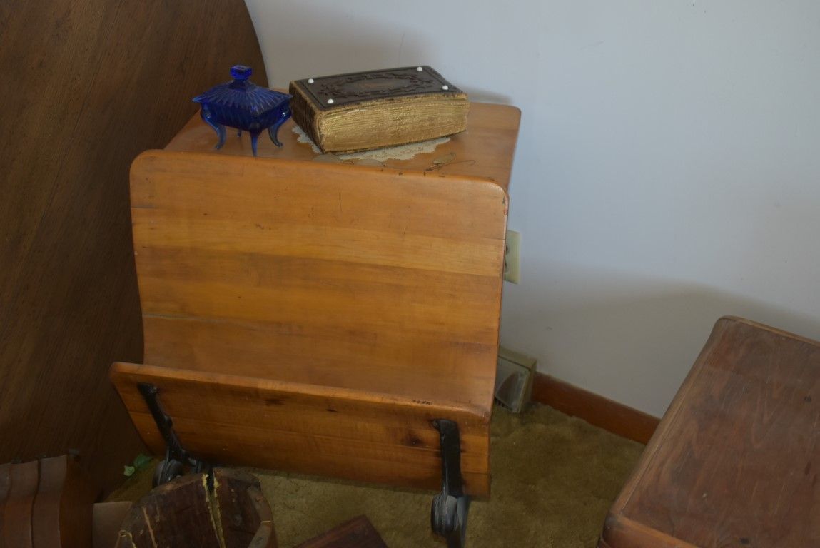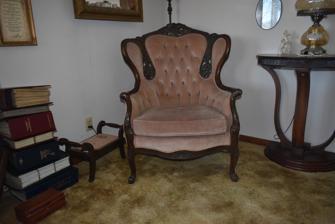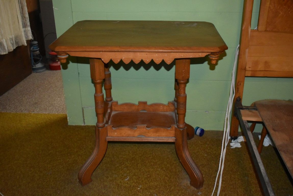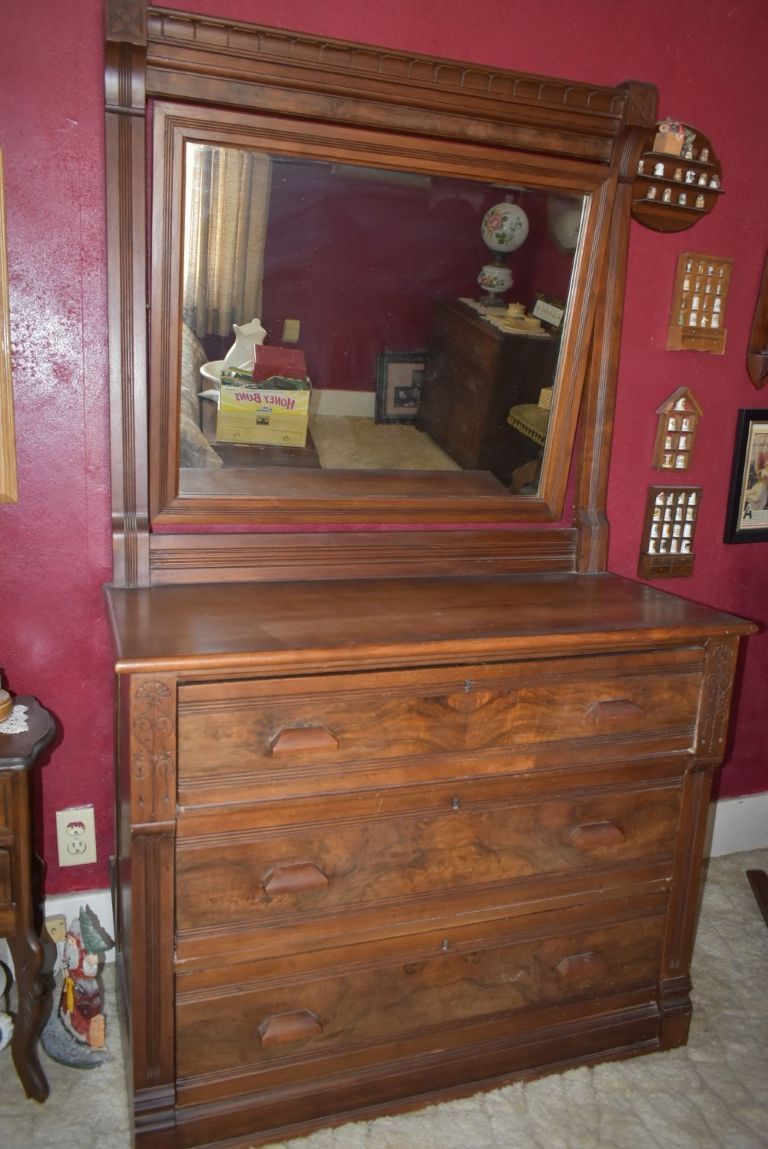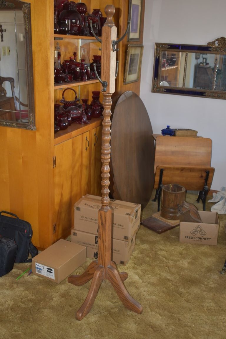 Antique Furniture: Victorian Velvet tufted back sofa, Sound of music Victorian chairs, , Antique Victorian Secretary, Antique Rocker, Foyer chairs, Vintage oak wood half round console table, pair of vintage tea tables with pedestal base, wood piano stool with claw and ball feet, antique purple platform rocker with springs, Floral upholstered Victorian style parlor chair, wood parlor table with bottom shelf, vintage 2 tier mahogany dumb waiter table with scalloped edge and tripod base, Antique rocker with Wicker seat, Two dr wood lamp stand vintage with Cabriole leap, Victorian walnut wash stand, 2 -Wood wash stand, three drawer vintage dresser, Vintage style hutch cabinet, Antique 4 dr dresser, Antique possum belly bakers cabinet, Antique buffet 60x23x30, Brass claw foot piano stool, would piano stool swivel with brass feet, Piano stool with cushion, Victorian oak side table with brass feet and glass ball feet, Antique dresser with mirror, antique wardrobe closet 78 x 41 x 14 5 shelves and two drawers, Four drawer dresser with swivel mirror, doorknob birdhouse, antique queen size bed, antique lawyers cabinet 2 shelves w/glass pull downs, Old wood trunk with two trays and hex key lock,