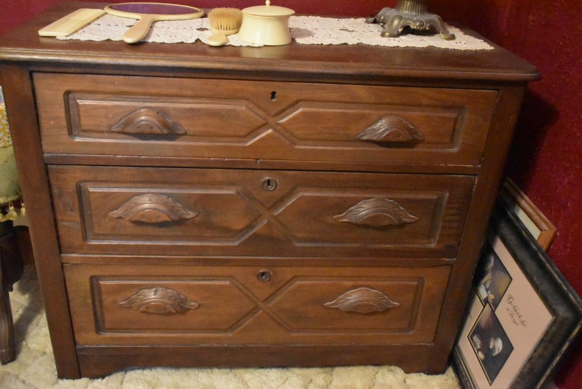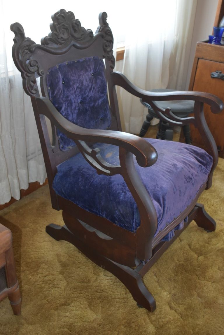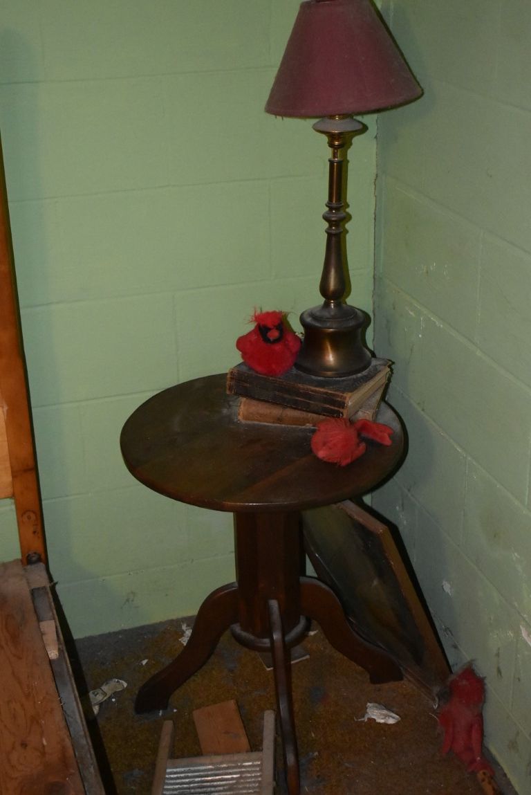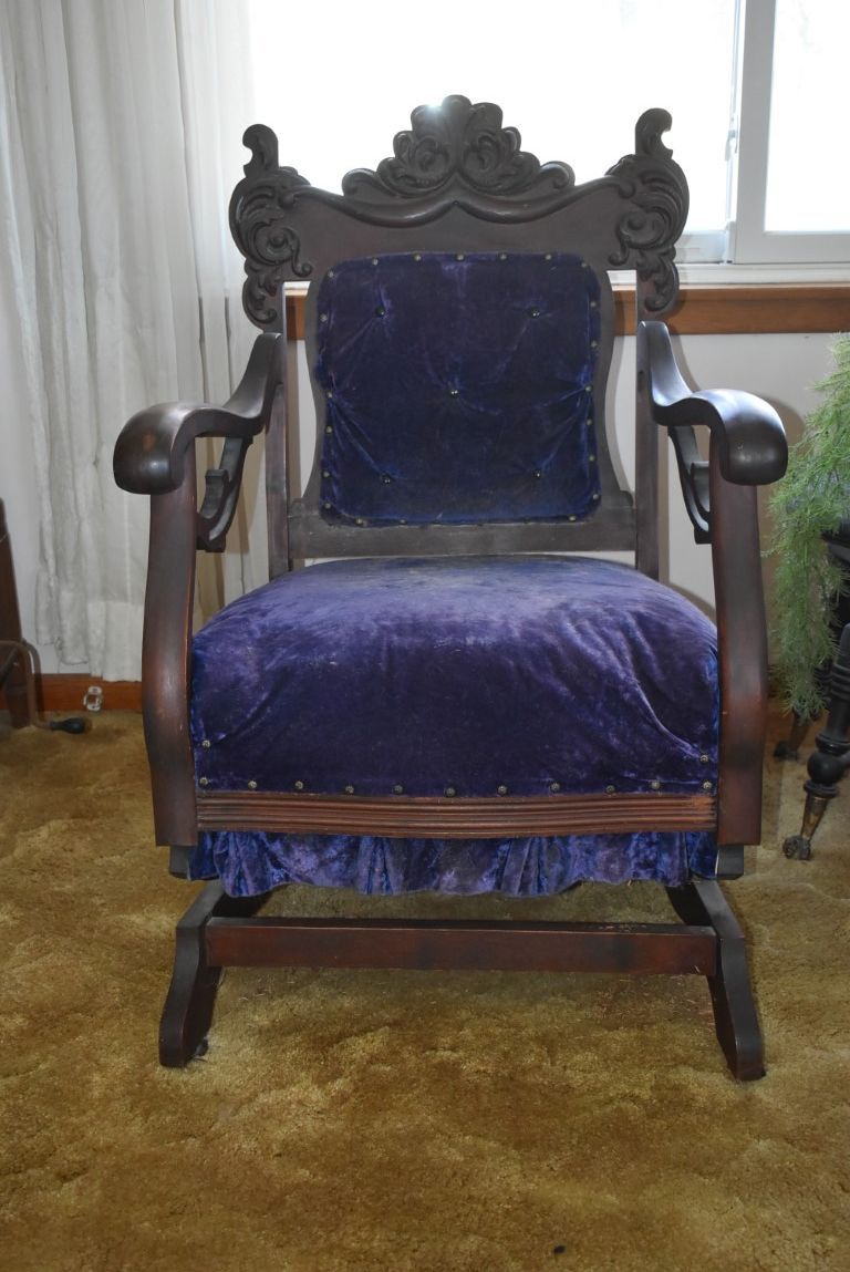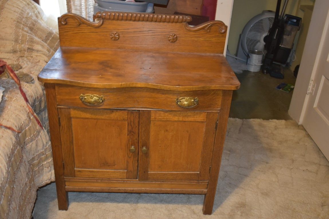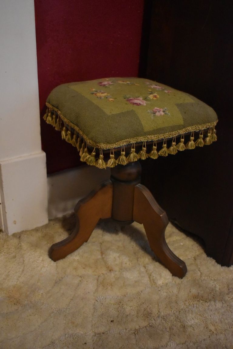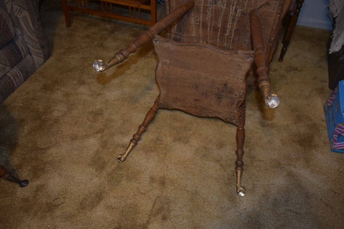 Antique Furniture: Victorian Velvet tufted back sofa, Sound of music Victorian chairs, , Antique Victorian Secretary, Antique Rocker, Foyer chairs, Vintage oak wood half round console table, pair of vintage tea tables with pedestal base, wood piano stool with claw and ball feet, antique purple platform rocker with springs, Floral upholstered Victorian style parlor chair, wood parlor table with bottom shelf, vintage 2 tier mahogany dumb waiter table with scalloped edge and tripod base, Antique rocker with Wicker seat, Two dr wood lamp stand vintage with Cabriole leap, Victorian walnut wash stand, 2 -Wood wash stand, three drawer vintage dresser, Vintage style hutch cabinet, Antique 4 dr dresser, Antique possum belly bakers cabinet, Antique buffet 60x23x30, Brass claw foot piano stool, would piano stool swivel with brass feet, Piano stool with cushion, Victorian oak side table with brass feet and glass ball feet, Antique dresser with mirror, antique wardrobe closet 78 x 41 x 14 5 shelves and two drawers, Four drawer dresser with swivel mirror, doorknob birdhouse, antique queen size bed, antique lawyers cabinet 2 shelves w/glass pull downs, Old wood trunk with two trays and hex key lock,
