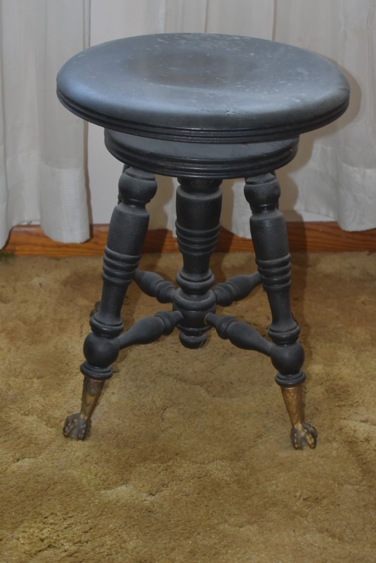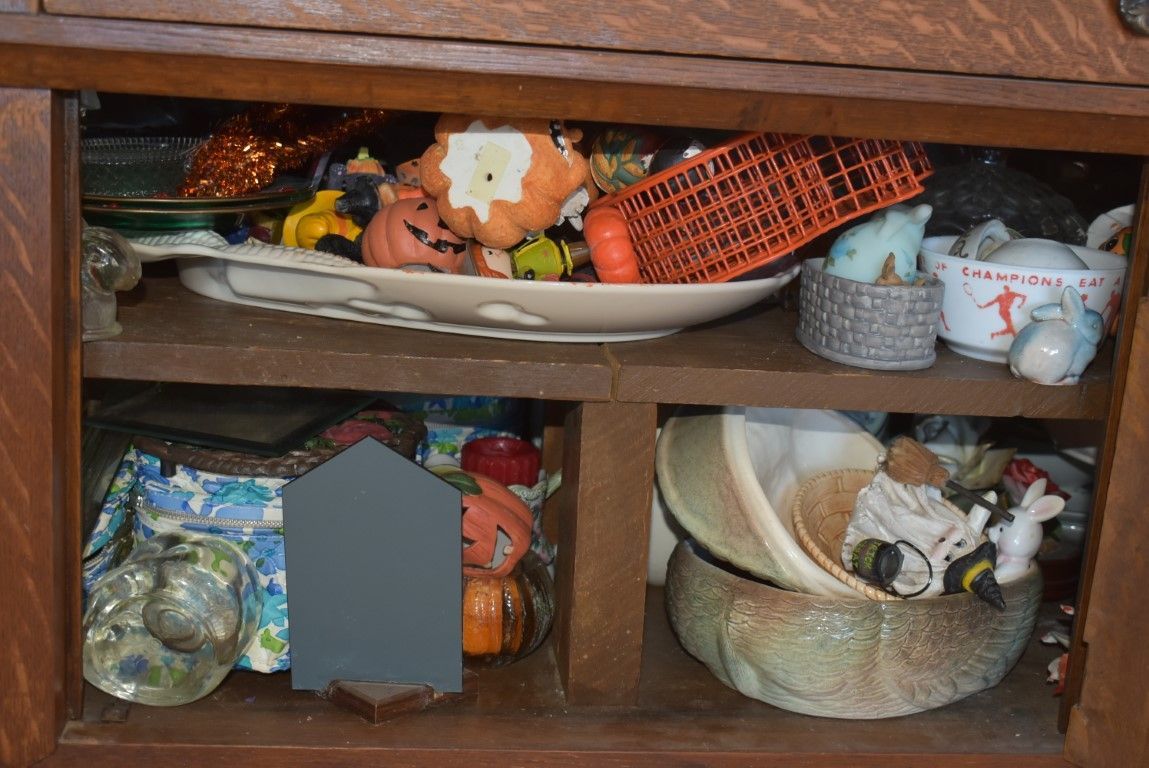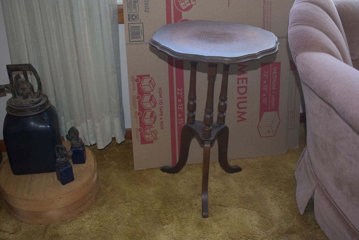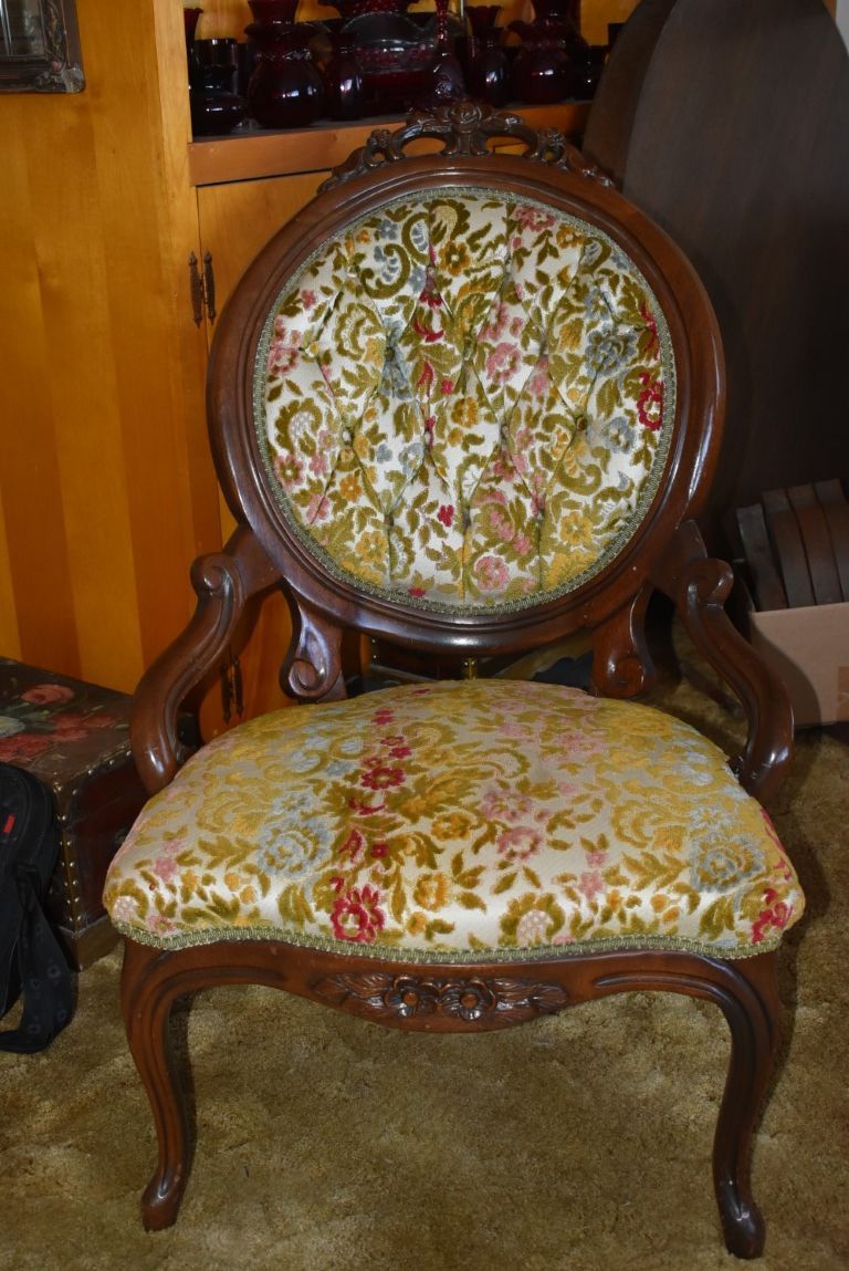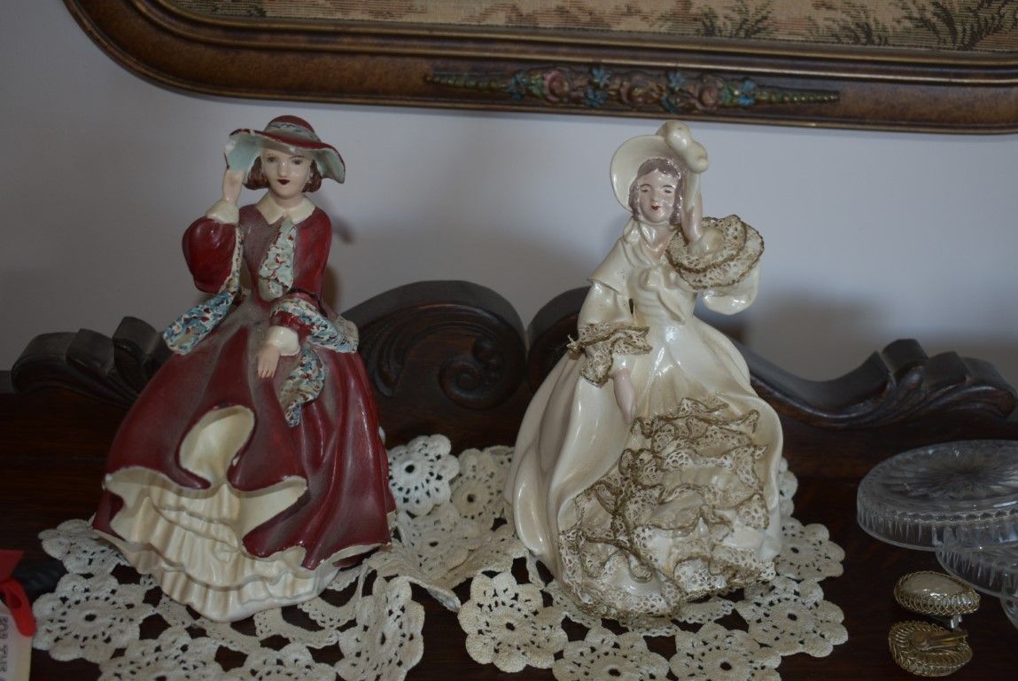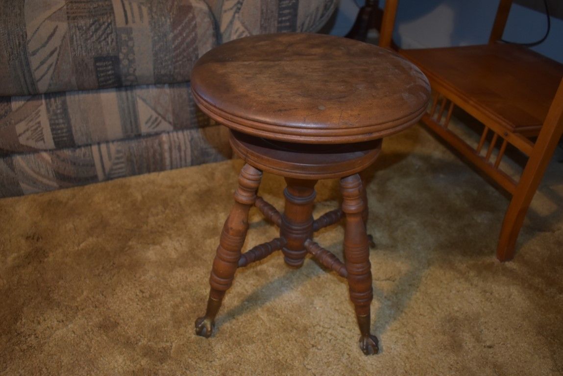 Antique Furniture: Victorian Velvet tufted back sofa, Sound of music Victorian chairs, , Antique Victorian Secretary, Antique Rocker, Foyer chairs, Vintage oak wood half round console table, pair of vintage tea tables with pedestal base, wood piano stool with claw and ball feet, antique purple platform rocker with springs, Floral upholstered Victorian style parlor chair, wood parlor table with bottom shelf, vintage 2 tier mahogany dumb waiter table with scalloped edge and tripod base, Antique rocker with Wicker seat, Two dr wood lamp stand vintage with Cabriole leap, Victorian walnut wash stand, 2 -Wood wash stand, three drawer vintage dresser, Vintage style hutch cabinet, Antique 4 dr dresser, Antique possum belly bakers cabinet, Antique buffet 60x23x30, Brass claw foot piano stool, would piano stool swivel with brass feet, Piano stool with cushion, Victorian oak side table with brass feet and glass ball feet, Antique dresser with mirror, antique wardrobe closet 78 x 41 x 14 5 shelves and two drawers, Four drawer dresser with swivel mirror, doorknob birdhouse, antique queen size bed, antique lawyers cabinet 2 shelves w/glass pull downs, Old wood trunk with two trays and hex key lock,