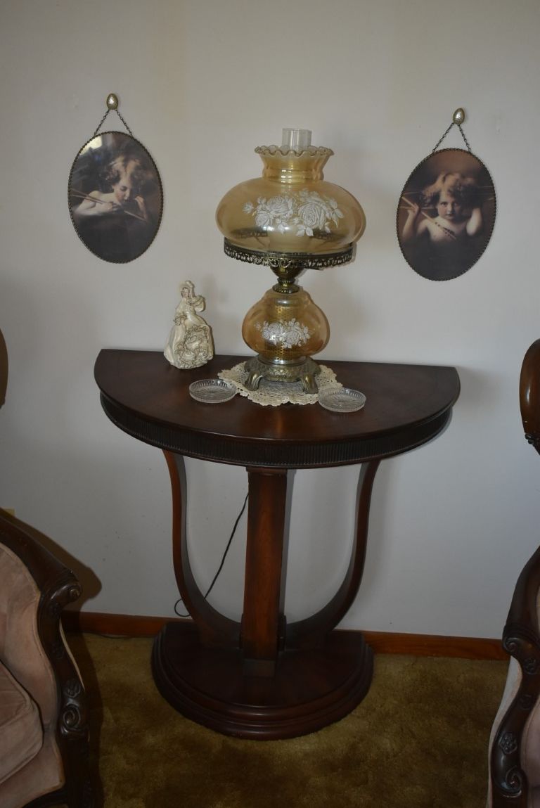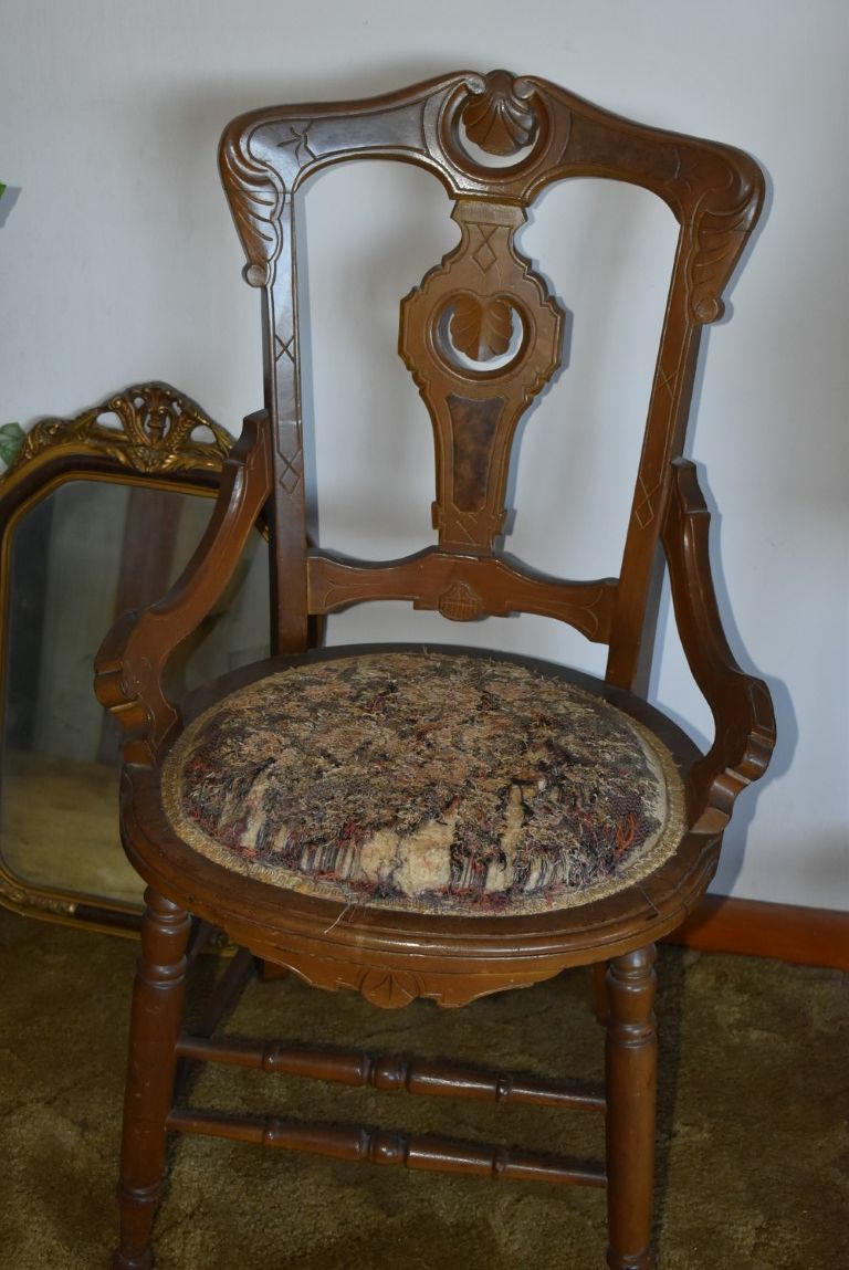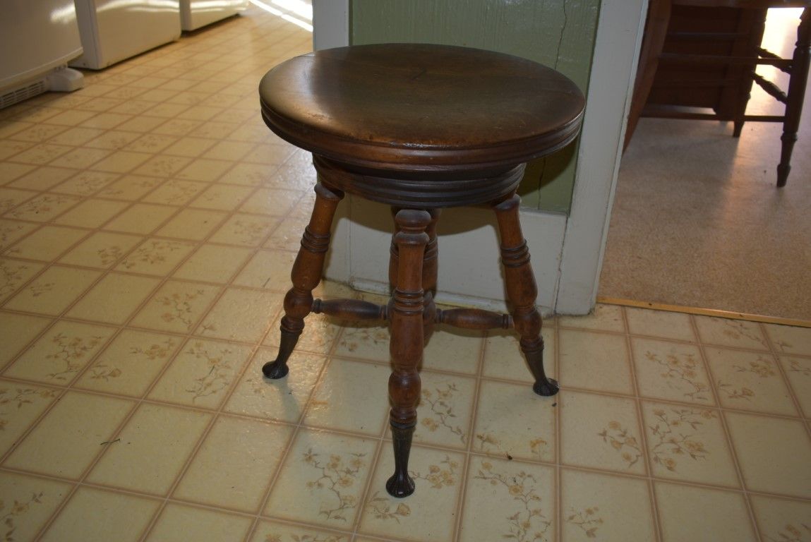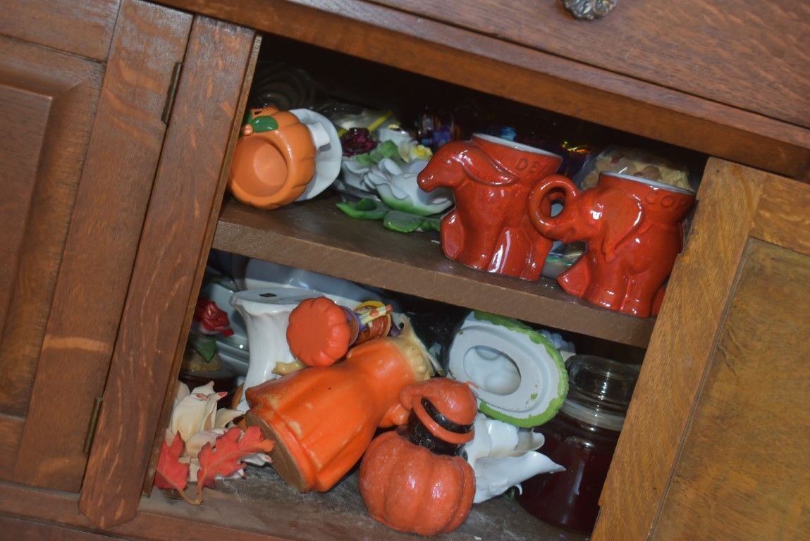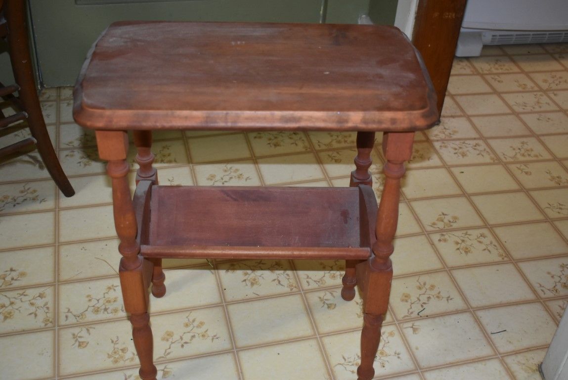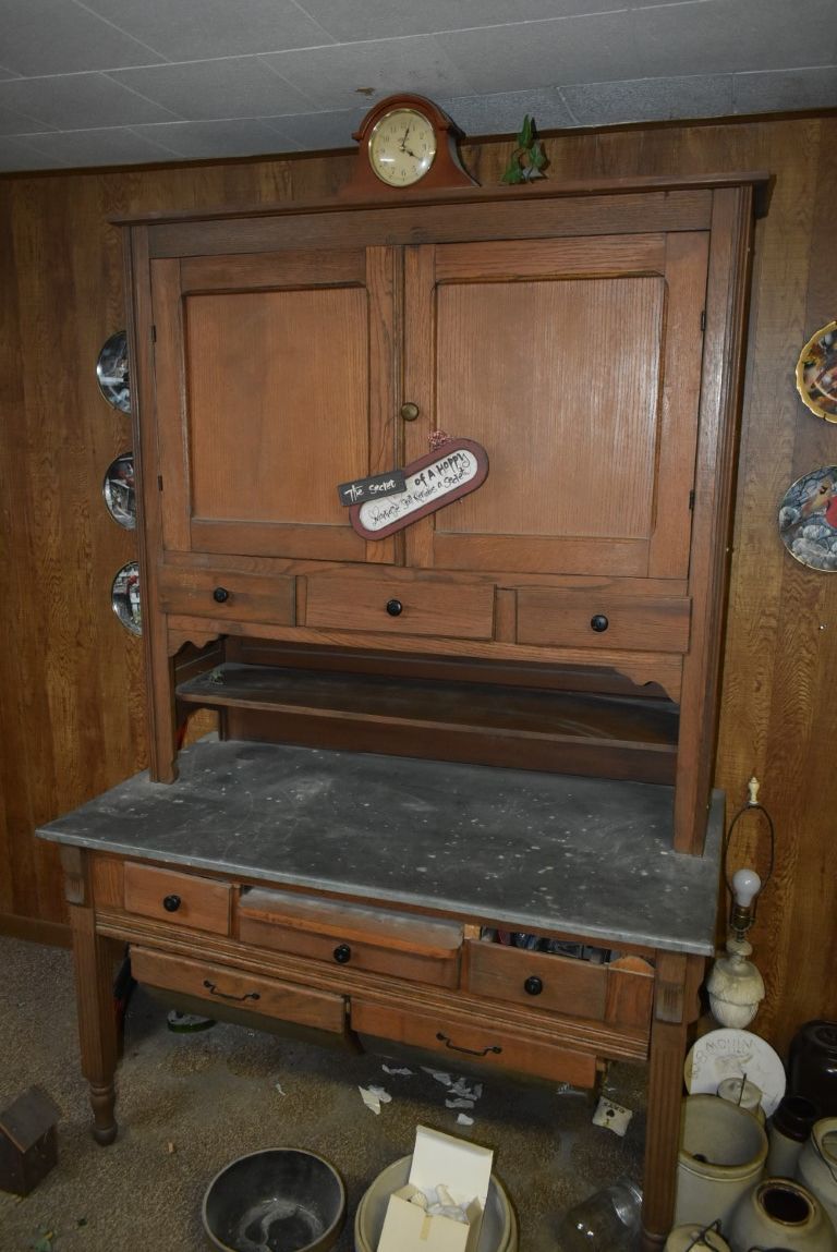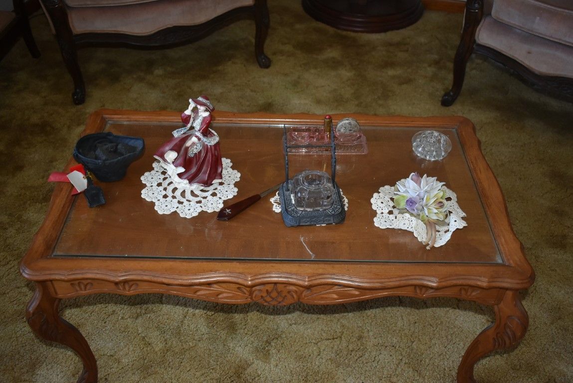 Antique Furniture: Victorian Velvet tufted back sofa, Sound of music Victorian chairs, , Antique Victorian Secretary, Antique Rocker, Foyer chairs, Vintage oak wood half round console table, pair of vintage tea tables with pedestal base, wood piano stool with claw and ball feet, antique purple platform rocker with springs, Floral upholstered Victorian style parlor chair, wood parlor table with bottom shelf, vintage 2 tier mahogany dumb waiter table with scalloped edge and tripod base, Antique rocker with Wicker seat, Two dr wood lamp stand vintage with Cabriole leap, Victorian walnut wash stand, 2 -Wood wash stand, three drawer vintage dresser, Vintage style hutch cabinet, Antique 4 dr dresser, Antique possum belly bakers cabinet, Antique buffet 60x23x30, Brass claw foot piano stool, would piano stool swivel with brass feet, Piano stool with cushion, Victorian oak side table with brass feet and glass ball feet, Antique dresser with mirror, antique wardrobe closet 78 x 41 x 14 5 shelves and two drawers, Four drawer dresser with swivel mirror, doorknob birdhouse, antique queen size bed, antique lawyers cabinet 2 shelves w/glass pull downs, Old wood trunk with two trays and hex key lock,