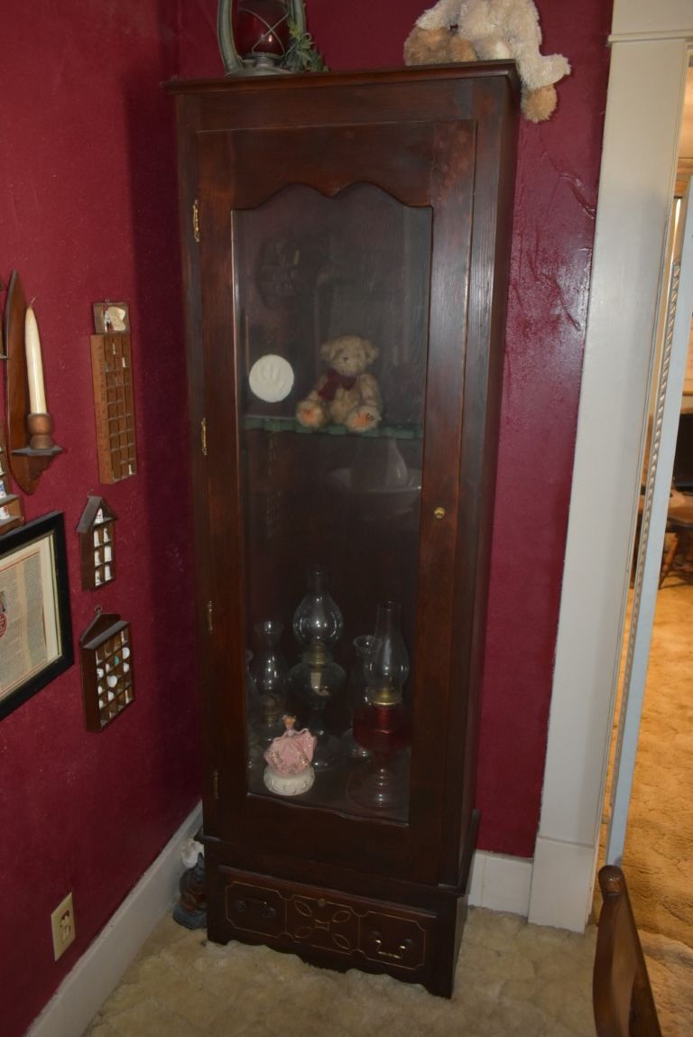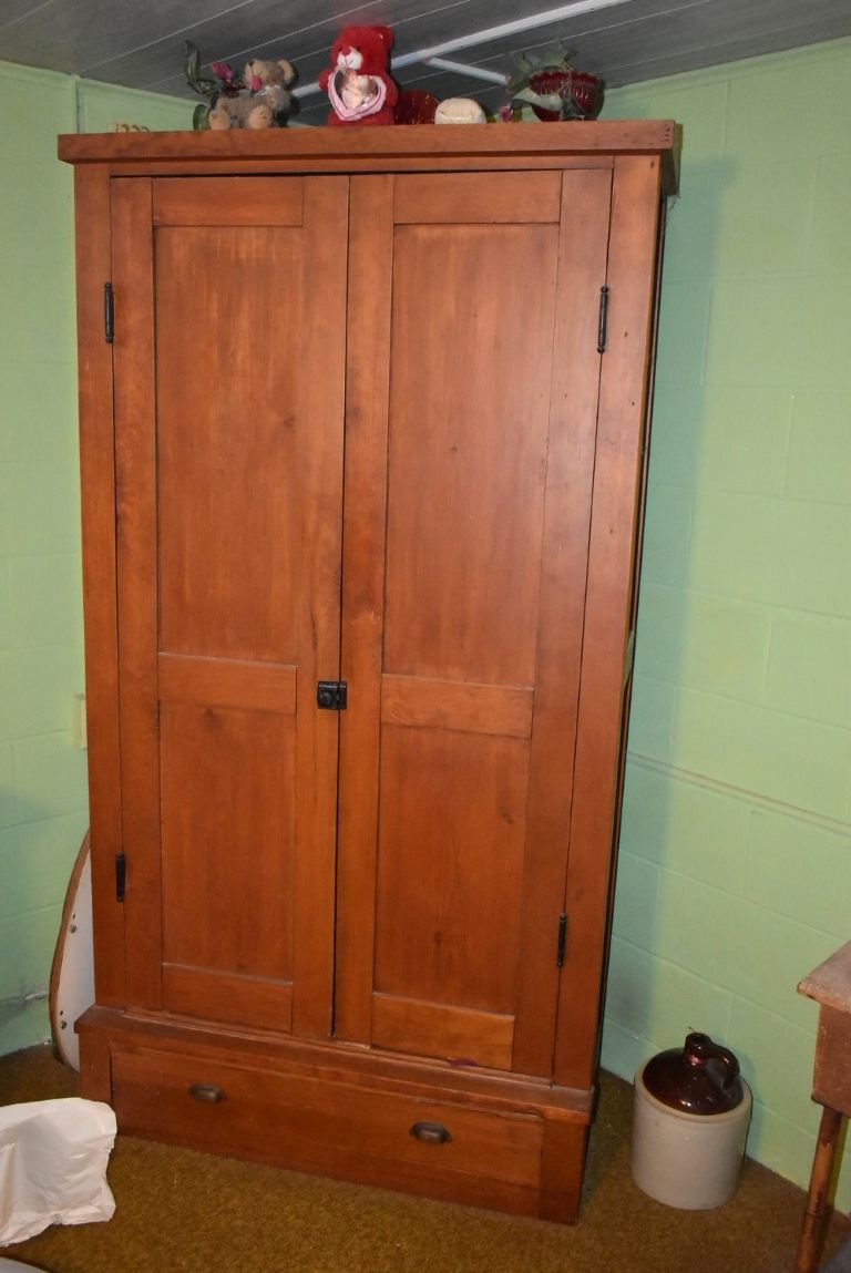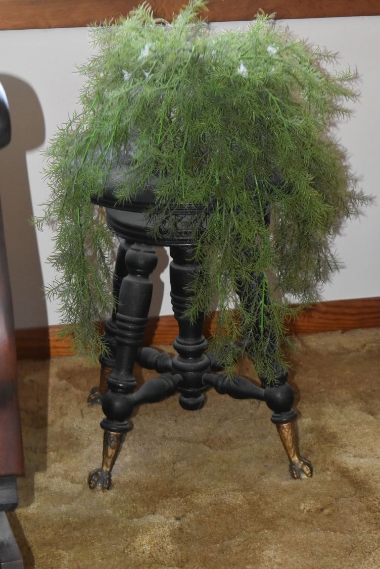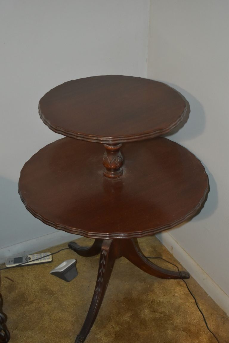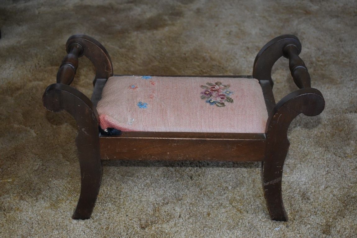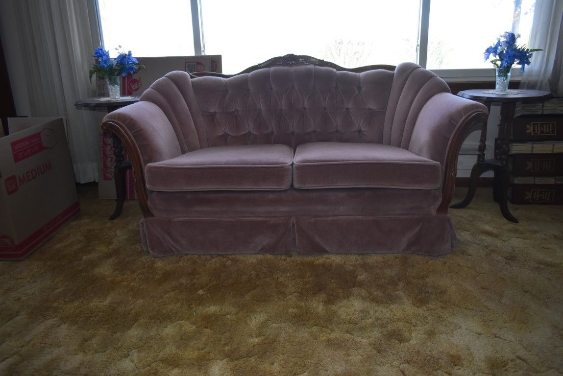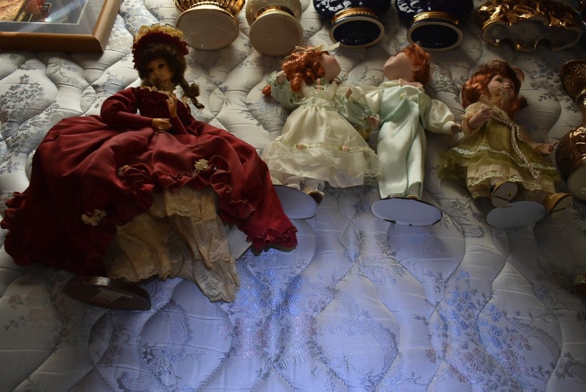 Antique Furniture: Victorian Velvet tufted back sofa, Sound of music Victorian chairs, , Antique Victorian Secretary, Antique Rocker, Foyer chairs, Vintage oak wood half round console table, pair of vintage tea tables with pedestal base, wood piano stool with claw and ball feet, antique purple platform rocker with springs, Floral upholstered Victorian style parlor chair, wood parlor table with bottom shelf, vintage 2 tier mahogany dumb waiter table with scalloped edge and tripod base, Antique rocker with Wicker seat, Two dr wood lamp stand vintage with Cabriole leap, Victorian walnut wash stand, 2 -Wood wash stand, three drawer vintage dresser, Vintage style hutch cabinet, Antique 4 dr dresser, Antique possum belly bakers cabinet, Antique buffet 60x23x30, Brass claw foot piano stool, would piano stool swivel with brass feet, Piano stool with cushion, Victorian oak side table with brass feet and glass ball feet, Antique dresser with mirror, antique wardrobe closet 78 x 41 x 14 5 shelves and two drawers, Four drawer dresser with swivel mirror, doorknob birdhouse, antique queen size bed, antique lawyers cabinet 2 shelves w/glass pull downs, Old wood trunk with two trays and hex key lock,