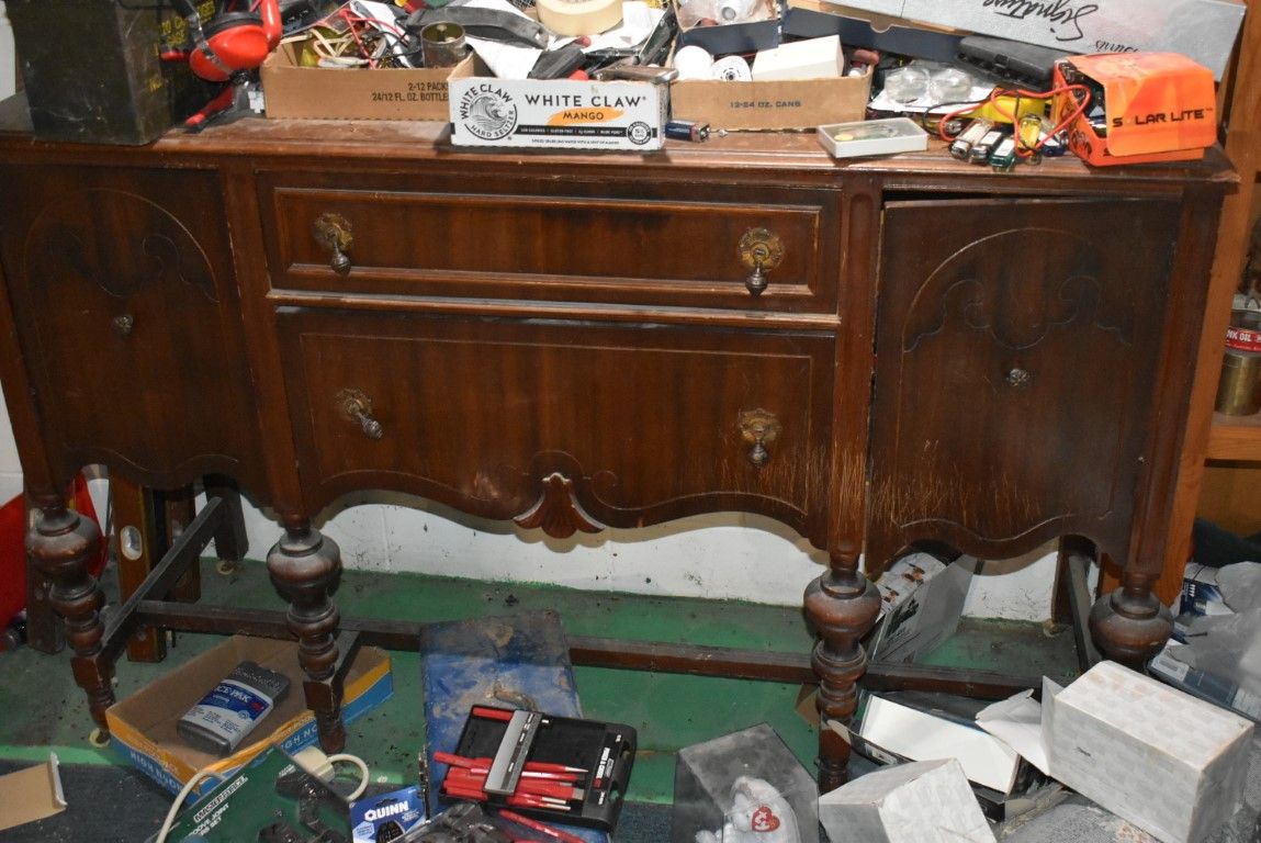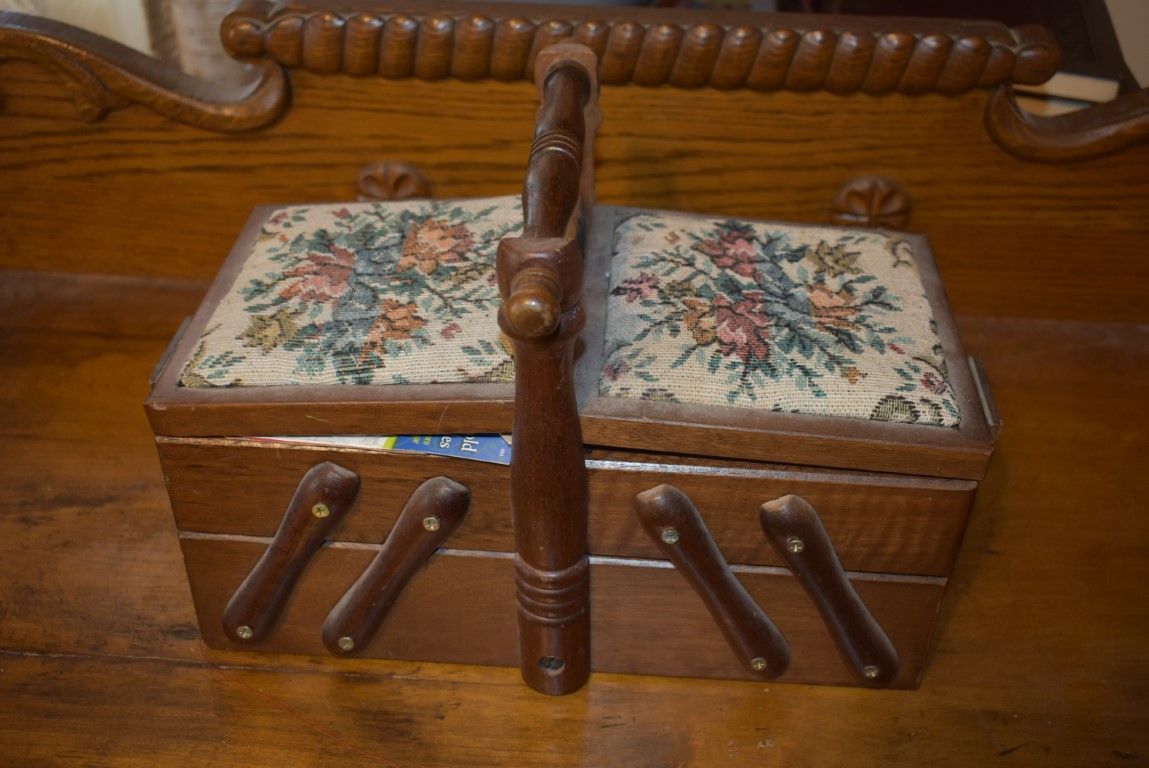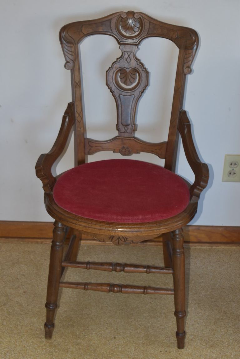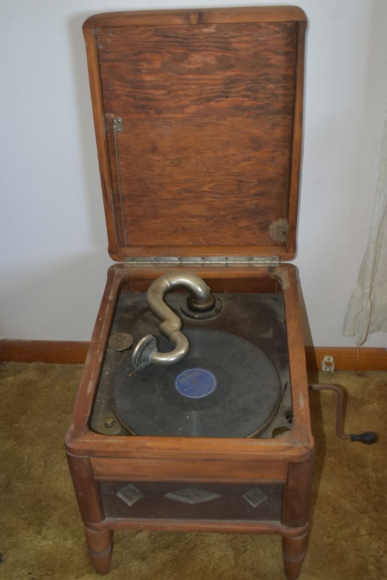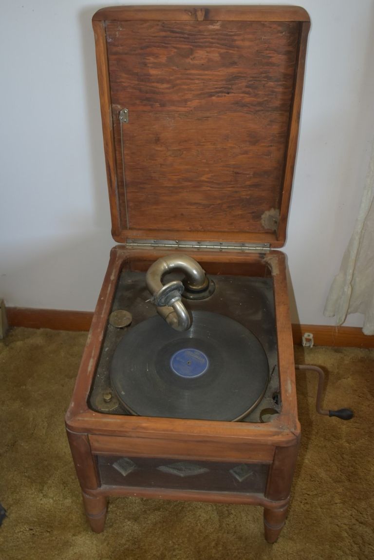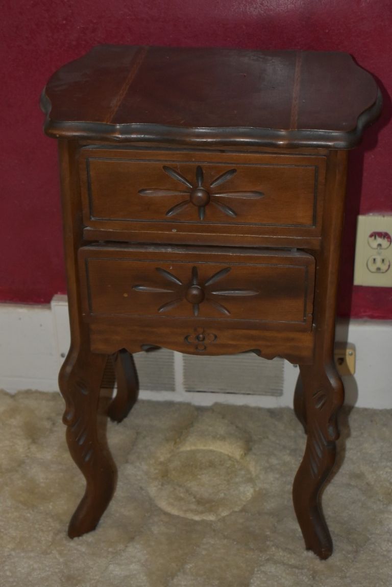 Antique Furniture: Victorian Velvet tufted back sofa, Sound of music Victorian chairs, , Antique Victorian Secretary, Antique Rocker, Foyer chairs, Vintage oak wood half round console table, pair of vintage tea tables with pedestal base, wood piano stool with claw and ball feet, antique purple platform rocker with springs, Floral upholstered Victorian style parlor chair, wood parlor table with bottom shelf, vintage 2 tier mahogany dumb waiter table with scalloped edge and tripod base, Antique rocker with Wicker seat, Two dr wood lamp stand vintage with Cabriole leap, Victorian walnut wash stand, 2 -Wood wash stand, three drawer vintage dresser, Vintage style hutch cabinet, Antique 4 dr dresser, Antique possum belly bakers cabinet, Antique buffet 60x23x30, Brass claw foot piano stool, would piano stool swivel with brass feet, Piano stool with cushion, Victorian oak side table with brass feet and glass ball feet, Antique dresser with mirror, antique wardrobe closet 78 x 41 x 14 5 shelves and two drawers, Four drawer dresser with swivel mirror, doorknob birdhouse, antique queen size bed, antique lawyers cabinet 2 shelves w/glass pull downs, Old wood trunk with two trays and hex key lock,