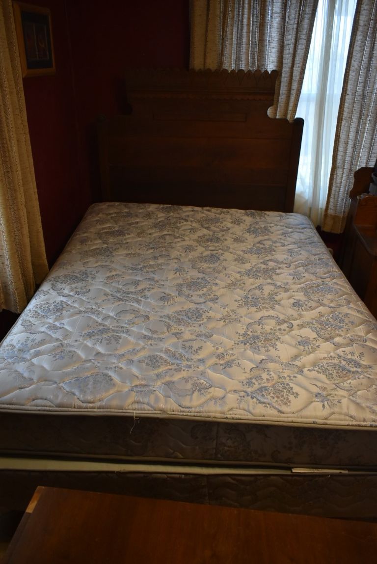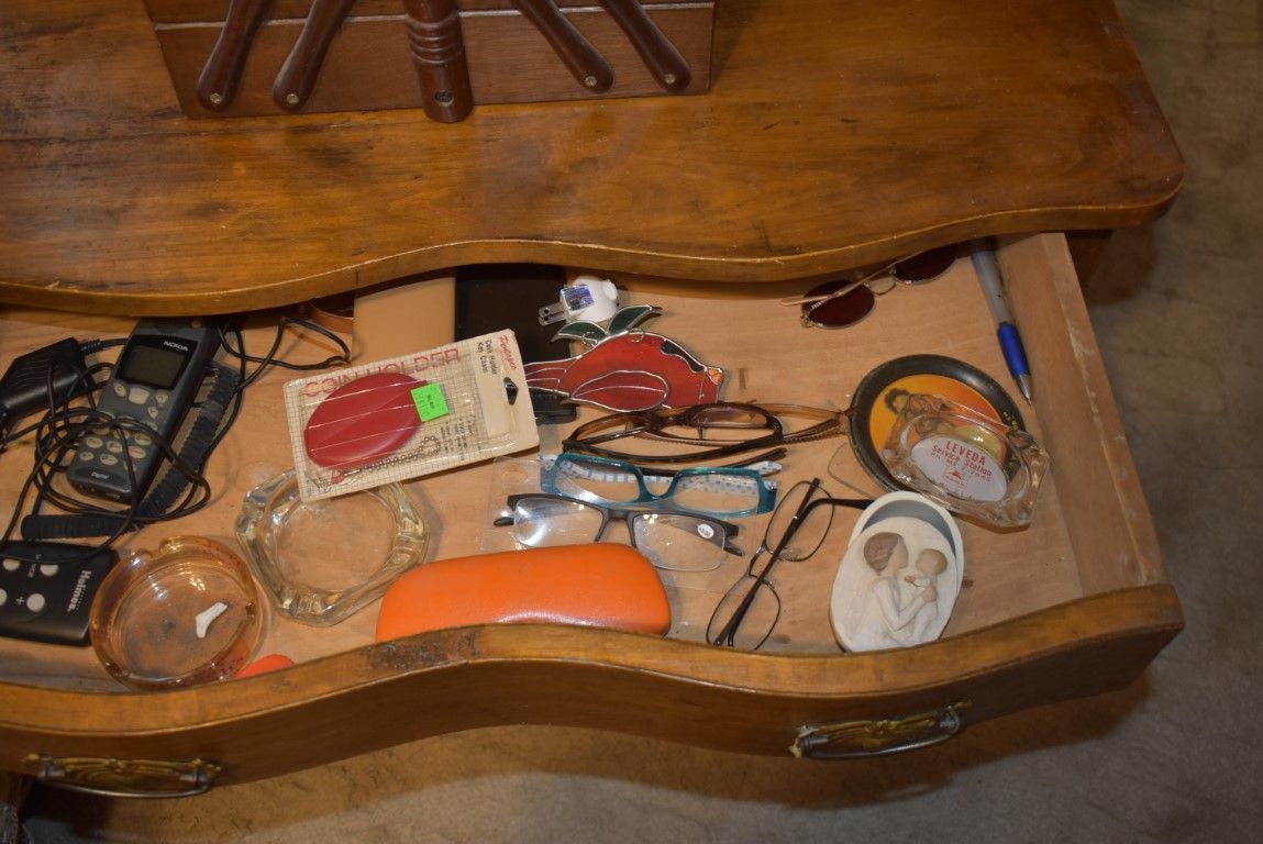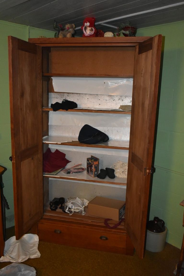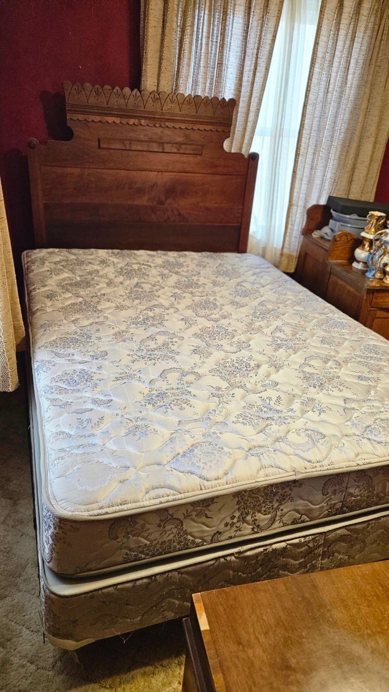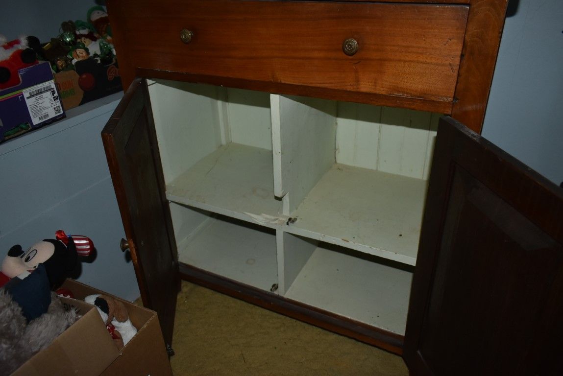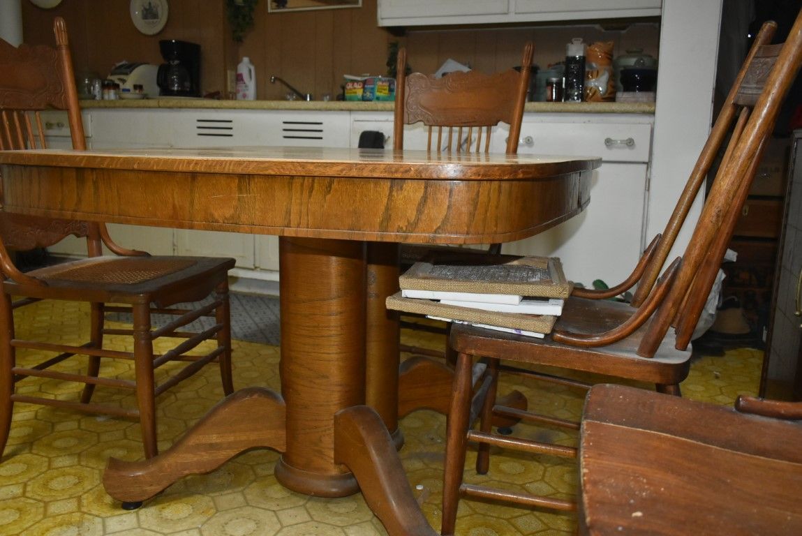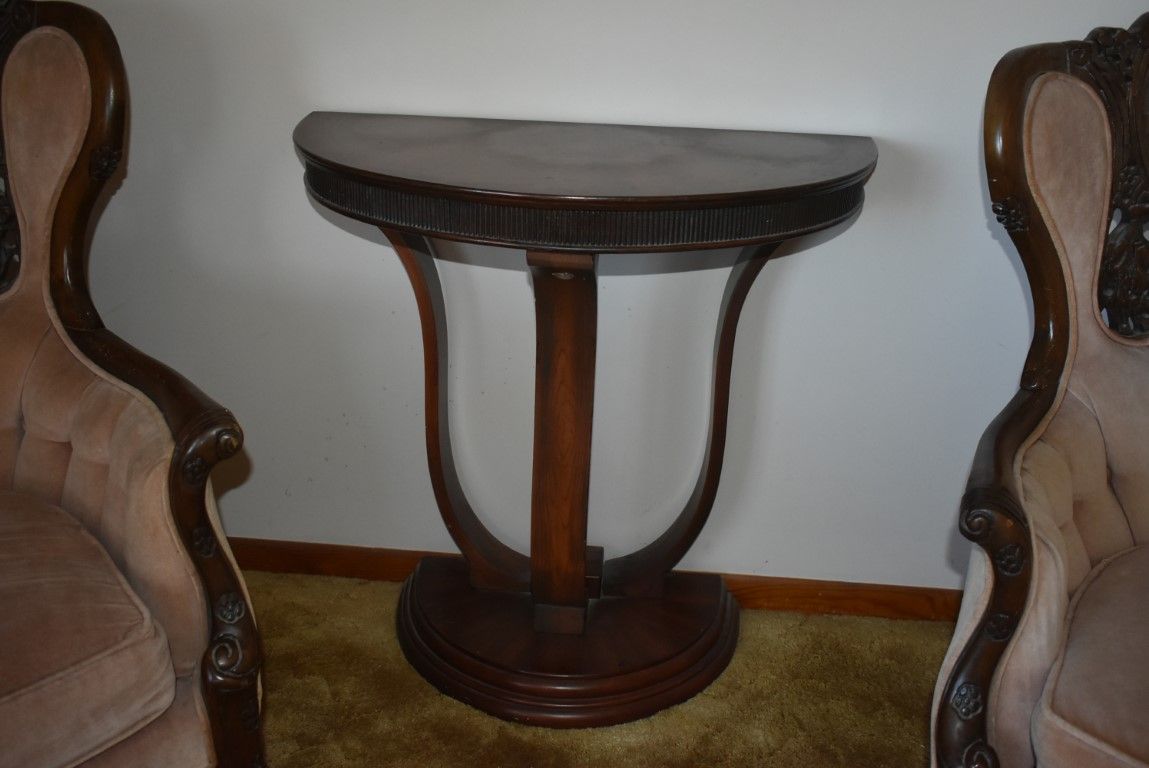 Antique Furniture: Victorian Velvet tufted back sofa, Sound of music Victorian chairs, , Antique Victorian Secretary, Antique Rocker, Foyer chairs, Vintage oak wood half round console table, pair of vintage tea tables with pedestal base, wood piano stool with claw and ball feet, antique purple platform rocker with springs, Floral upholstered Victorian style parlor chair, wood parlor table with bottom shelf, vintage 2 tier mahogany dumb waiter table with scalloped edge and tripod base, Antique rocker with Wicker seat, Two dr wood lamp stand vintage with Cabriole leap, Victorian walnut wash stand, 2 -Wood wash stand, three drawer vintage dresser, Vintage style hutch cabinet, Antique 4 dr dresser, Antique possum belly bakers cabinet, Antique buffet 60x23x30, Brass claw foot piano stool, would piano stool swivel with brass feet, Piano stool with cushion, Victorian oak side table with brass feet and glass ball feet, Antique dresser with mirror, antique wardrobe closet 78 x 41 x 14 5 shelves and two drawers, Four drawer dresser with swivel mirror, doorknob birdhouse, antique queen size bed, antique lawyers cabinet 2 shelves w/glass pull downs, Old wood trunk with two trays and hex key lock,
