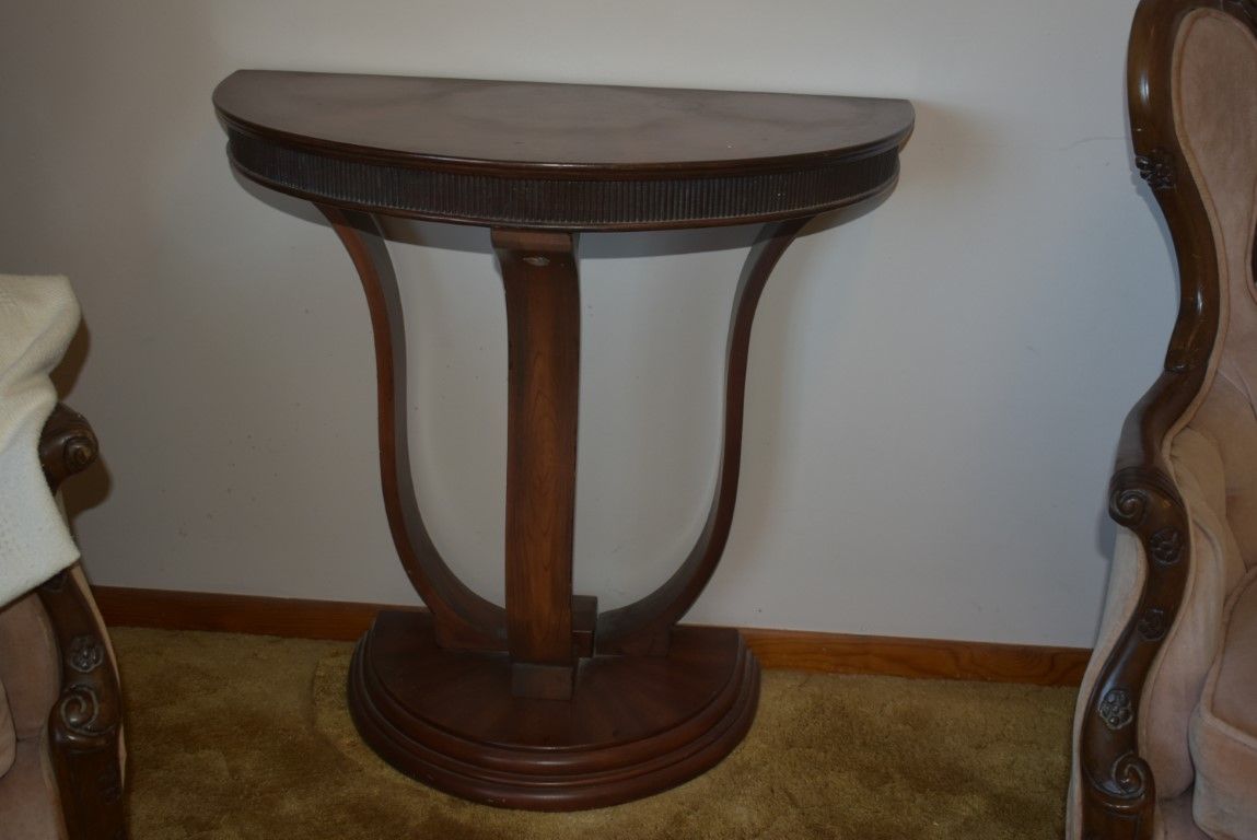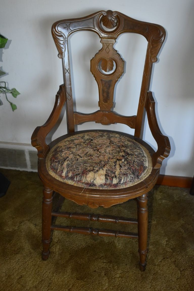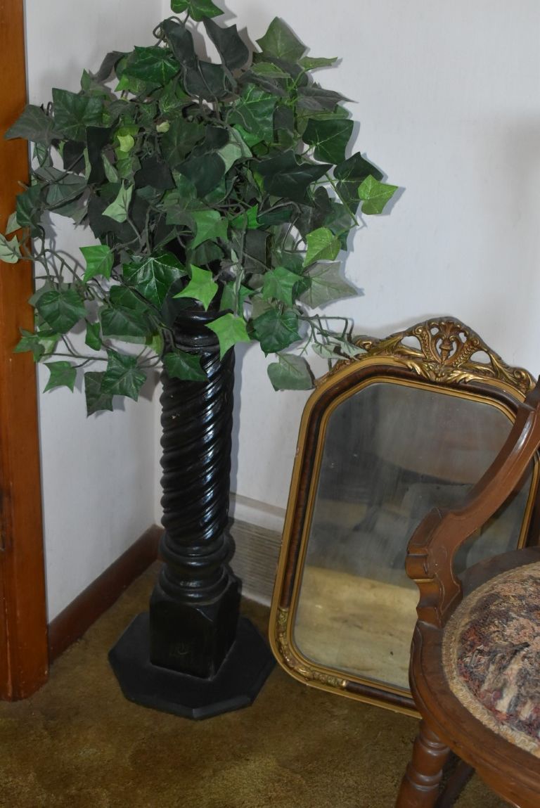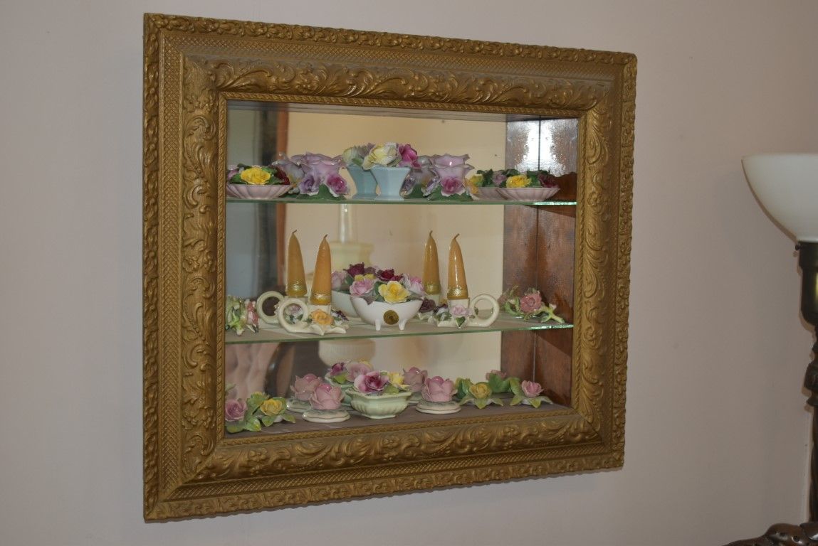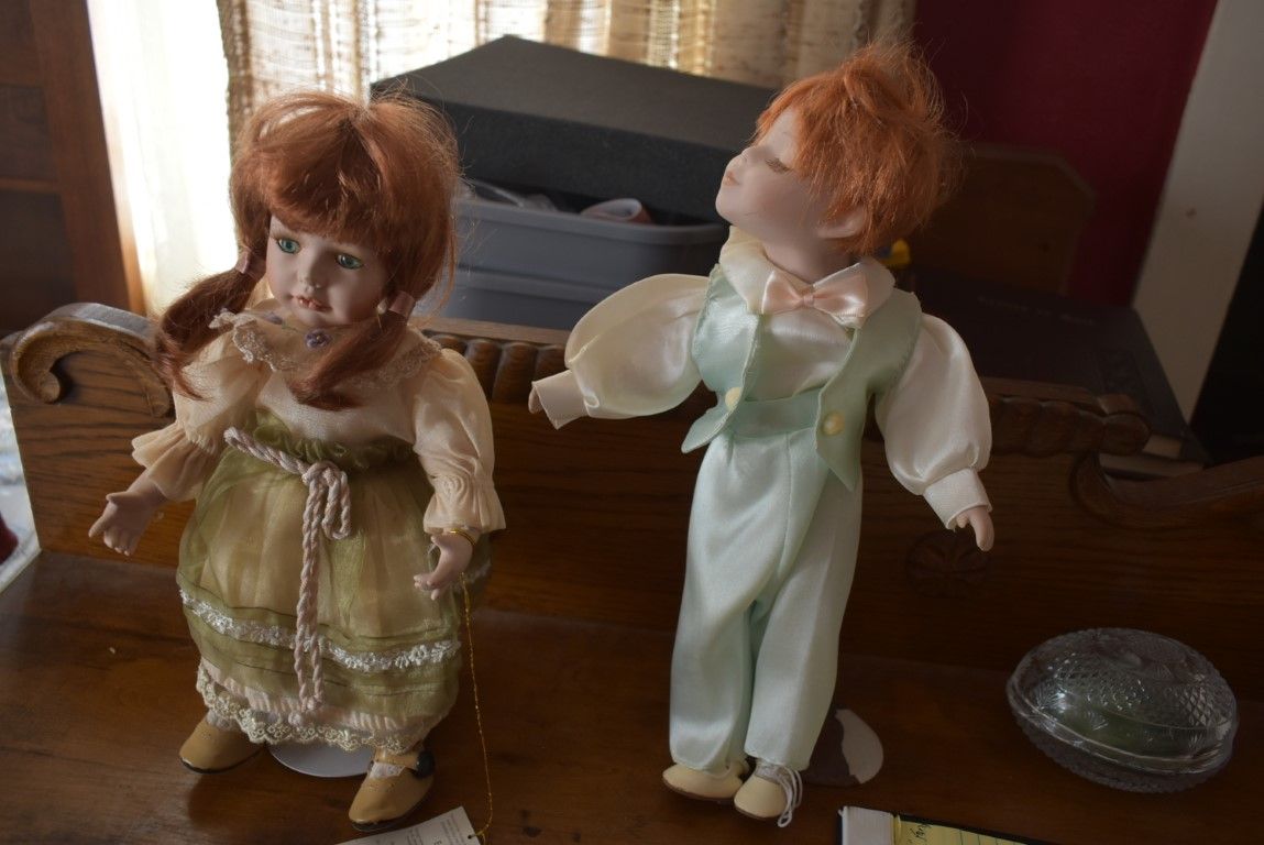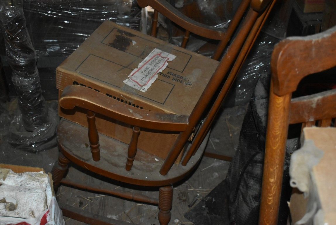 Antique Furniture: Victorian Velvet tufted back sofa, Sound of music Victorian chairs, , Antique Victorian Secretary, Antique Rocker, Foyer chairs, Vintage oak wood half round console table, pair of vintage tea tables with pedestal base, wood piano stool with claw and ball feet, antique purple platform rocker with springs, Floral upholstered Victorian style parlor chair, wood parlor table with bottom shelf, vintage 2 tier mahogany dumb waiter table with scalloped edge and tripod base, Antique rocker with Wicker seat, Two dr wood lamp stand vintage with Cabriole leap, Victorian walnut wash stand, 2 -Wood wash stand, three drawer vintage dresser, Vintage style hutch cabinet, Antique 4 dr dresser, Antique possum belly bakers cabinet, Antique buffet 60x23x30, Brass claw foot piano stool, would piano stool swivel with brass feet, Piano stool with cushion, Victorian oak side table with brass feet and glass ball feet, Antique dresser with mirror, antique wardrobe closet 78 x 41 x 14 5 shelves and two drawers, Four drawer dresser with swivel mirror, doorknob birdhouse, antique queen size bed, antique lawyers cabinet 2 shelves w/glass pull downs, Old wood trunk with two trays and hex key lock,