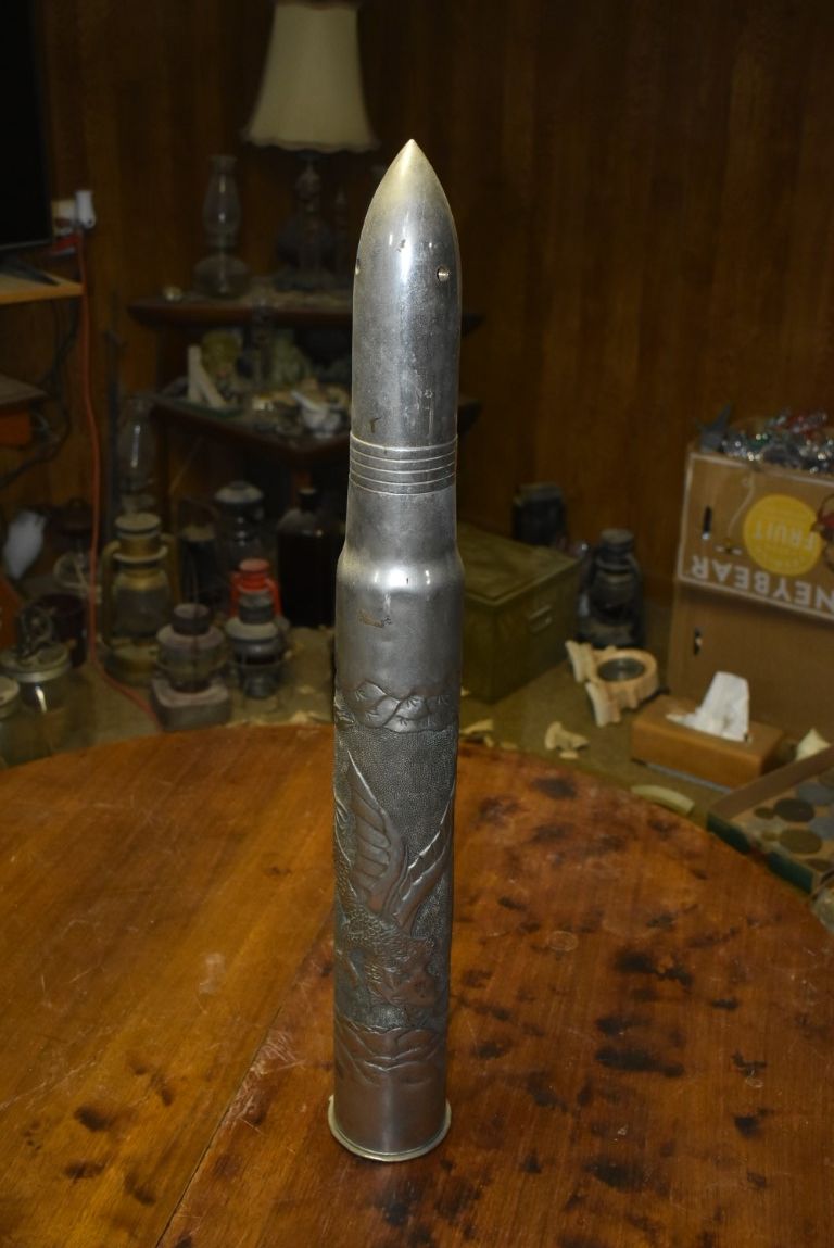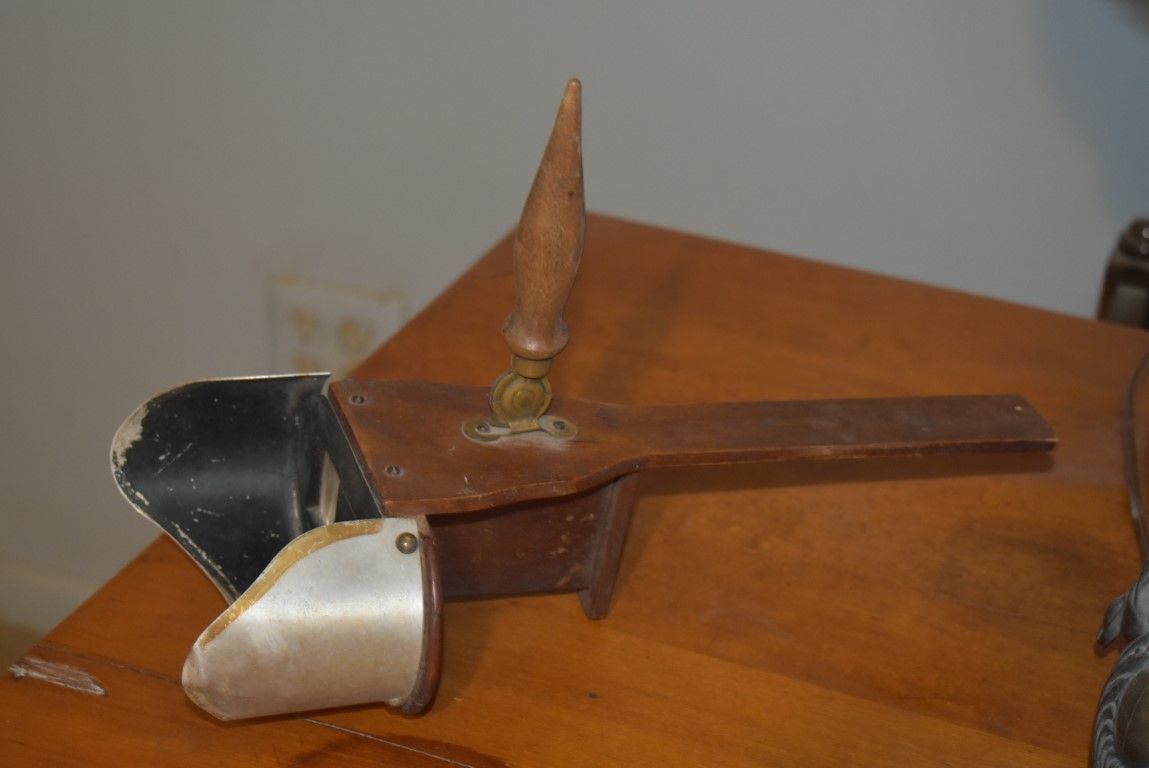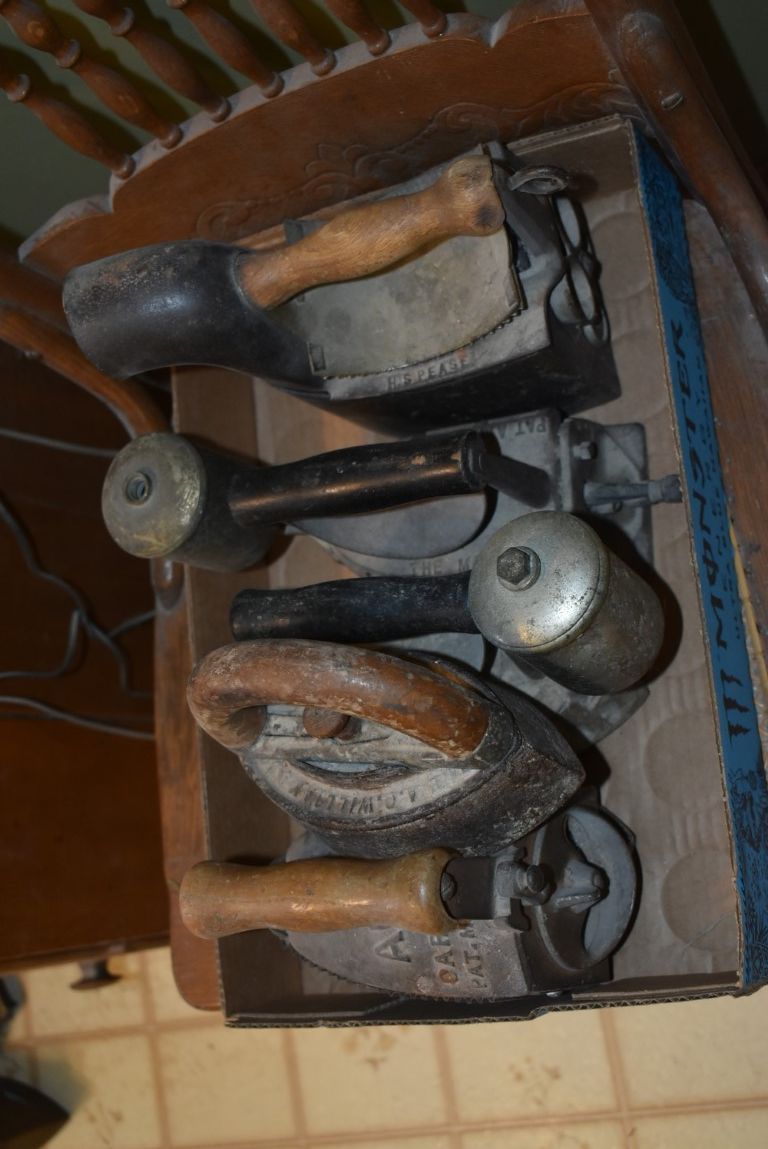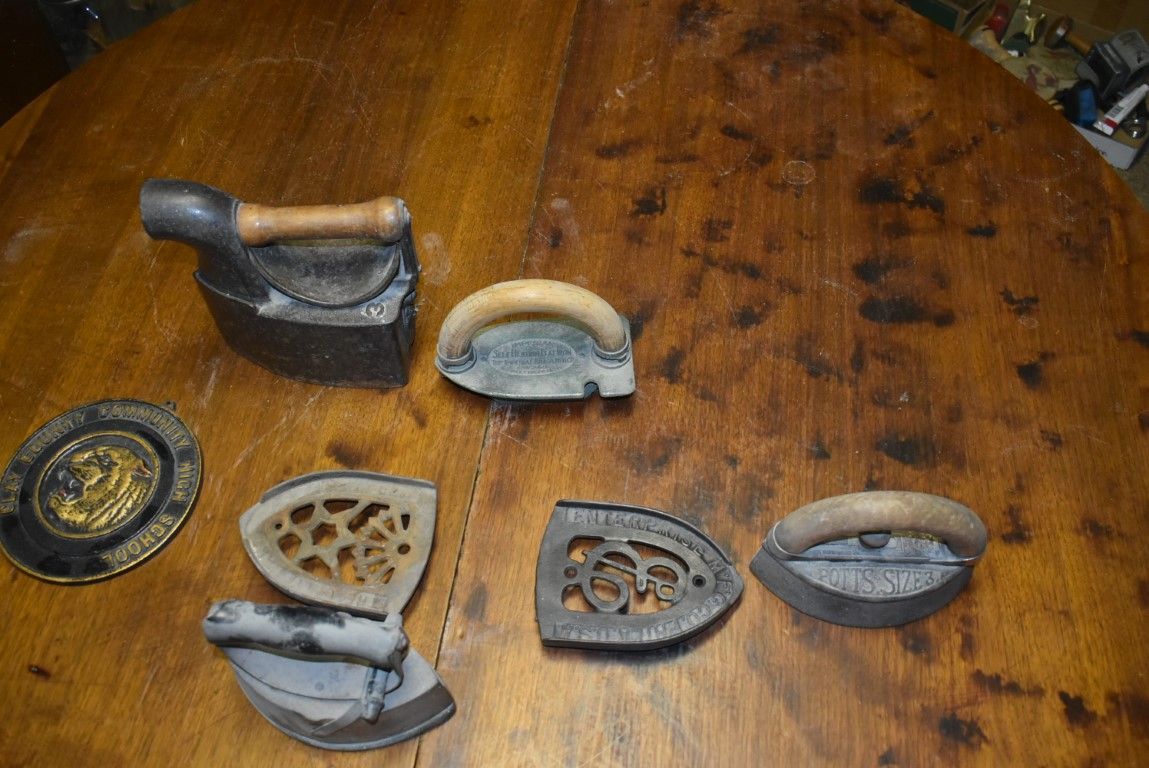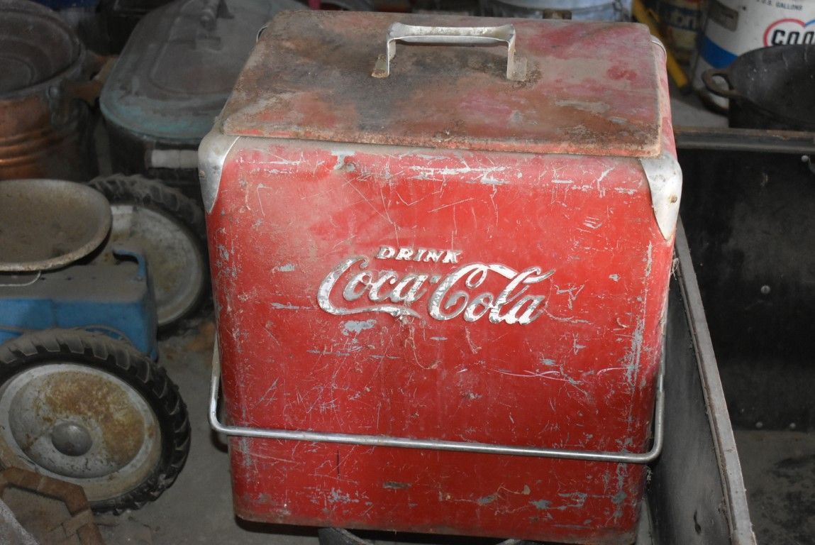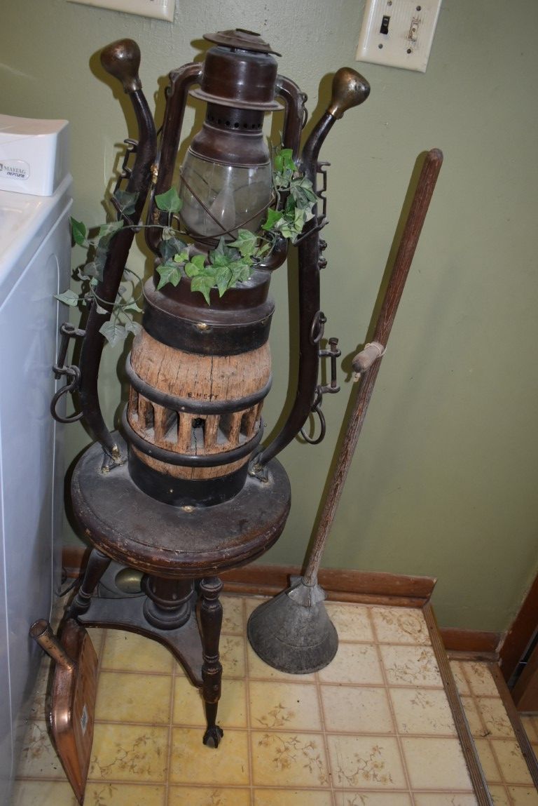Vintage & antique: Ford pedal tractor commander 5000, old style antique wooden barrel butter churn, 2-Vintage Convex glass oval framed pics of WW1 era pictures of soldiers, Several Gone with The Wind style parlor lamps, 9 plus oil lamps (3 cobalt blue glass Aladdin Lincoln drape oil lamps), vintage Holms stereoscope, Lots of stereoscope cards, Black box w/Vintage Keystone Monarch stereoscope and cards, 2 vintage wood boxes with brass hinges and handles (1- 11 3/4x7 1/4x7 ¾ & 1-15 3/4x 9 1/2x 9 ½), antique mantle clock Adamantine Black Gilbert w/Roman columns, gone with the wind hurricane lamp (white milk glass with scalloped edge and applied bronze floral details), Vintage hurricane kerosene lamp, Marshall Ferdinand FOCH supreme allied picture 1918, General Pershing picture, glass Turkey candy dishes Amethyst & Amberina, Antique shaving kits, large assortment of sad irons, pair of vintage ice block tongs, Vintage white and gray reined marble mortar & Pestle set & Salt & Pepper set, engraved tank shell 33 T & 4”, Vintage toy machine gun, A variety of glass hens on nest and Roosters- 22 plus, African tribal war club, Cast iron piggy banks, vintage washboards, glass insulators, antique Cyclone seeder, Galvanized tubs and buckets, Brass tubs, Lg crosscut saw 64”, Antique hay knife, large artillery shells, old rocks, vintage Coca-Cola cooler, large ice block tongs, vintage egg basket, Copper boiler tubs, Wood ammo boxes, Advertising 5 gal cans (Sinclair, Champlin, Coop), Copper bucket, antique western flyer trike, American No 8 Griswold waffle iron, Printers Tray shadow box, Advertising Bricks (Ghostawn, Columbus, Buffville Ks, Caney), Vintage #88 Malden Mass. Oil can, old wagon hubs 50 inch wheels, 2 cauldron pots – 36” & 24”, Pair of Cupid oval framed pics (Cupid Asleep & Cupid Awake), vintage needle point petit point footstool, ornate gilded antique turntable Columbia masterworks, antique school desk, Antique photo album with brass latches, Christmas Nutcracker(drummer boy), over 40 Nutcrackers, old scales, Cast Indian chief bank,