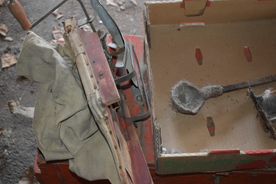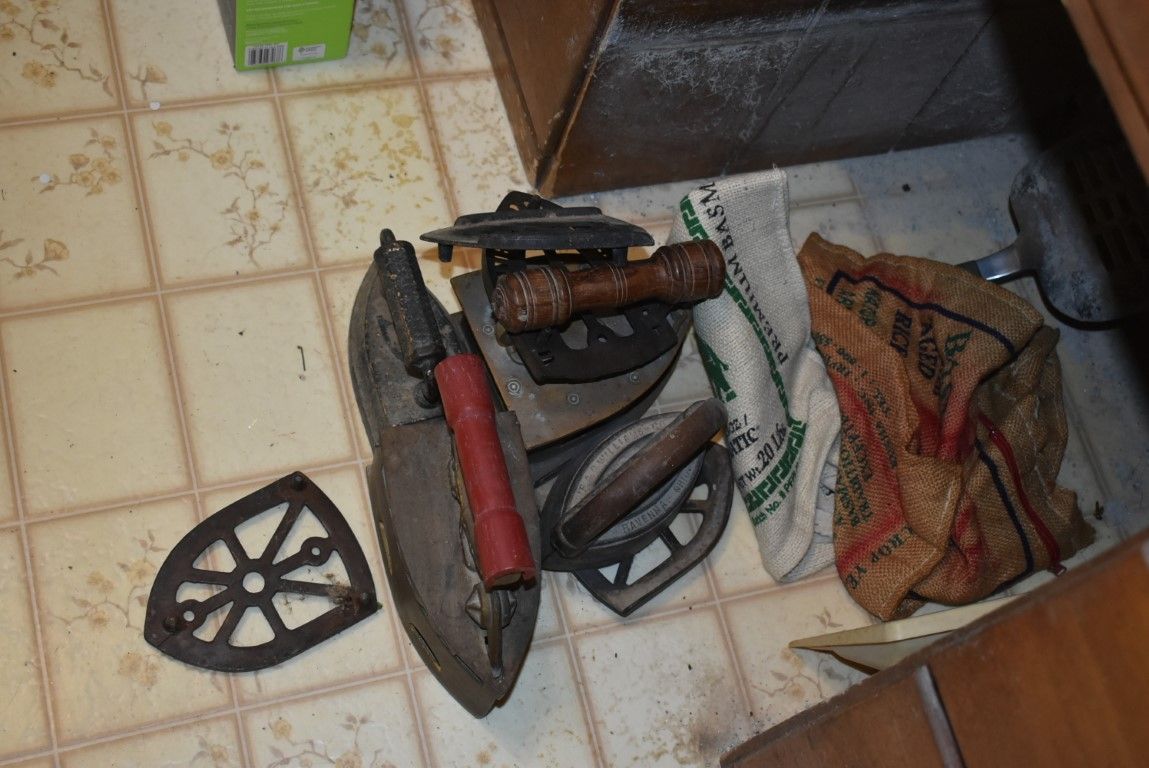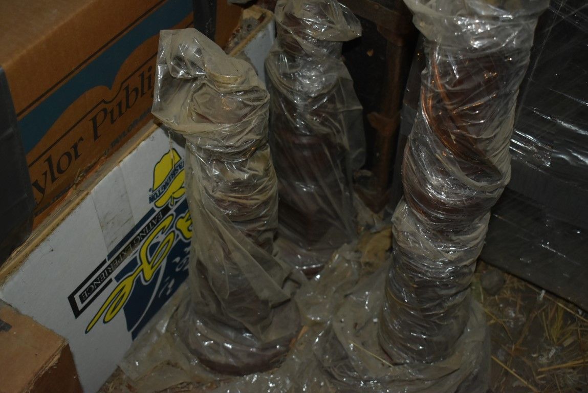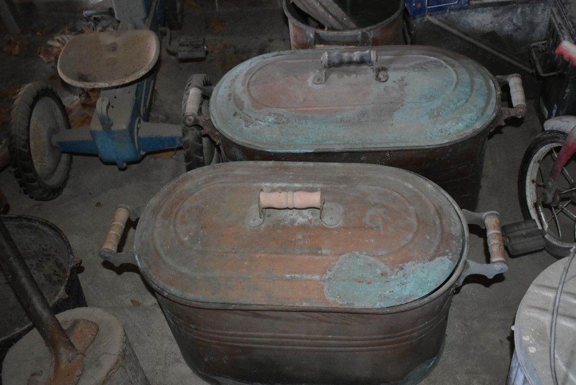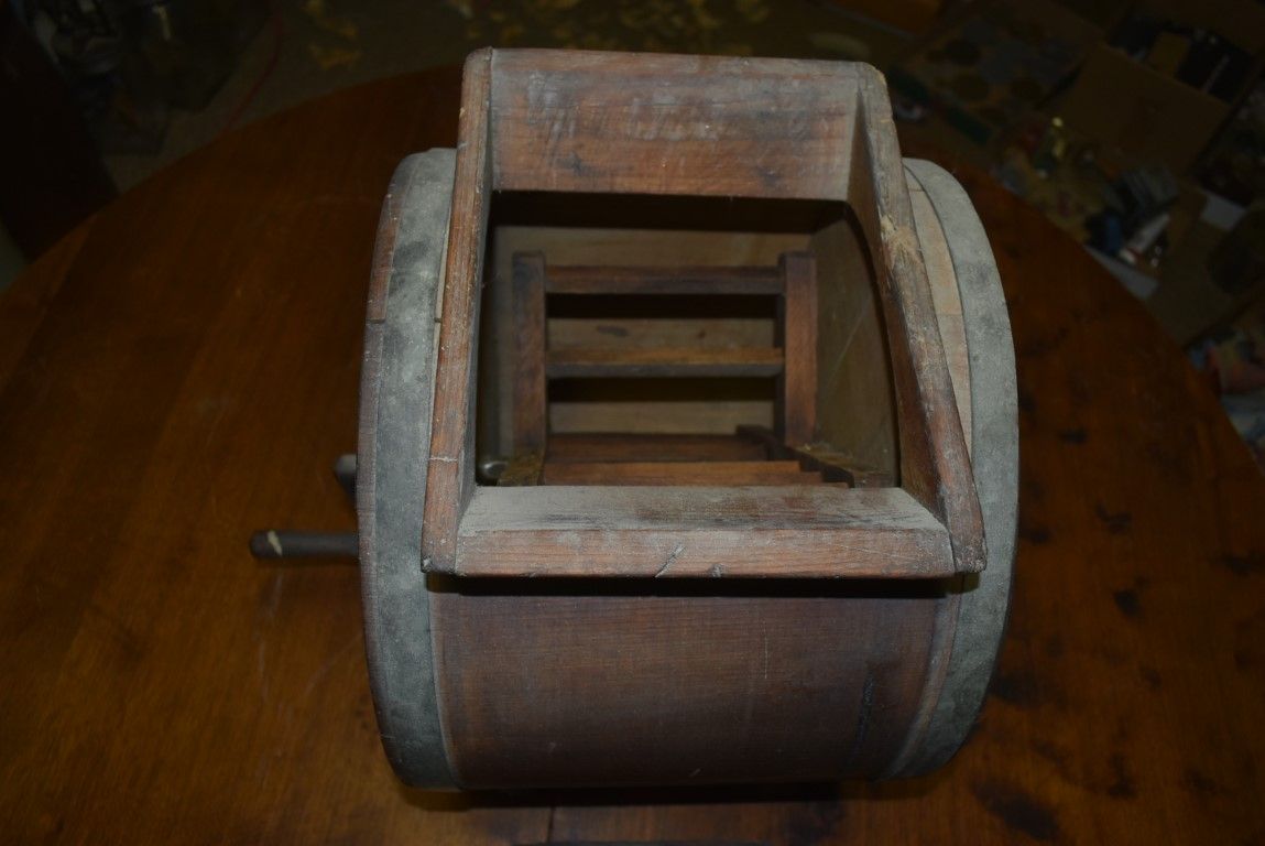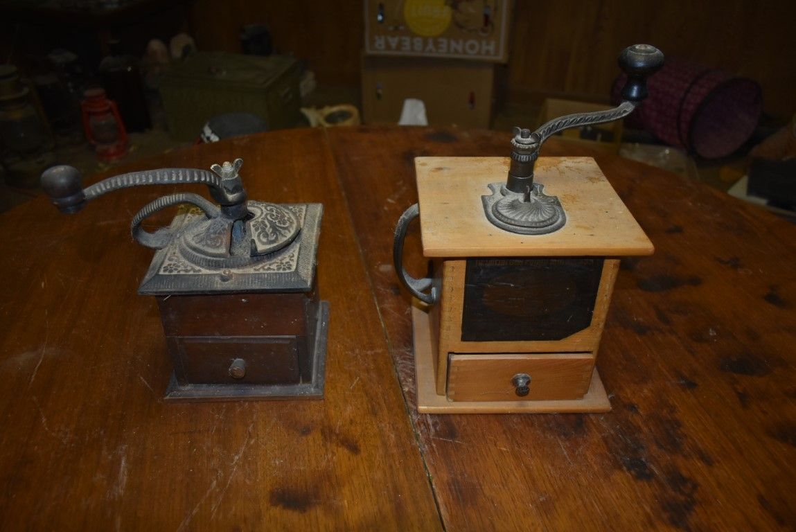 Vintage & antique: Ford pedal tractor commander 5000, old style antique wooden barrel butter churn, 2-Vintage Convex glass oval framed pics of WW1 era pictures of soldiers, Several Gone with The Wind style parlor lamps, 9 plus oil lamps (3 cobalt blue glass Aladdin Lincoln drape oil lamps), vintage Holms stereoscope, Lots of stereoscope cards, Black box w/Vintage Keystone Monarch stereoscope and cards, 2 vintage wood boxes with brass hinges and handles (1- 11 3/4x7 1/4x7 ¾ & 1-15 3/4x 9 1/2x 9 ½), antique mantle clock Adamantine Black Gilbert w/Roman columns, gone with the wind hurricane lamp (white milk glass with scalloped edge and applied bronze floral details), Vintage hurricane kerosene lamp, Marshall Ferdinand FOCH supreme allied picture 1918, General Pershing picture, glass Turkey candy dishes Amethyst & Amberina, Antique shaving kits, large assortment of sad irons, pair of vintage ice block tongs, Vintage white and gray reined marble mortar & Pestle set & Salt & Pepper set, engraved tank shell 33 T & 4”, Vintage toy machine gun, A variety of glass hens on nest and Roosters- 22 plus, African tribal war club, Cast iron piggy banks, vintage washboards, glass insulators, antique Cyclone seeder, Galvanized tubs and buckets, Brass tubs, Lg crosscut saw 64”, Antique hay knife, large artillery shells, old rocks, vintage Coca-Cola cooler, large ice block tongs, vintage egg basket, Copper boiler tubs, Wood ammo boxes, Advertising 5 gal cans (Sinclair, Champlin, Coop), Copper bucket, antique western flyer trike, American No 8 Griswold waffle iron, Printers Tray shadow box, Advertising Bricks (Ghostawn, Columbus, Buffville Ks, Caney), Vintage #88 Malden Mass. Oil can, old wagon hubs 50 inch wheels, 2 cauldron pots – 36” & 24”, Pair of Cupid oval framed pics (Cupid Asleep & Cupid Awake), vintage needle point petit point footstool, ornate gilded antique turntable Columbia masterworks, antique school desk, Antique photo album with brass latches, Christmas Nutcracker(drummer boy), over 40 Nutcrackers, old scales, Cast Indian chief bank,