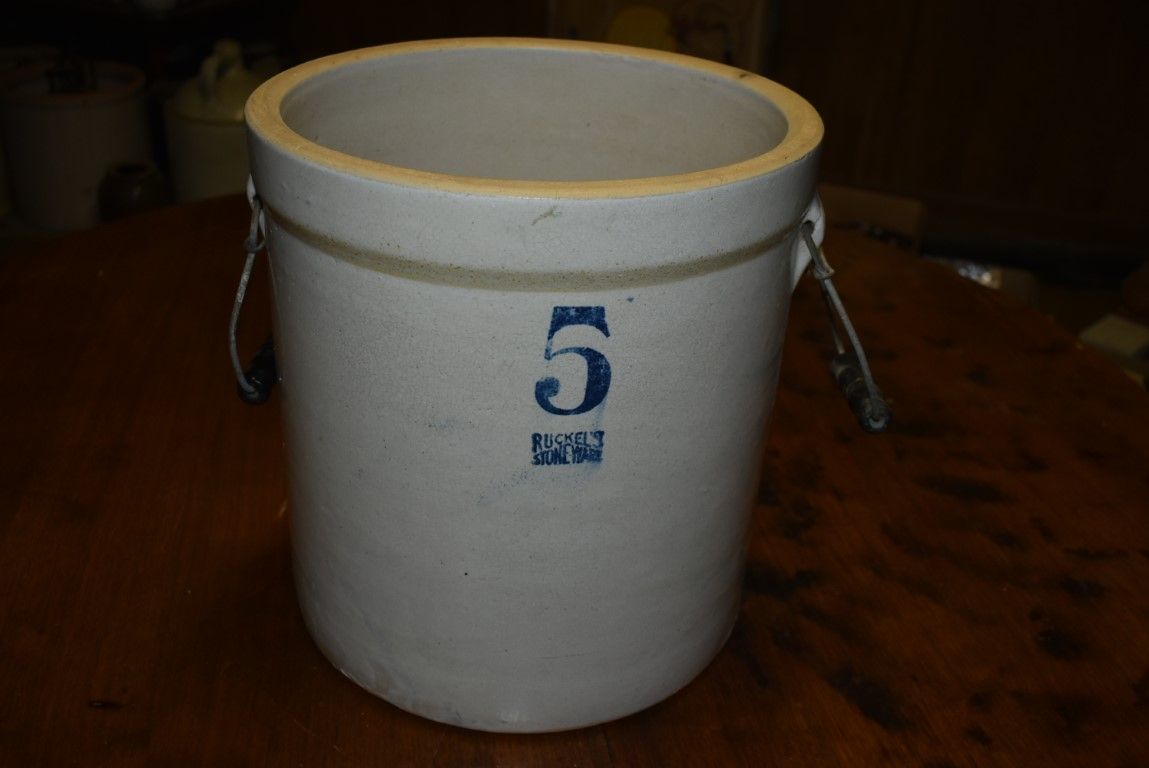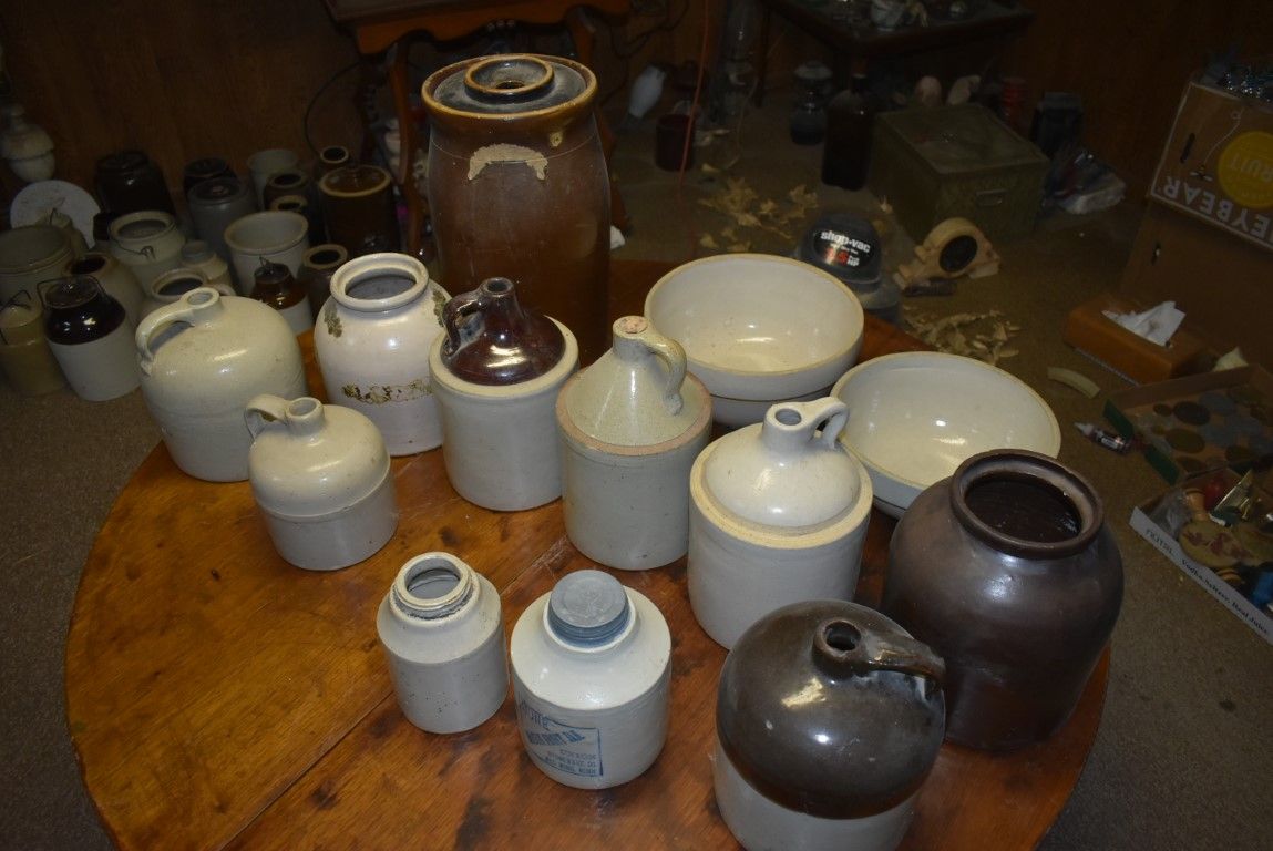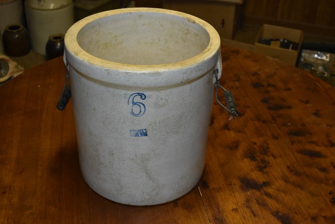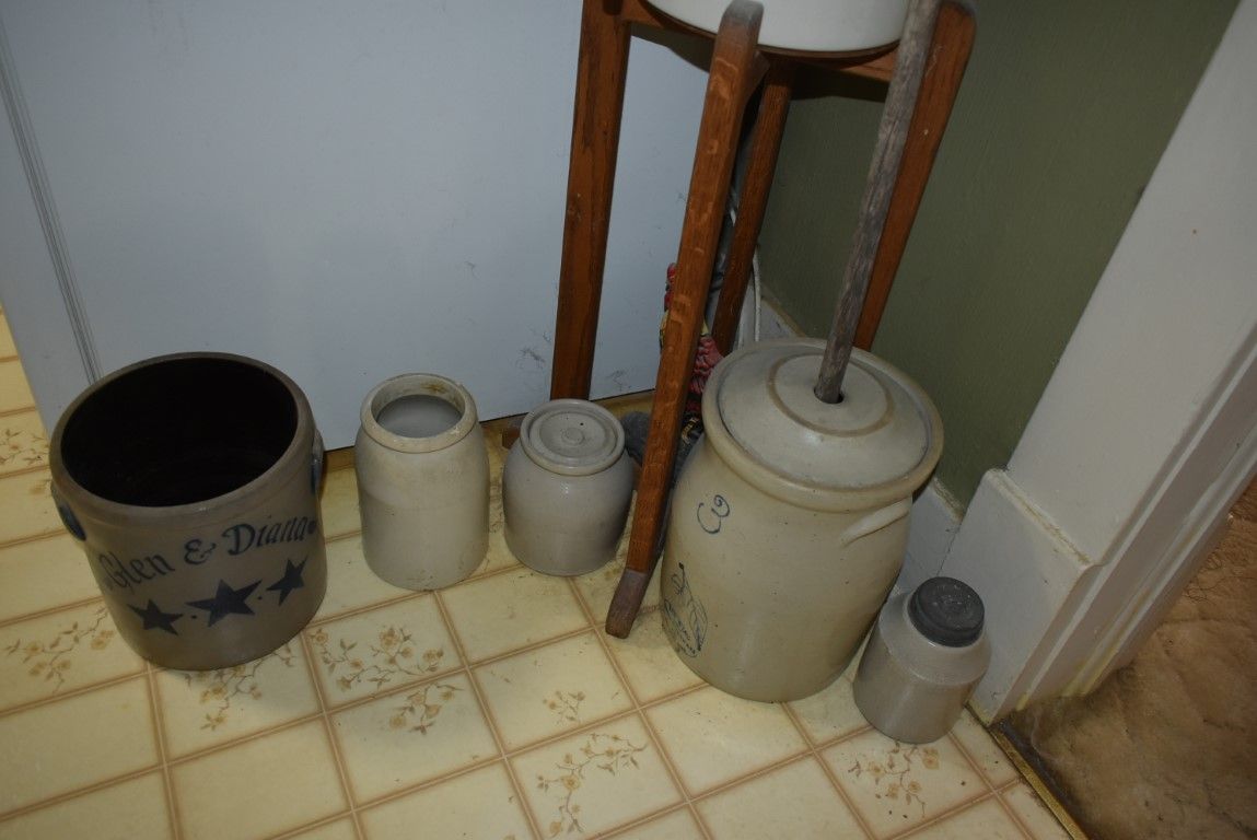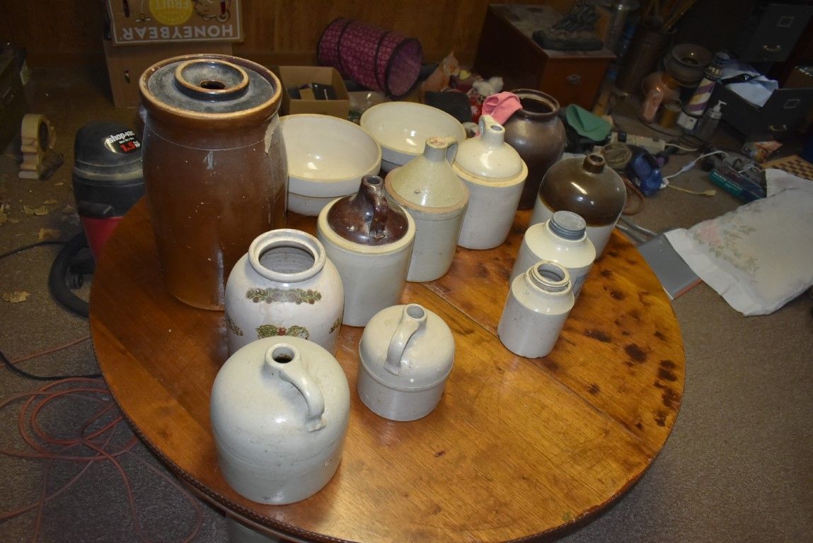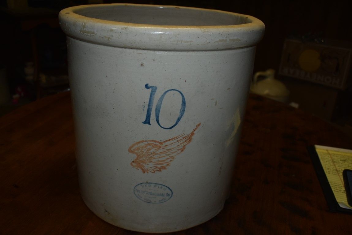 Crocks: Over 50 stoneware Crocs 3 gallon Red Wing butter churns, Half gallon and quart, 6 gallon Ruckles with handles, 8 gallon Robinson Ransbottom, 10 gallon Nelson McCoy, 5 gallon Ruckles with handles, 5 gallon Pittsburgh, 4 gallon Pittsburgh, 10 gallon Red Wing, 6 gallon Red Wing, 10 gallon Pittsburgh with handles, 12 gallon Redwing, 3 gal Whitehall, 3 gallon Red Wing, 4 gallon Red Wing with handles, 2 gallon Red Wing, 3 gallon western whiskey jug, 3 gallon blue ribbon jug, 2-2 gallon jugs, 5 gallon Red Wing jug with Waconda springs water label, Glagner & Barzen whiskey jug, Otter Blue Ribbon 1 gal whiskey jug, 1 gal The Dairy Supply Co. advertising jug, 1 & 2 gal beehive jugs, 5 gal UHL whiskey jug, 2 gal Western butter churn crock, 1 gal Redwing KO-REC Feeder, Western Buttermilk feeder & poultry 1 qt waterer, Redwing Mason Fruit jug, lots of other stoneware crocks, 3 butter churn jars with wood paddles (Daisey #40, Dazey #20 & 4qt jar), Daisy cobalt blue butter churn set with two cream mixers, Lots of other crocks & jugs