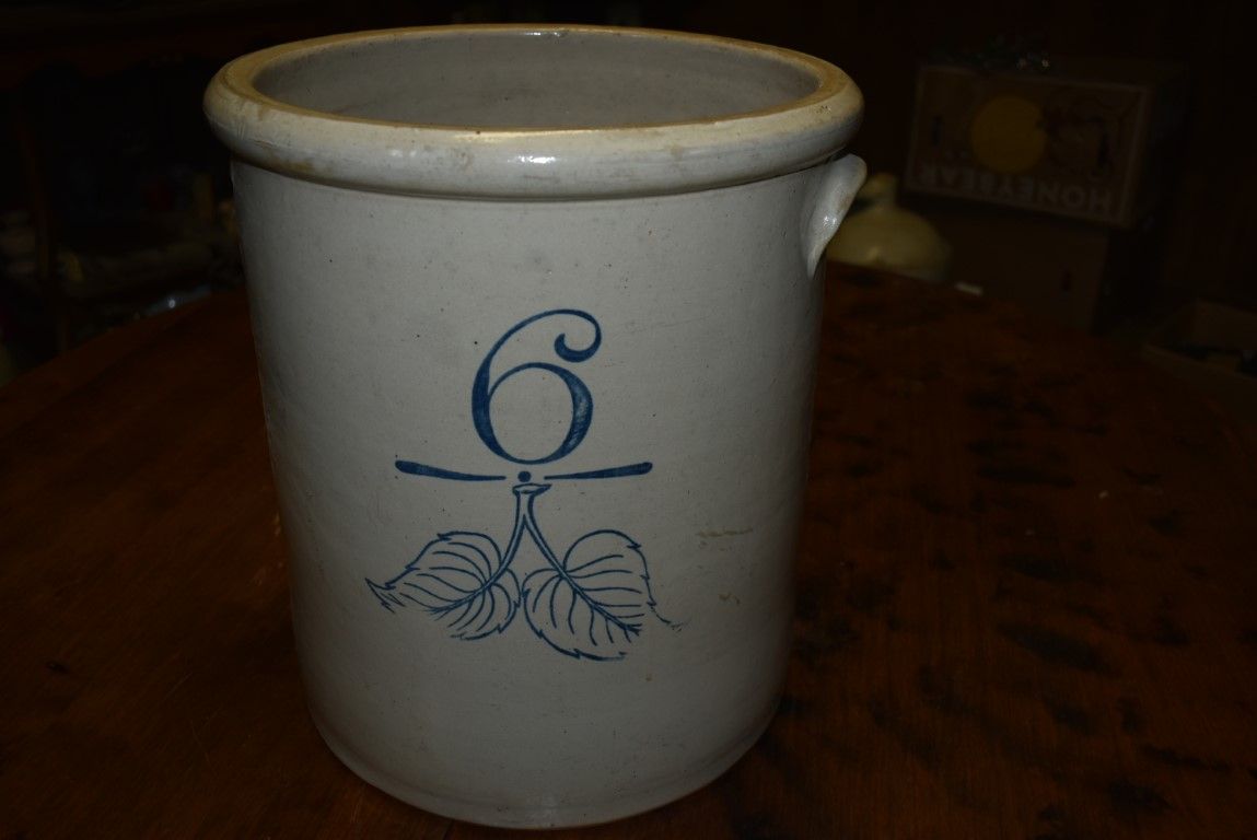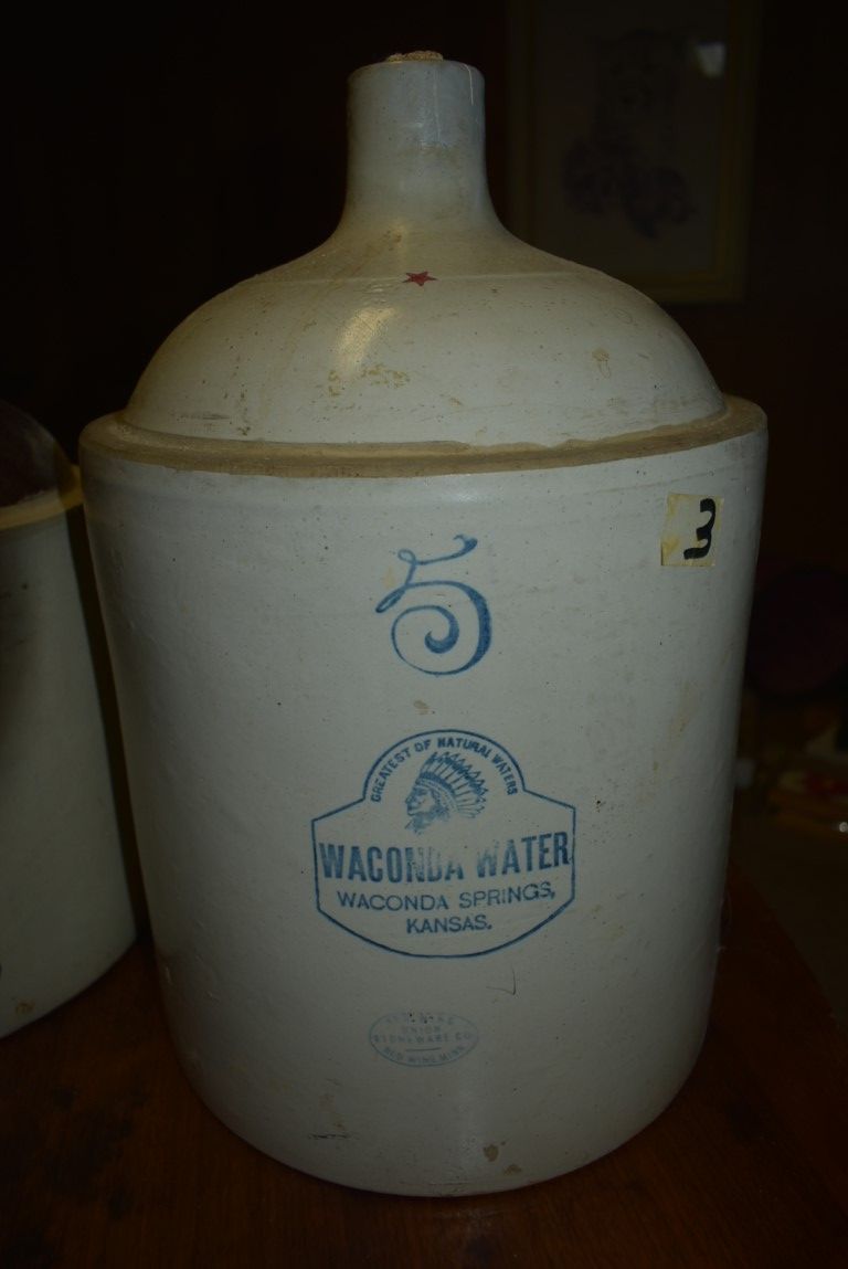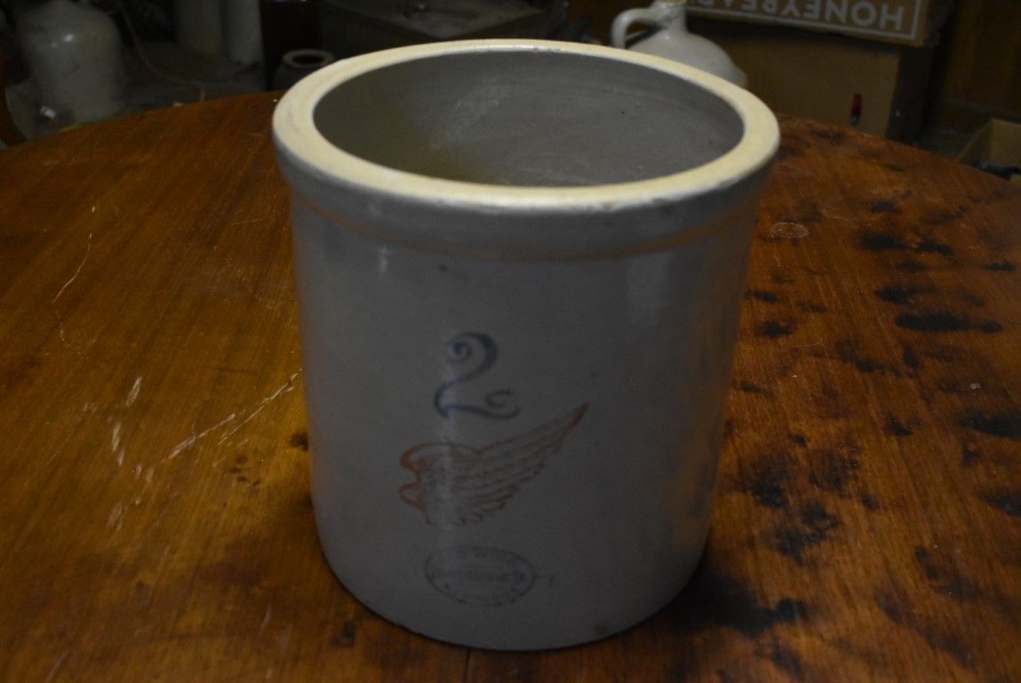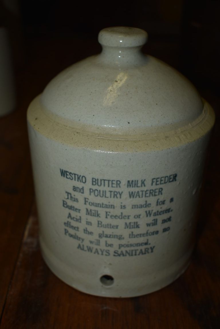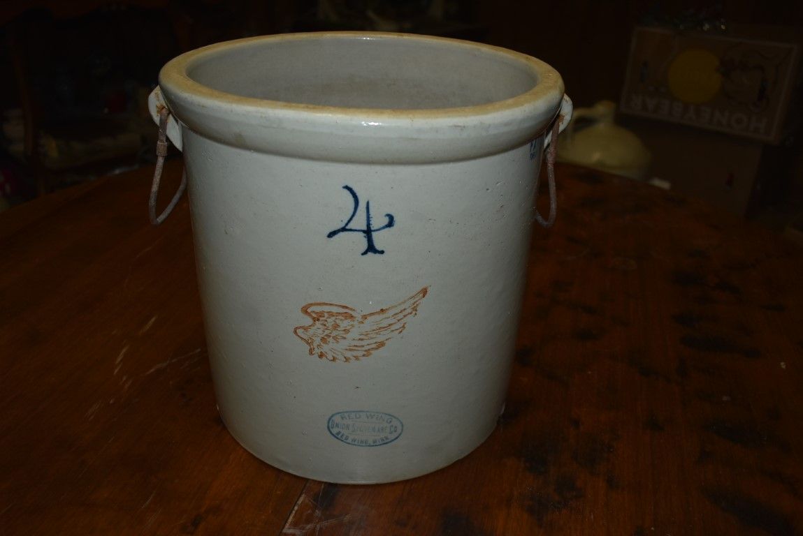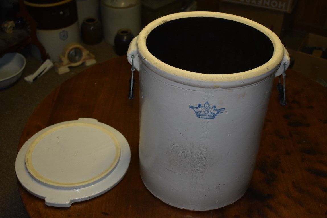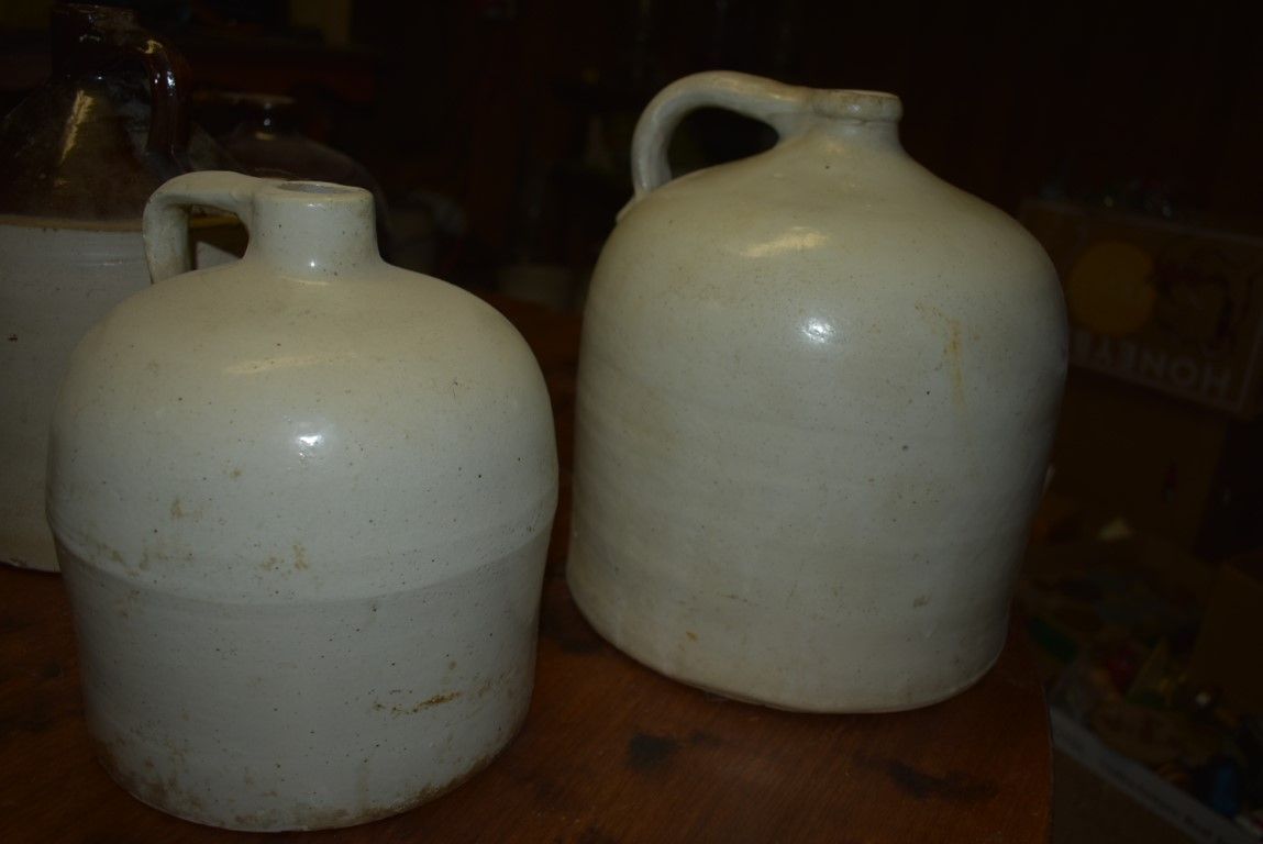 Crocks: Over 50 stoneware Crocs 3 gallon Red Wing butter churns, Half gallon and quart, 6 gallon Ruckles with handles, 8 gallon Robinson Ransbottom, 10 gallon Nelson McCoy, 5 gallon Ruckles with handles, 5 gallon Pittsburgh, 4 gallon Pittsburgh, 10 gallon Red Wing, 6 gallon Red Wing, 10 gallon Pittsburgh with handles, 12 gallon Redwing, 3 gal Whitehall, 3 gallon Red Wing, 4 gallon Red Wing with handles, 2 gallon Red Wing, 3 gallon western whiskey jug, 3 gallon blue ribbon jug, 2-2 gallon jugs, 5 gallon Red Wing jug with Waconda springs water label, Glagner & Barzen whiskey jug, Otter Blue Ribbon 1 gal whiskey jug, 1 gal The Dairy Supply Co. advertising jug, 1 & 2 gal beehive jugs, 5 gal UHL whiskey jug, 2 gal Western butter churn crock, 1 gal Redwing KO-REC Feeder, Western Buttermilk feeder & poultry 1 qt waterer, Redwing Mason Fruit jug, lots of other stoneware crocks, 3 butter churn jars with wood paddles (Daisey #40, Dazey #20 & 4qt jar), Daisy cobalt blue butter churn set with two cream mixers, Lots of other crocks & jugs