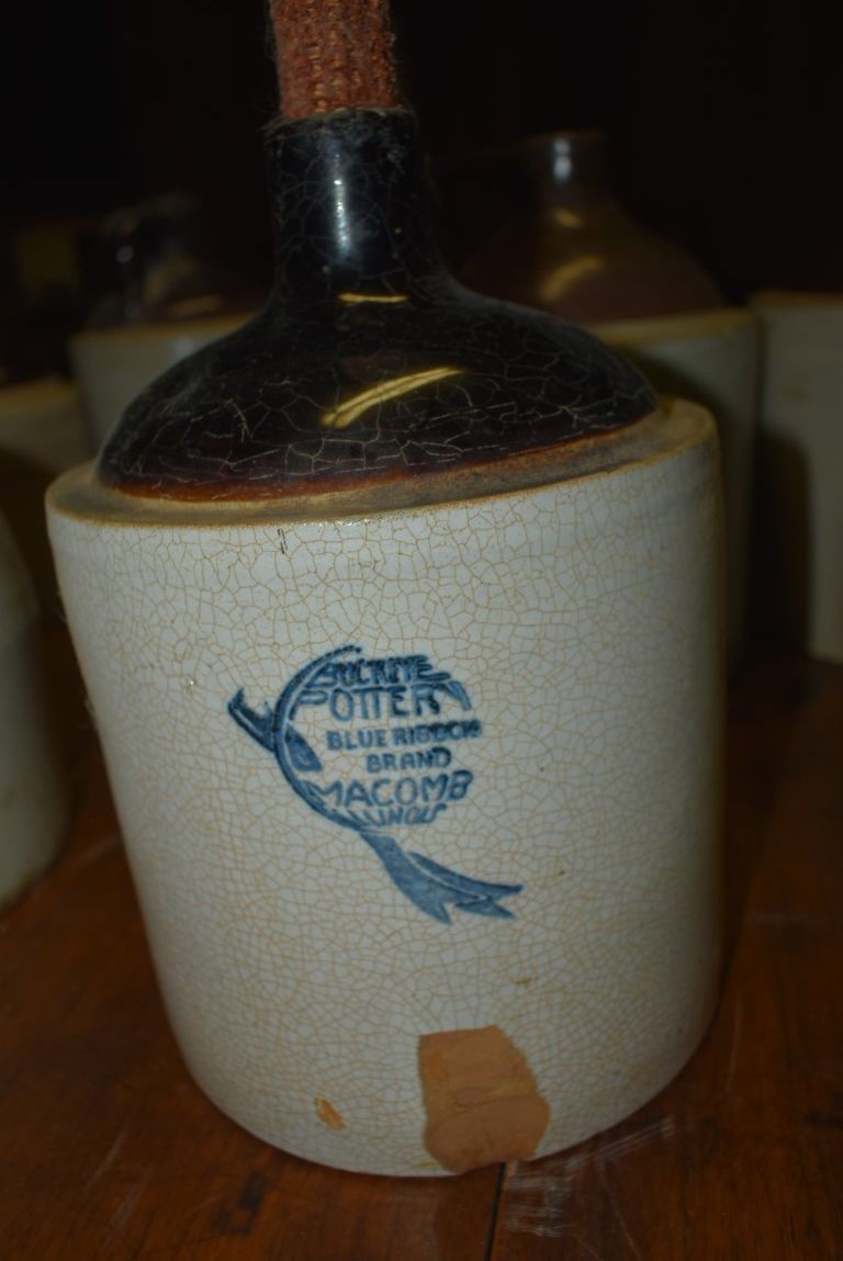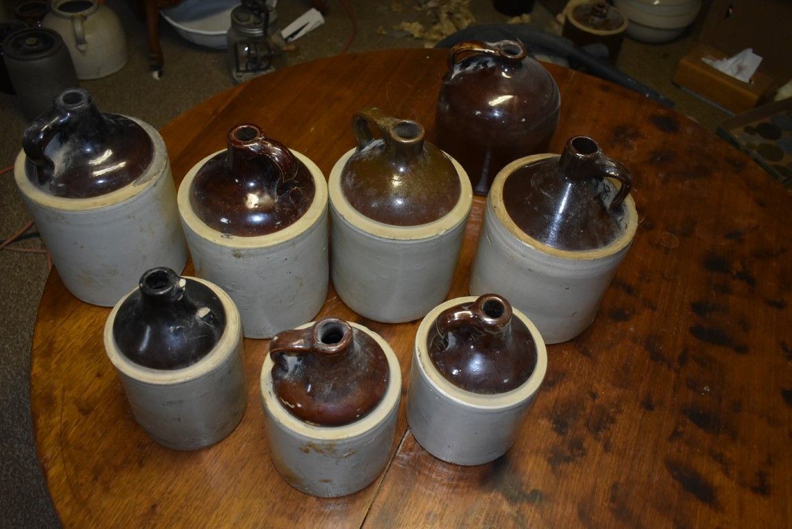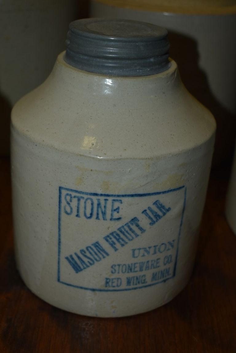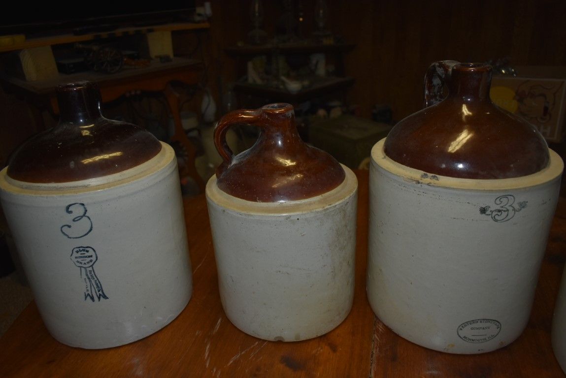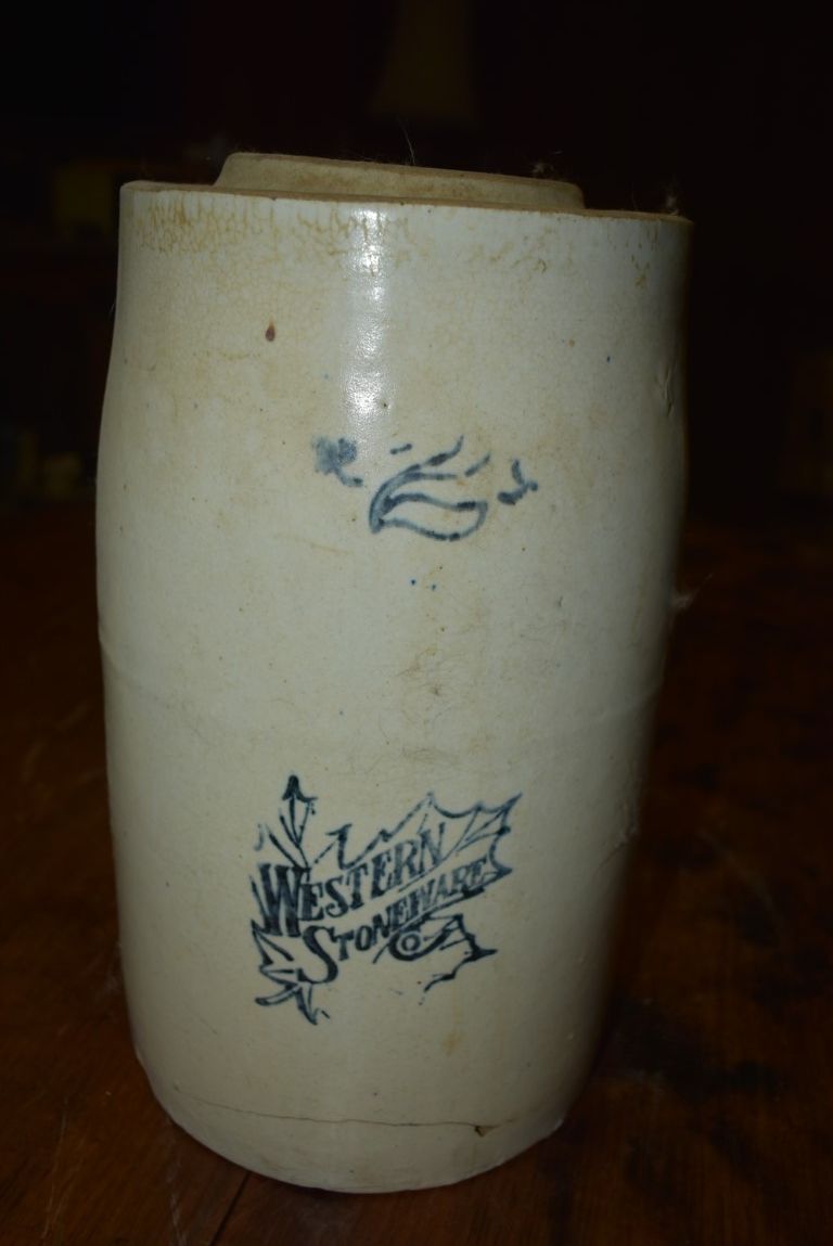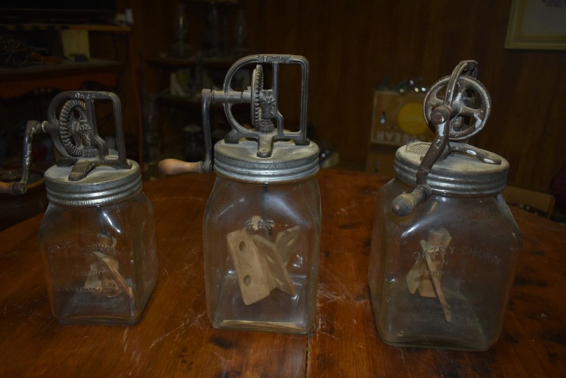 Crocks: Over 50 stoneware Crocs 3 gallon Red Wing butter churns, Half gallon and quart, 6 gallon Ruckles with handles, 8 gallon Robinson Ransbottom, 10 gallon Nelson McCoy, 5 gallon Ruckles with handles, 5 gallon Pittsburgh, 4 gallon Pittsburgh, 10 gallon Red Wing, 6 gallon Red Wing, 10 gallon Pittsburgh with handles, 12 gallon Redwing, 3 gal Whitehall, 3 gallon Red Wing, 4 gallon Red Wing with handles, 2 gallon Red Wing, 3 gallon western whiskey jug, 3 gallon blue ribbon jug, 2-2 gallon jugs, 5 gallon Red Wing jug with Waconda springs water label, Glagner & Barzen whiskey jug, Otter Blue Ribbon 1 gal whiskey jug, 1 gal The Dairy Supply Co. advertising jug, 1 & 2 gal beehive jugs, 5 gal UHL whiskey jug, 2 gal Western butter churn crock, 1 gal Redwing KO-REC Feeder, Western Buttermilk feeder & poultry 1 qt waterer, Redwing Mason Fruit jug, lots of other stoneware crocks, 3 butter churn jars with wood paddles (Daisey #40, Dazey #20 & 4qt jar), Daisy cobalt blue butter churn set with two cream mixers, Lots of other crocks & jugs