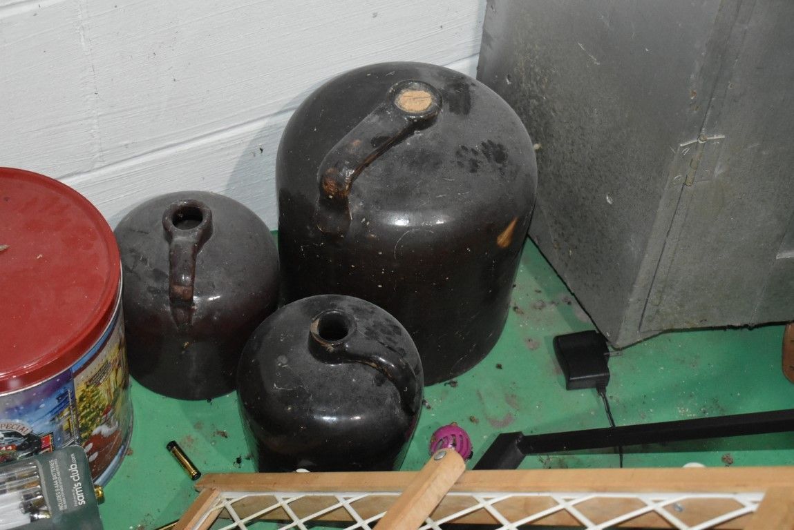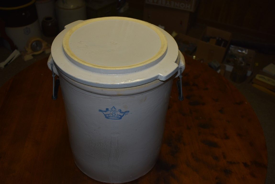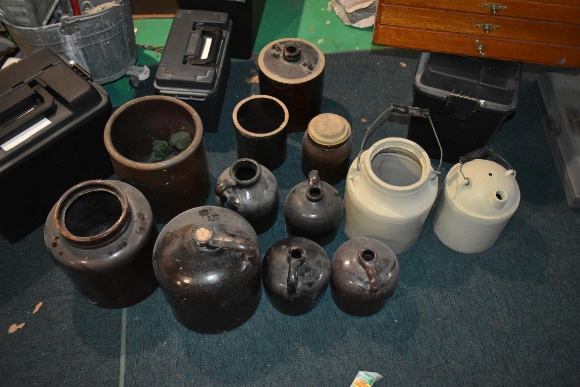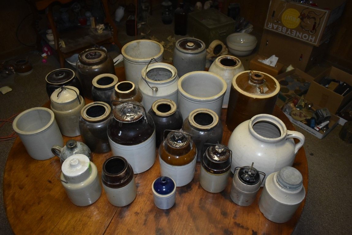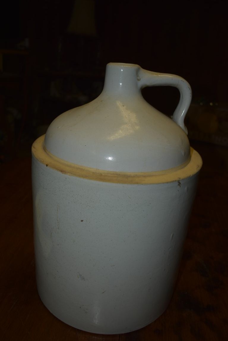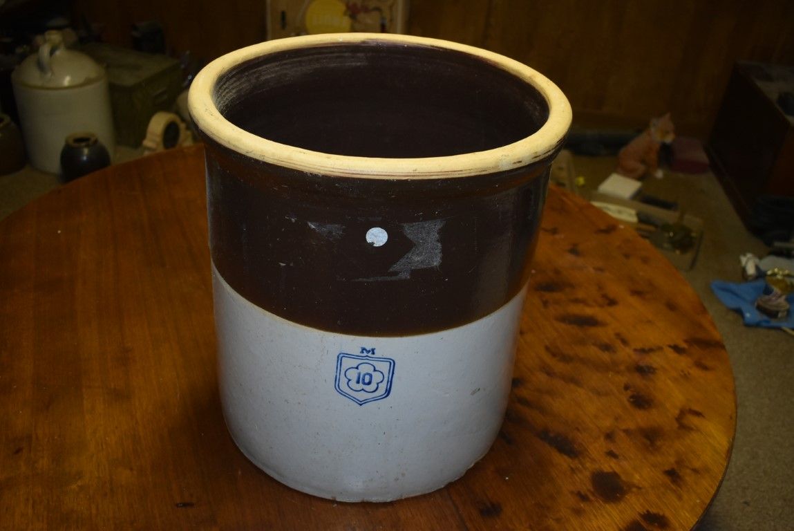 Crocks: Over 50 stoneware Crocs 3 gallon Red Wing butter churns, Half gallon and quart, 6 gallon Ruckles with handles, 8 gallon Robinson Ransbottom, 10 gallon Nelson McCoy, 5 gallon Ruckles with handles, 5 gallon Pittsburgh, 4 gallon Pittsburgh, 10 gallon Red Wing, 6 gallon Red Wing, 10 gallon Pittsburgh with handles, 12 gallon Redwing, 3 gal Whitehall, 3 gallon Red Wing, 4 gallon Red Wing with handles, 2 gallon Red Wing, 3 gallon western whiskey jug, 3 gallon blue ribbon jug, 2-2 gallon jugs, 5 gallon Red Wing jug with Waconda springs water label, Glagner & Barzen whiskey jug, Otter Blue Ribbon 1 gal whiskey jug, 1 gal The Dairy Supply Co. advertising jug, 1 & 2 gal beehive jugs, 5 gal UHL whiskey jug, 2 gal Western butter churn crock, 1 gal Redwing KO-REC Feeder, Western Buttermilk feeder & poultry 1 qt waterer, Redwing Mason Fruit jug, lots of other stoneware crocks, 3 butter churn jars with wood paddles (Daisey #40, Dazey #20 & 4qt jar), Daisy cobalt blue butter churn set with two cream mixers, Lots of other crocks & jugs