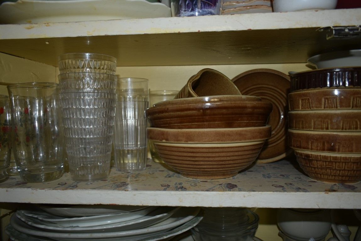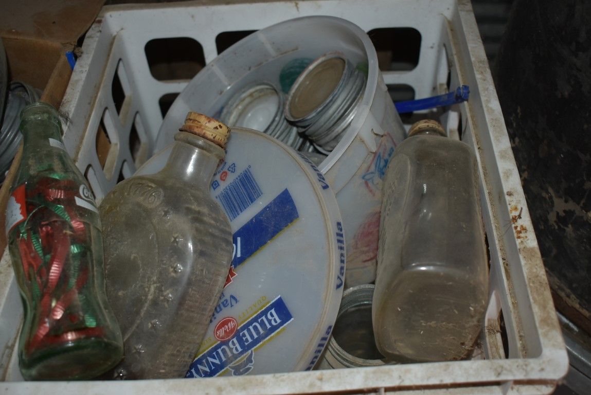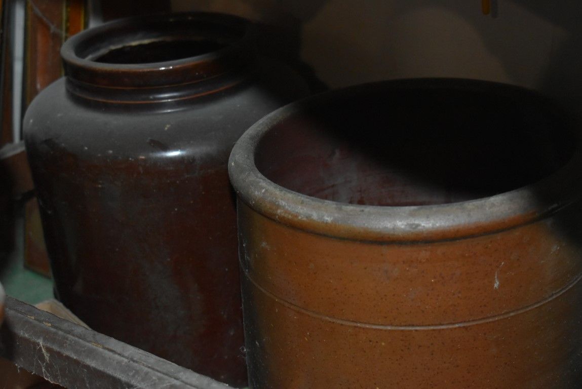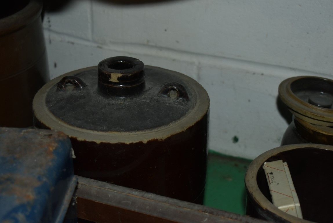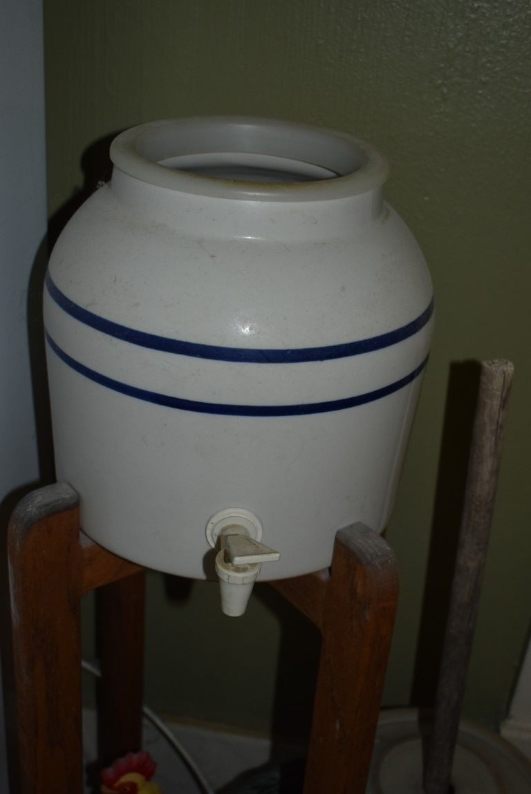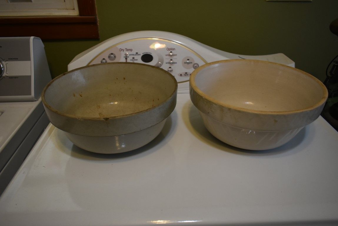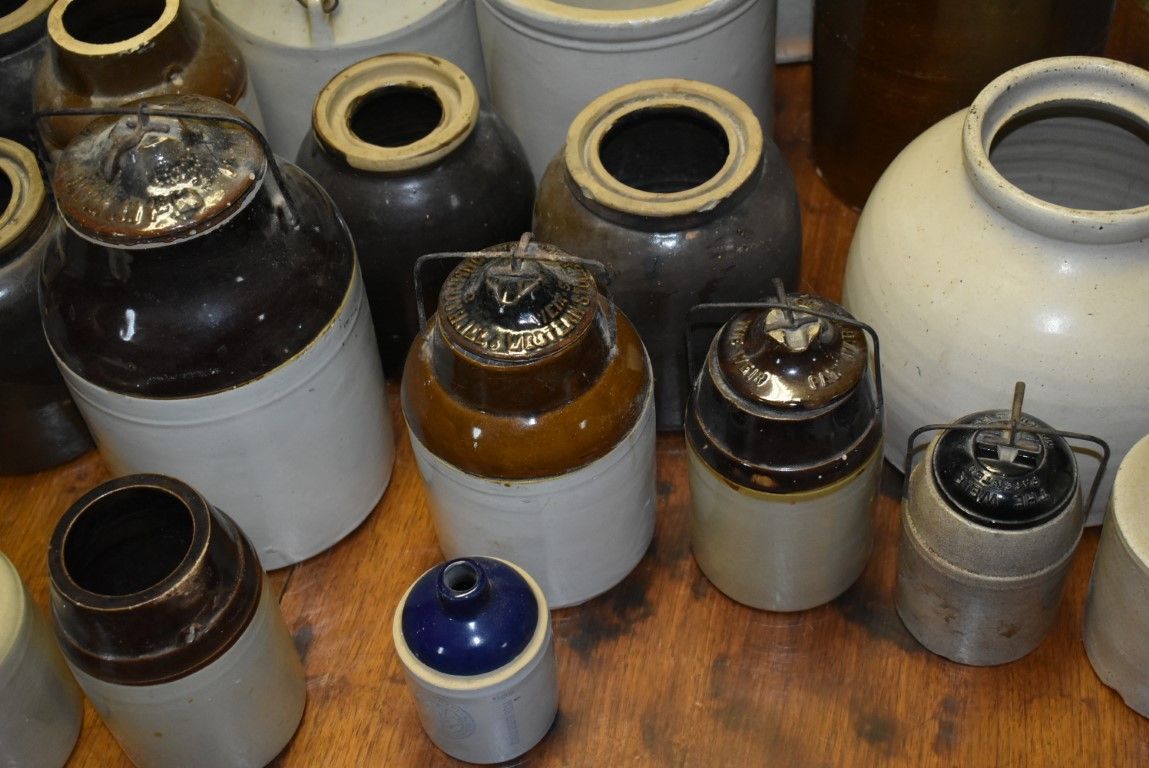 Crocks: Over 50 stoneware Crocs 3 gallon Red Wing butter churns, Half gallon and quart, 6 gallon Ruckles with handles, 8 gallon Robinson Ransbottom, 10 gallon Nelson McCoy, 5 gallon Ruckles with handles, 5 gallon Pittsburgh, 4 gallon Pittsburgh, 10 gallon Red Wing, 6 gallon Red Wing, 10 gallon Pittsburgh with handles, 12 gallon Redwing, 3 gal Whitehall, 3 gallon Red Wing, 4 gallon Red Wing with handles, 2 gallon Red Wing, 3 gallon western whiskey jug, 3 gallon blue ribbon jug, 2-2 gallon jugs, 5 gallon Red Wing jug with Waconda springs water label, Glagner & Barzen whiskey jug, Otter Blue Ribbon 1 gal whiskey jug, 1 gal The Dairy Supply Co. advertising jug, 1 & 2 gal beehive jugs, 5 gal UHL whiskey jug, 2 gal Western butter churn crock, 1 gal Redwing KO-REC Feeder, Western Buttermilk feeder & poultry 1 qt waterer, Redwing Mason Fruit jug, lots of other stoneware crocks, 3 butter churn jars with wood paddles (Daisey #40, Dazey #20 & 4qt jar), Daisy cobalt blue butter churn set with two cream mixers, Lots of other crocks & jugs
