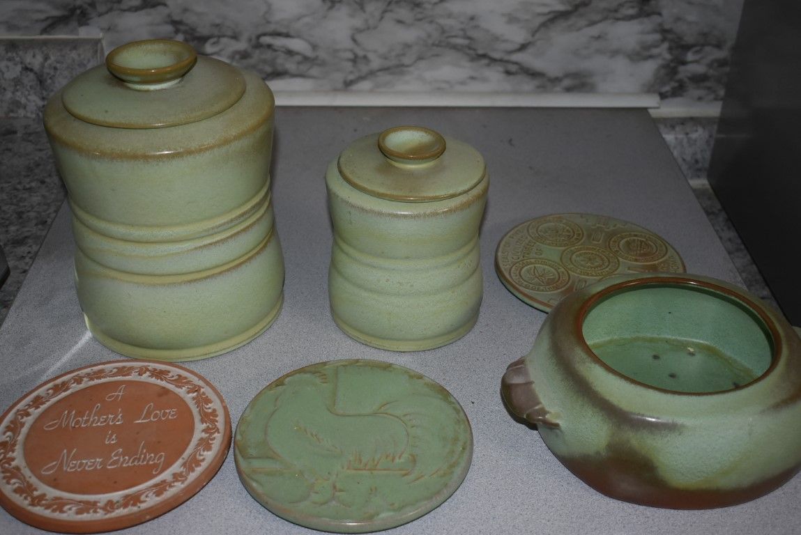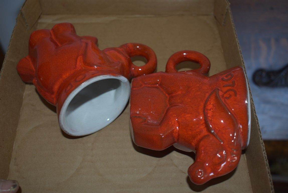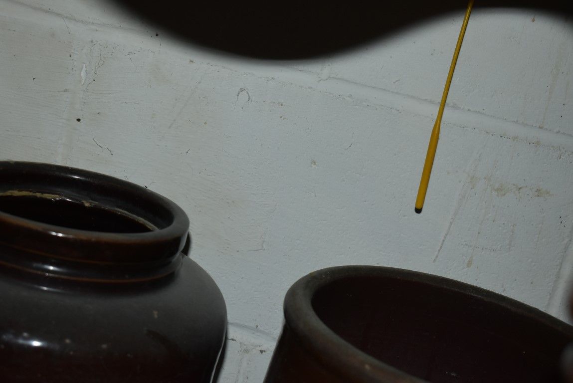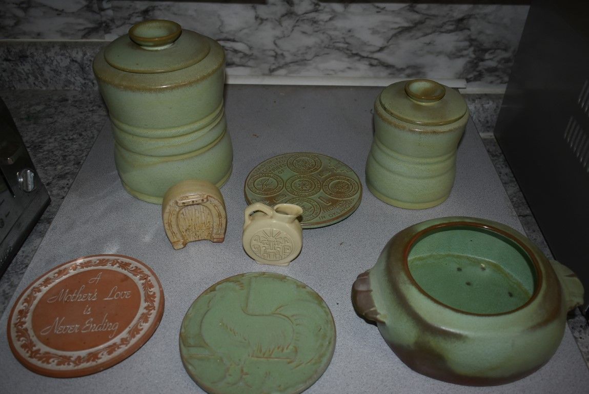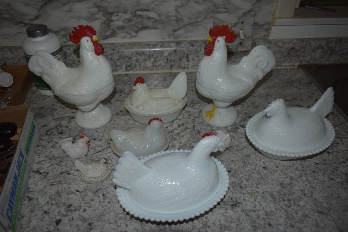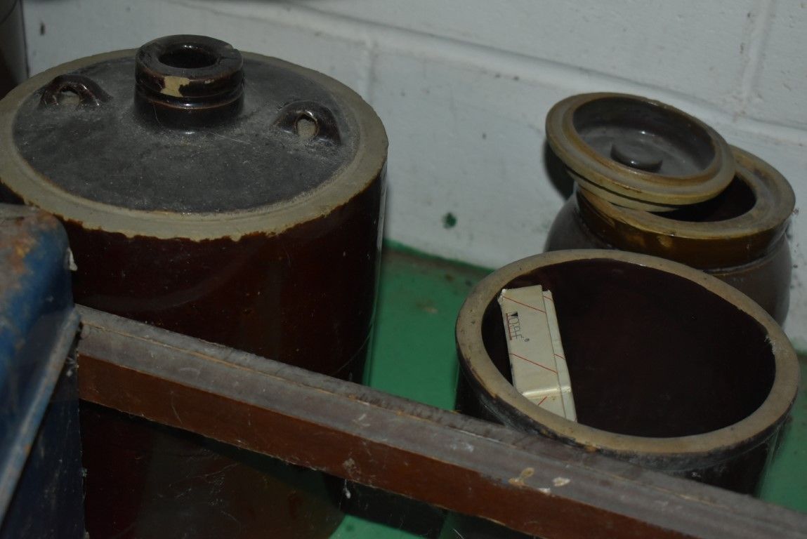 Crocks: Over 50 stoneware Crocs 3 gallon Red Wing butter churns, Half gallon and quart, 6 gallon Ruckles with handles, 8 gallon Robinson Ransbottom, 10 gallon Nelson McCoy, 5 gallon Ruckles with handles, 5 gallon Pittsburgh, 4 gallon Pittsburgh, 10 gallon Red Wing, 6 gallon Red Wing, 10 gallon Pittsburgh with handles, 12 gallon Redwing, 3 gal Whitehall, 3 gallon Red Wing, 4 gallon Red Wing with handles, 2 gallon Red Wing, 3 gallon western whiskey jug, 3 gallon blue ribbon jug, 2-2 gallon jugs, 5 gallon Red Wing jug with Waconda springs water label, Glagner & Barzen whiskey jug, Otter Blue Ribbon 1 gal whiskey jug, 1 gal The Dairy Supply Co. advertising jug, 1 & 2 gal beehive jugs, 5 gal UHL whiskey jug, 2 gal Western butter churn crock, 1 gal Redwing KO-REC Feeder, Western Buttermilk feeder & poultry 1 qt waterer, Redwing Mason Fruit jug, lots of other stoneware crocks, 3 butter churn jars with wood paddles (Daisey #40, Dazey #20 & 4qt jar), Daisy cobalt blue butter churn set with two cream mixers, Lots of other crocks & jugs