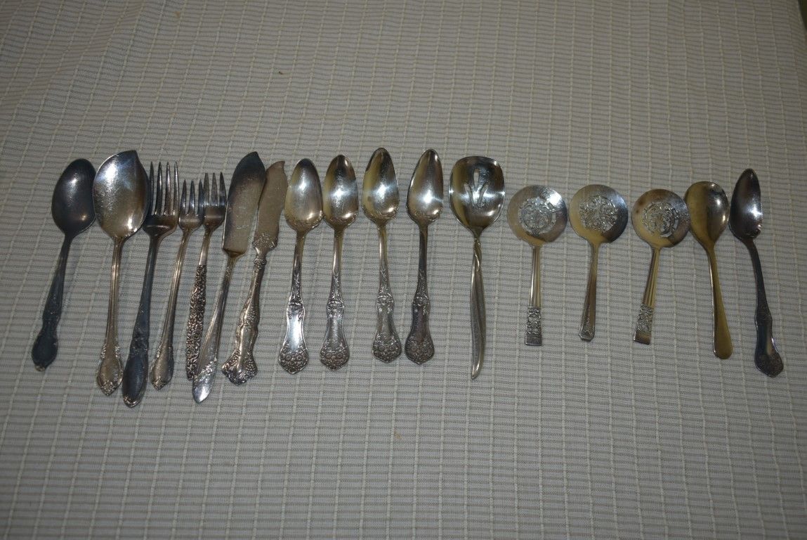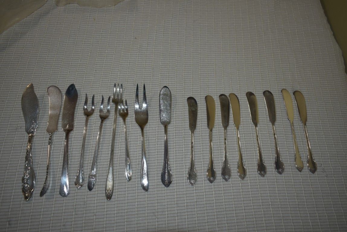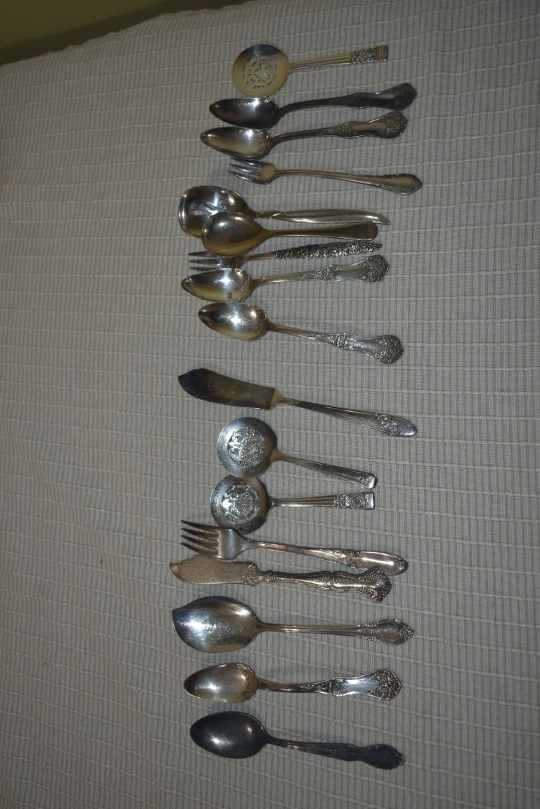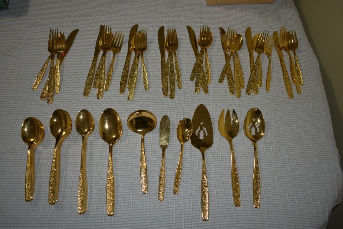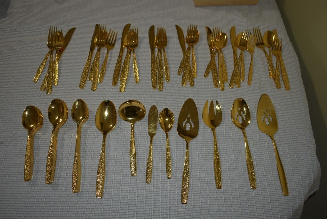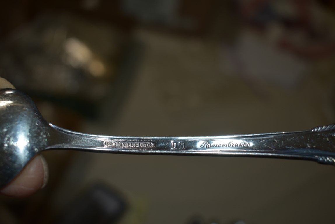 Silverware- Gold Plated silver ware from Rogers Cutlery Co. Complete setting of 8 along with accompanying place settings (20 total pieces), 12 Silver plated soup spoons 1847 Rogers Bros Remembrance, 15 Silver plated tea spoons 1847 Rogers Bros Remembrance, 15 Silver plated miscellaneous of (Community Plate Bon Bon, Shefield England, WM Rogers, 1847 Rogers, Tudor Plate Oneida Community), 9 pc mixed silver plated Holms & Edwards & 1847 Rogers Bros., 10 pc mixed silver plated (9-1847 Rogers Bros IS Remembrance, 1-Community Plate), 4pc (1 Butter knife Rogers Nickel Silver, 1 spoon stamped 99 sterling on the back and Detroit on the front, 1 Fork Pat. Sept 11 06 Rogers Nickel Silver, 1 Cocktail fork Royal Saxony Silver plate), 9 pc (2 International Deep Silver, 5 Holmes Edward IS Deep Silver, 1 1847 Rogers Bros IS Remembrance, 1 Glastonbury Silver plated), 10 pc long handled spoons 1847 Rogers Bros IS Remembrance, 17 pc (1-Cocktail fork 1847 Rogers Bros First Love, 1 long handled fork Lady Doris Silver Plate, 1- butter spreader Patd Sterling Frontenac Pattern, 1-butter knife 1847 Roger Bros AI, 1-Community Plate butter knife, 1-Olive Fork 1847 Rogers Bros., 1-Seafood fork WM Rogers, 1-Pickle fork Holmes & Edwards, 1-Butter spread knife 1847 Rogers Bros, 8 Butter knifes 1847 Rogers Bros., 12 Kitchen Knives stainless, 5 pc (1-Oneida 1881 Rogers pie server, 1-Pierced serving spoon Stainless community, 1-Stainless Pie server, 1-stainless Norwegian cheese slicer rose pattern, 1-Community stainless pierced serving spoon Rose pattern, 12 forks silver plated 1847 Rogers IS Remembrance, 10 spoons (2-Bilchrome Sheffield England pastry spoon, 2-WM Rogers & son IS, 2-1847 Rogers Bros Stainless, 1-International Silver Company PAA Exclusive, 1International Deep Silver, 1-1847 Rogers Bros IS First Love, 1-1847 Rogers Bros IS Remembrance), 12 silver plated forks 1847 Rogers Bros IS Remembrance,