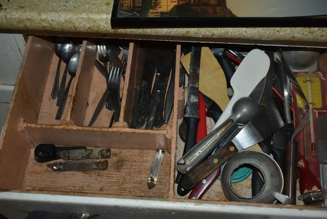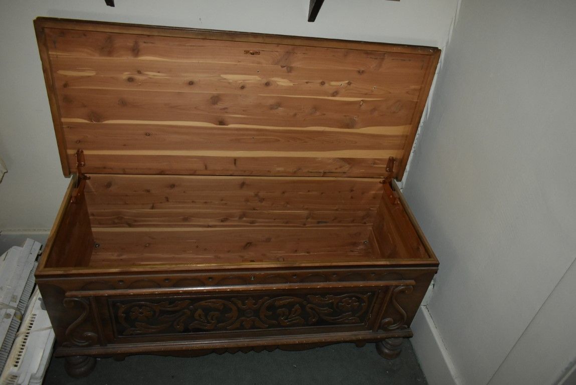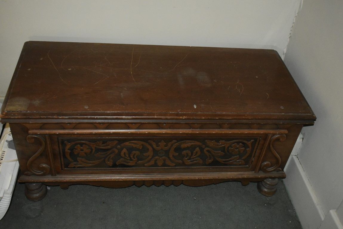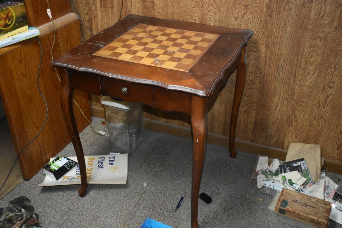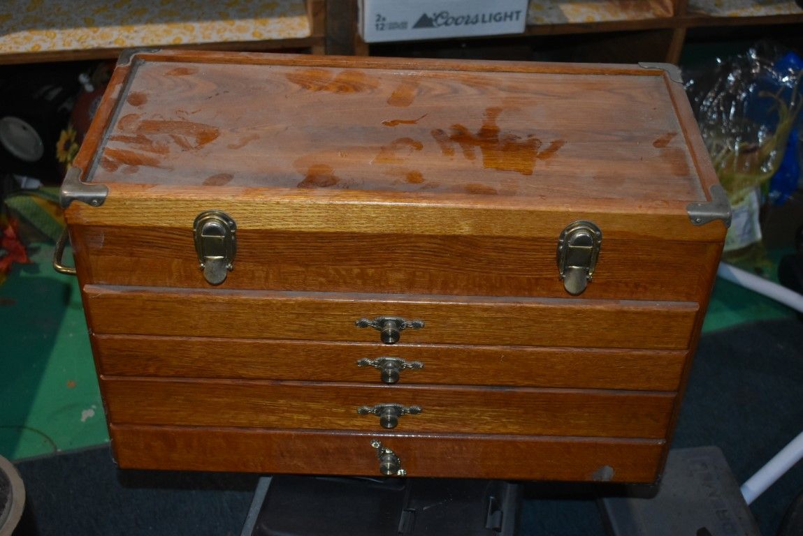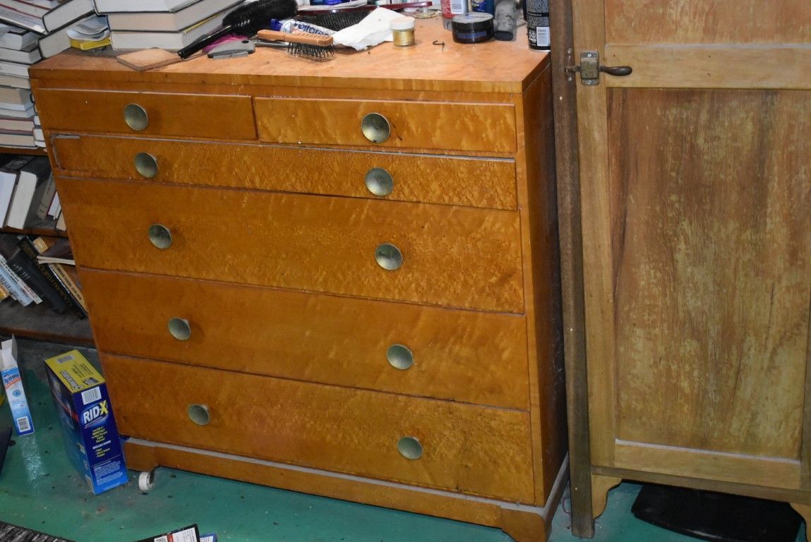 Appliances & Furniture: Maytag upright freezer, stainless refrigerator, chest deep freezer 73 by 28, stainless Whirlpool refrigerator, RCA refrigerator, 31 inch flat screen Toshiba TV, 50” flat screen TV, 55” flat screen TV, three drawer dresser with large mirror, dark wood rocker, wood gun cabinet, drop leaf kitchen table with Leaf’s, Full vintage headboard w/queen box springs and mattress, Blue painted 5 drawer dresser, Wood wash basin, Cedar Chest 45Lx14Dx20T, wood cedar chest 46Lx19Tx17D with shelf, 4 tier wood bookcase 69Tx25Wx11D,