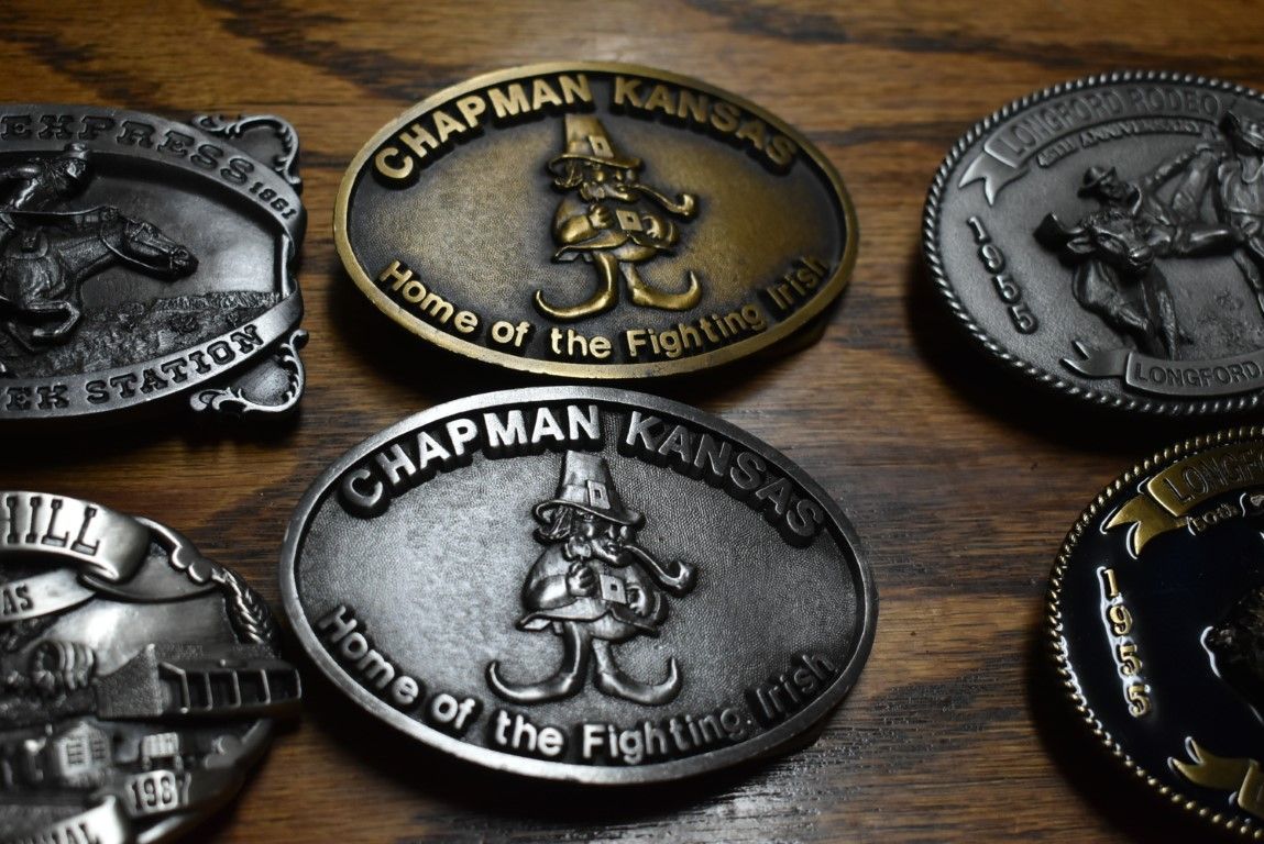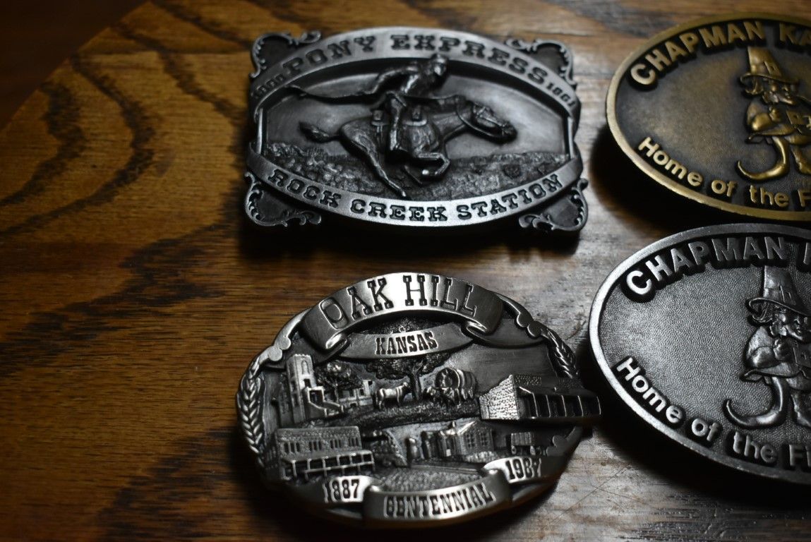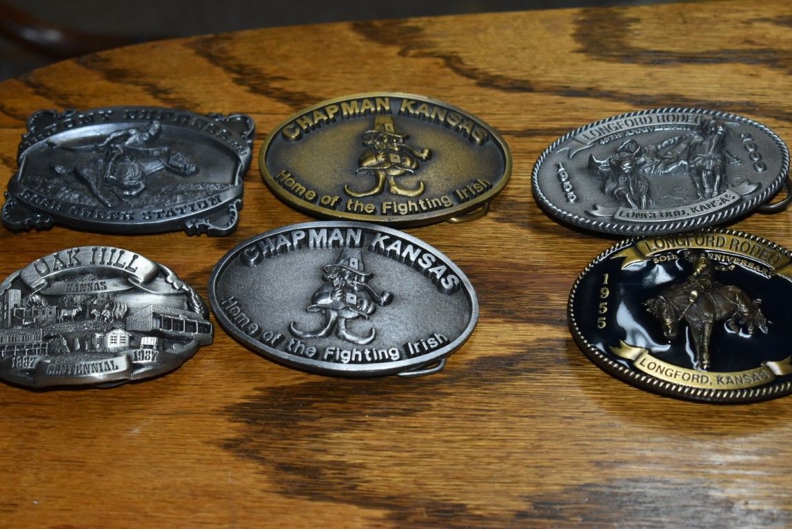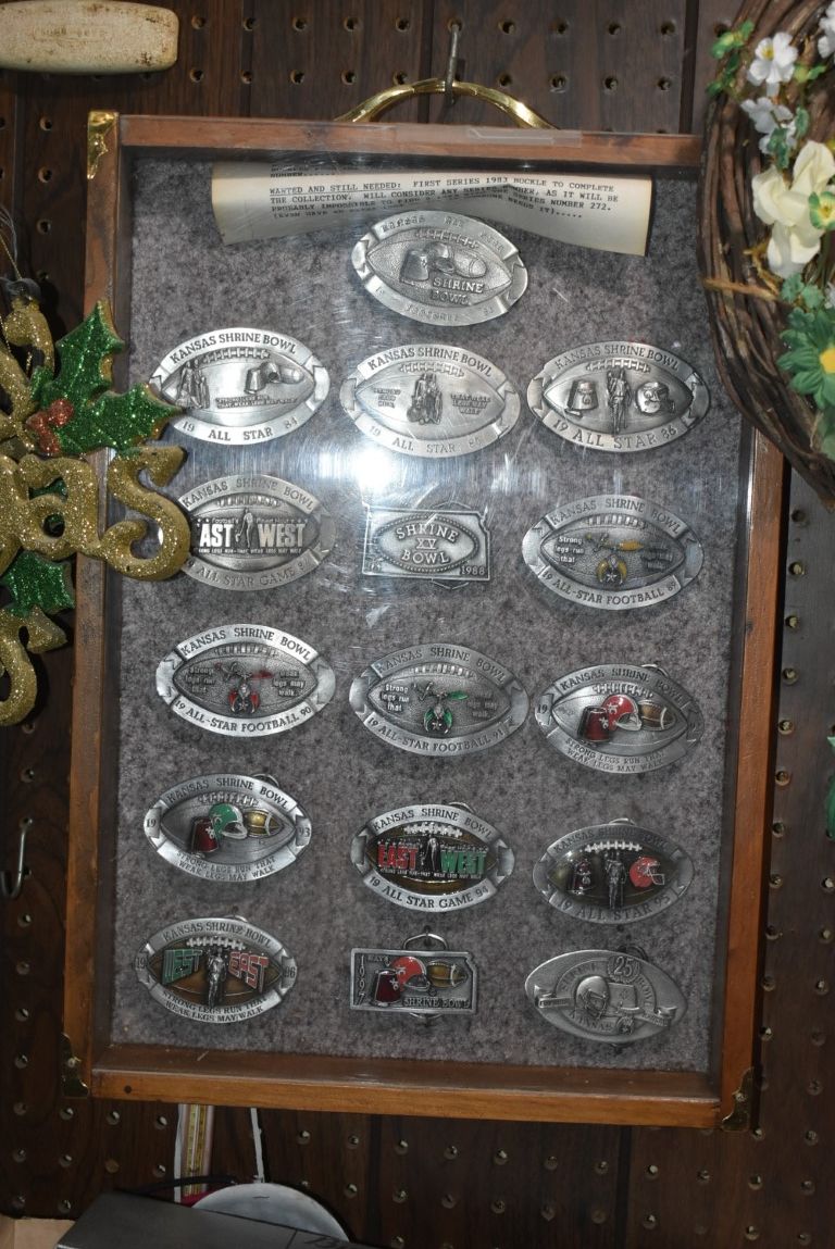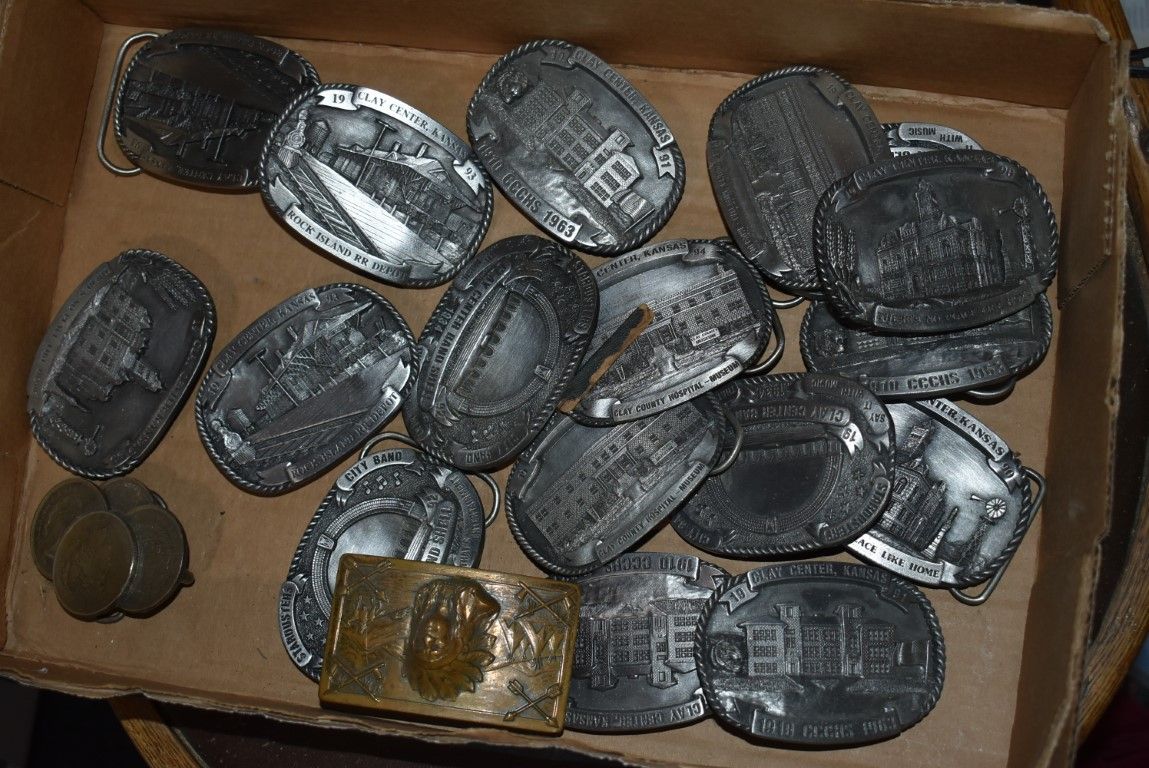 Lots of belt buckles (Hesston, Clay County, Clay Center, Longford rodeo, Chapman, Oak Hill,1860 Pony Express Rock Creek Station, Vietnam, Ks Shrine Bowl set in Shadow Box, And a few more,