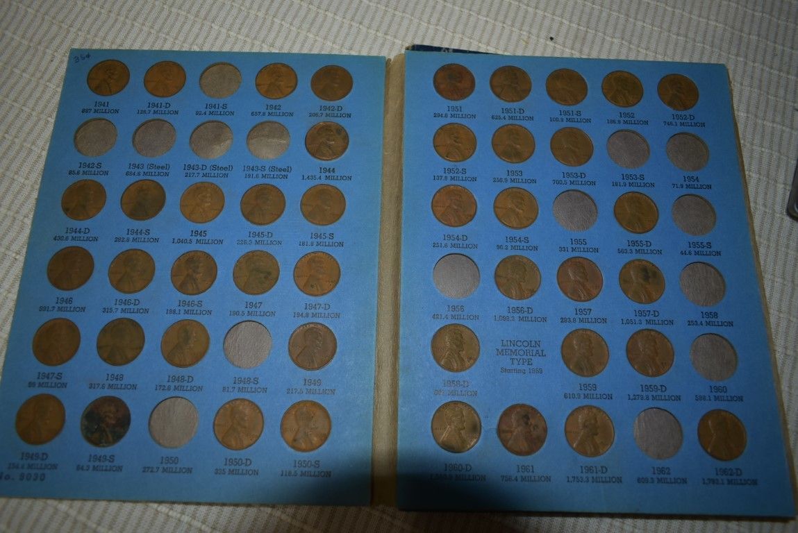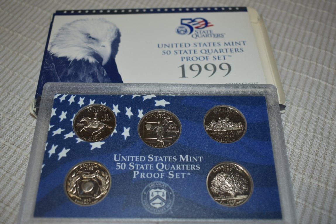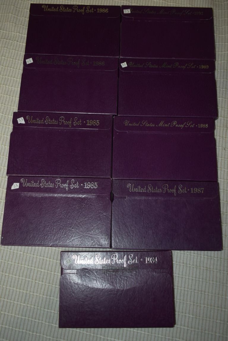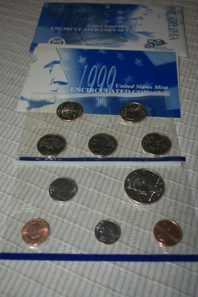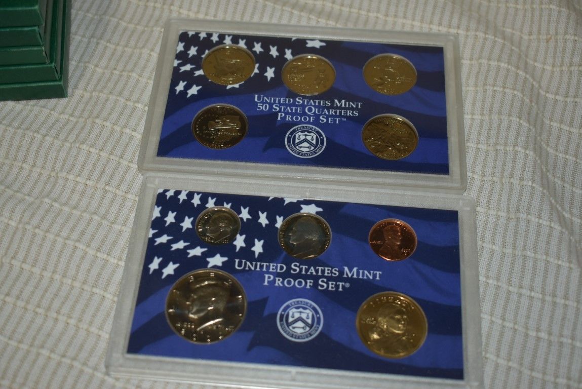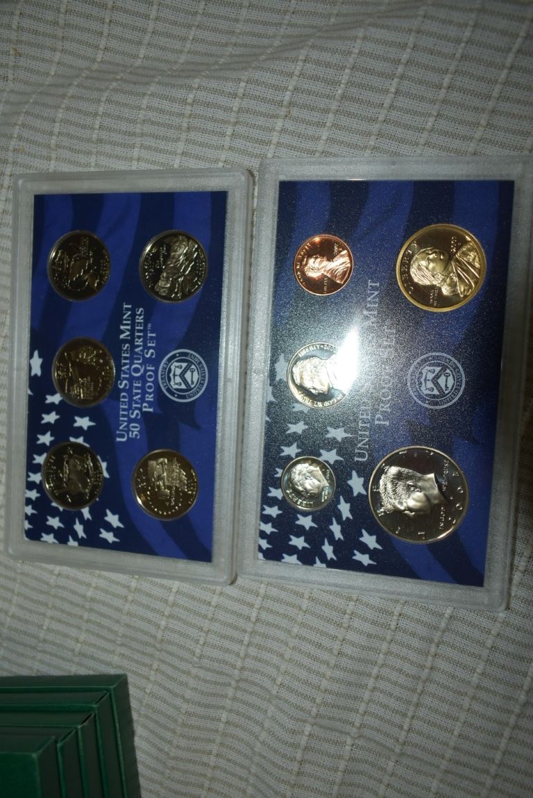 Coins- (3- 1986 Liberty half dollars in case), (2000 thru 2008 50 States Quarters mint proof sets), (1999 thru 2006 US mint proof sets (each year has 5 state quarters & Kennedy half dollar, Sacagawea gold dollar, silver dime, silver nickel, copper penny), (2008 mint proof set of 3, 5 state quarters, 4 Gold presidential dollars, Sacagawea gold dollar-Kennedy half dollar-Roosevelt Dime-Jefferson Nickel-Lincoln Penny), (1984 Proof set Kennedy half dollar-Roosevelt Dime-Jefferson Nickel-Lincoln Penny) (2-1985 blue case Proof sets- Kennedy half dollar-Roosevelt Dime-Jefferson Nickel-Lincoln Penny), (2-1986 Proof sets- Kennedy half dollar-Roosevelt Dime-Jefferson Nickel-Lincoln Penny), (1-1987 proof set - Kennedy half dollar-Roosevelt Dime-Jefferson Nickel-Lincoln Penny),(1-1988 blue case proof set - Kennedy half dollar-Roosevelt Dime-Jefferson Nickel-Lincoln Penny), (1-1989 blue case proof set - Kennedy half dollar-Roosevelt Dime-Jefferson Nickel-Lincoln Penny), (1-1992 Purple case proof set - Kennedy half dollar-Roosevelt Dime-Jefferson Nickel-Lincoln Penny), 5 proof sets 1994 thru 1998 green case - Kennedy half dollar-Roosevelt Dime-Jefferson Nickel-Lincoln Penny), 2-1970 Proof set 2-1971 Proof set 2-1972 proof set 2-1983 proof set blue case Kennedy half dollar-Roosevelt Dime-Jefferson Nickel-Lincoln Penny), 2007 3 case set White box of 4 gold dollars-5 state quarters- Kennedy half dollar-Roosevelt Dime-Jefferson Nickel-Lincoln Penny), (1999 Proof set State quarters Delaware-Penns-New Jersey-Georgia-Conn. Eagle on box), (2009 Quarters proof set District of Columbia), (1999 Uncirculated mint set US Quarters Conn-Georgia-Delaware-Penns-New Jersey & Kennedy half-nickel-dime-penny-P Mint coin), (1999 Uncirculated mint set US Quarters Conn-Georgia-Delaware-Penns-New Jersey & Kennedy half-nickel-dime-penny-D Mint coin), (2-1971 & 1972 Eisenhower Liberty Silver dollars brown box), (1941 to 1962 Lincoln Head Cent-Missing 15 in blue case), (1909 to 1930 blue case only 1915-1916-1919s-1920s-1930 in blue case), (2-1971 Liberty Silver dollar w/Eisenhower Token blue sheath), (1987 gold plated 90% silver coin commemorative Philadelphia mint brown case), (1961 seal of the State of Ks from Governor Frank Carlson in State Envelope), (1986 Statue of Liberty half dollar in blue case), (4 sets-2009 District of Columbia 6 qtrs.- US Mint Presidential 4 $1 dollar coins – 4 2009 Lincoln Pennys- set of 4 Liberty dime, Liberty Nickel, Liberty half dollar & Sacagawea Dollar), (United State Proof sets containing 5 coins-liberty half dollar, Liberty dollar, Liberty Quarter, Liberty Dime, Liberty Nickel & Lincoln Penny 2-1973, 2-1974, 2-1975, 2-1976, 2-1977, 2-1978, 1-1979, 2-1980, 2-1981, 2-1982), (US Mint Proof sets 5 coins 5 coins-liberty half dollar, Liberty dollar, Liberty Quarter, Liberty Dime, Liberty Nickel & Lincoln Penny Purple case 2-1984, 2-1985, 1-1986, 1-1987, 2-1988, 2-1989, 1-1090, 1-1991, 1-1992, 1-1993), (1901 Indian Head penny), (1947 Lincoln Wheat penny),